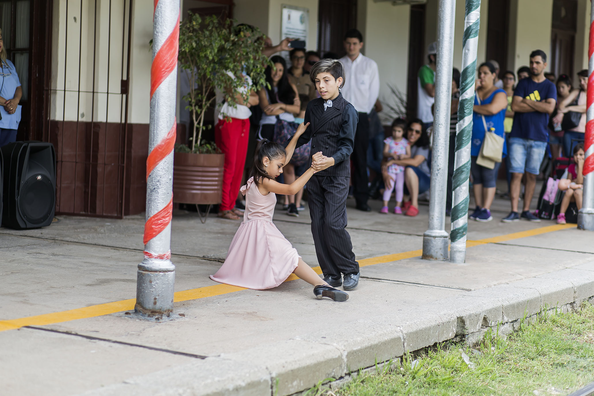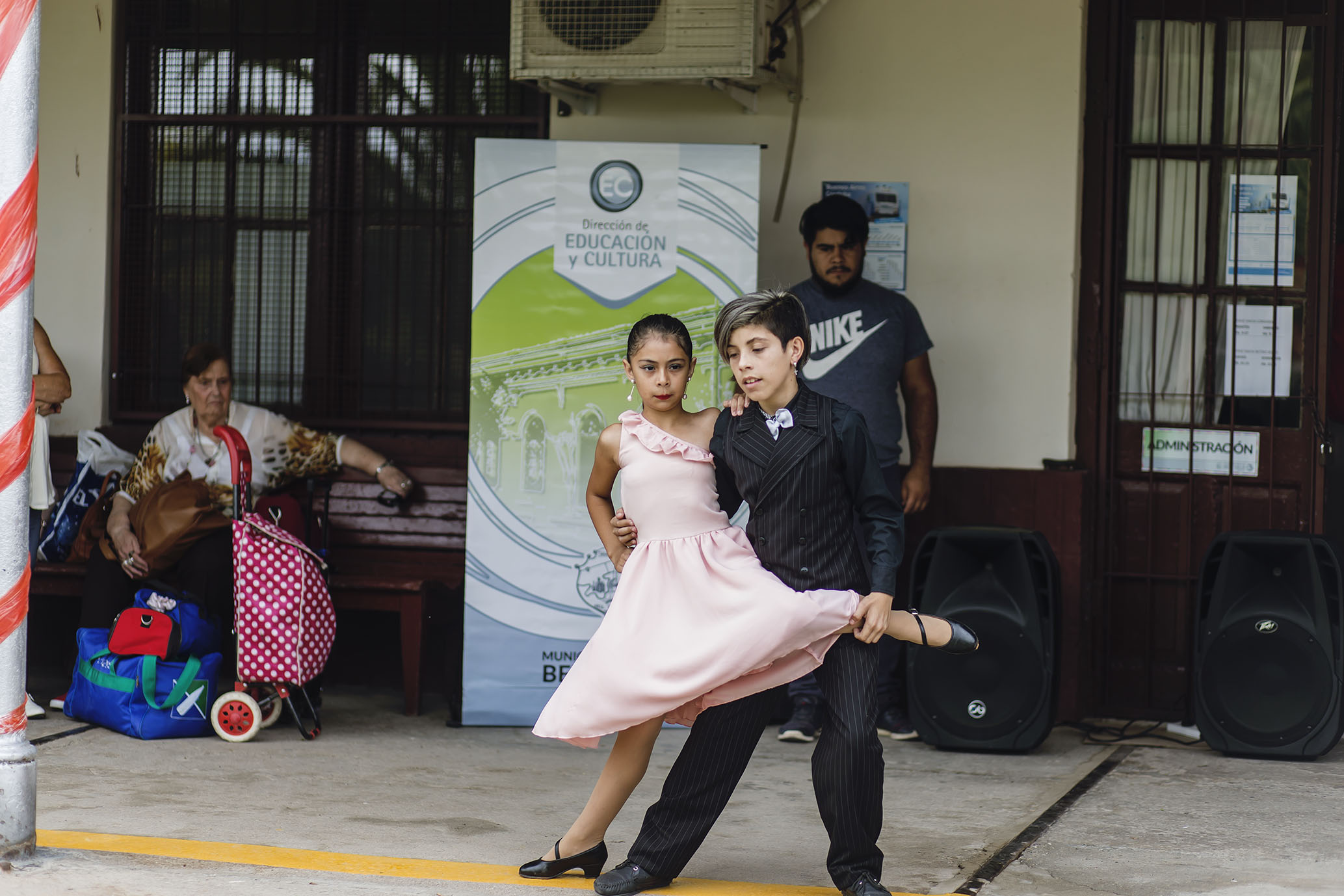 Al ritmo del 2×4, dos alumnos que participan del taller “Cambalache”, con funcionamiento en el Centro Educativo Cultural Municipal a cargo del Profesor Marcelo López, bailaron tango para el numeroso grupo de personas que estaba en el lugar y así, la espera se convirtió en un show muy reconocido por los aplausos.}