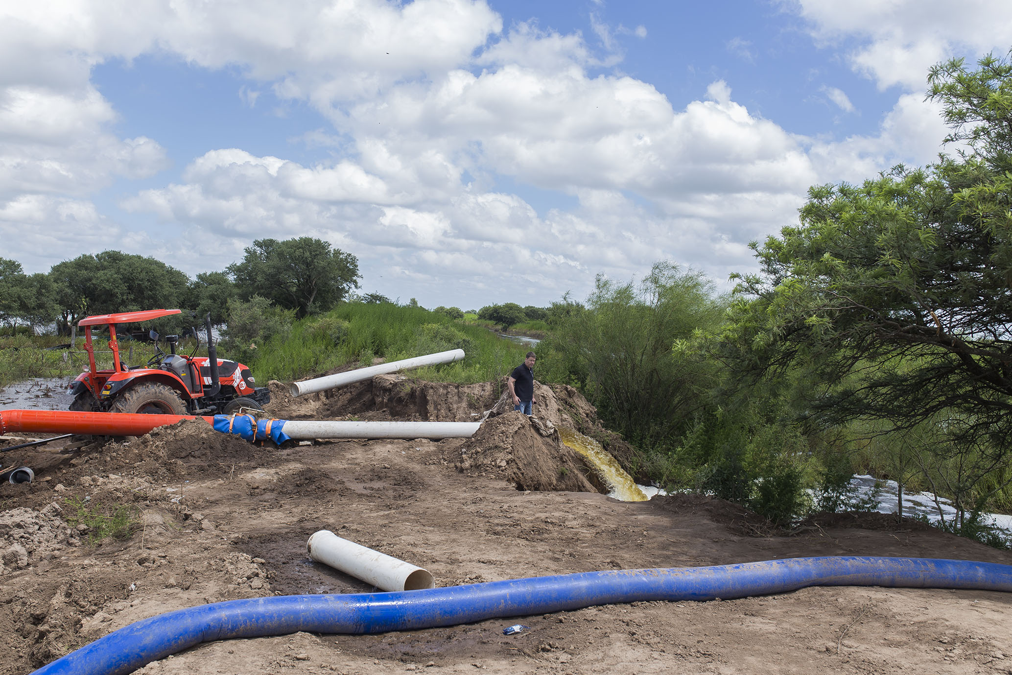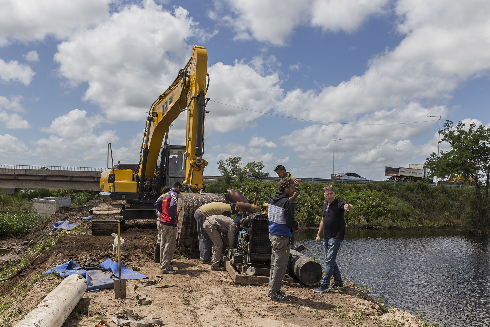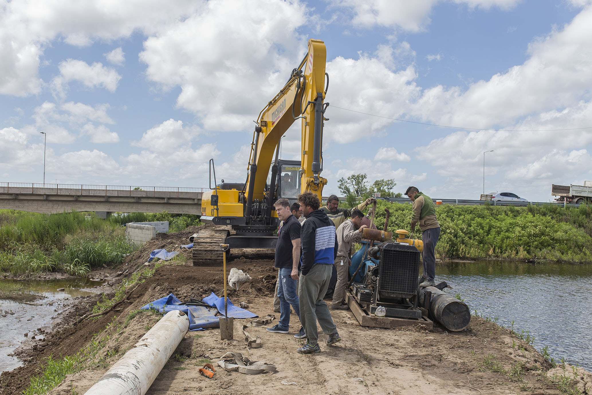 Camiones municipales con escombros y de la empresa APE S.A. con piedras trabajan en la salida del Canal Derivador Oeste.