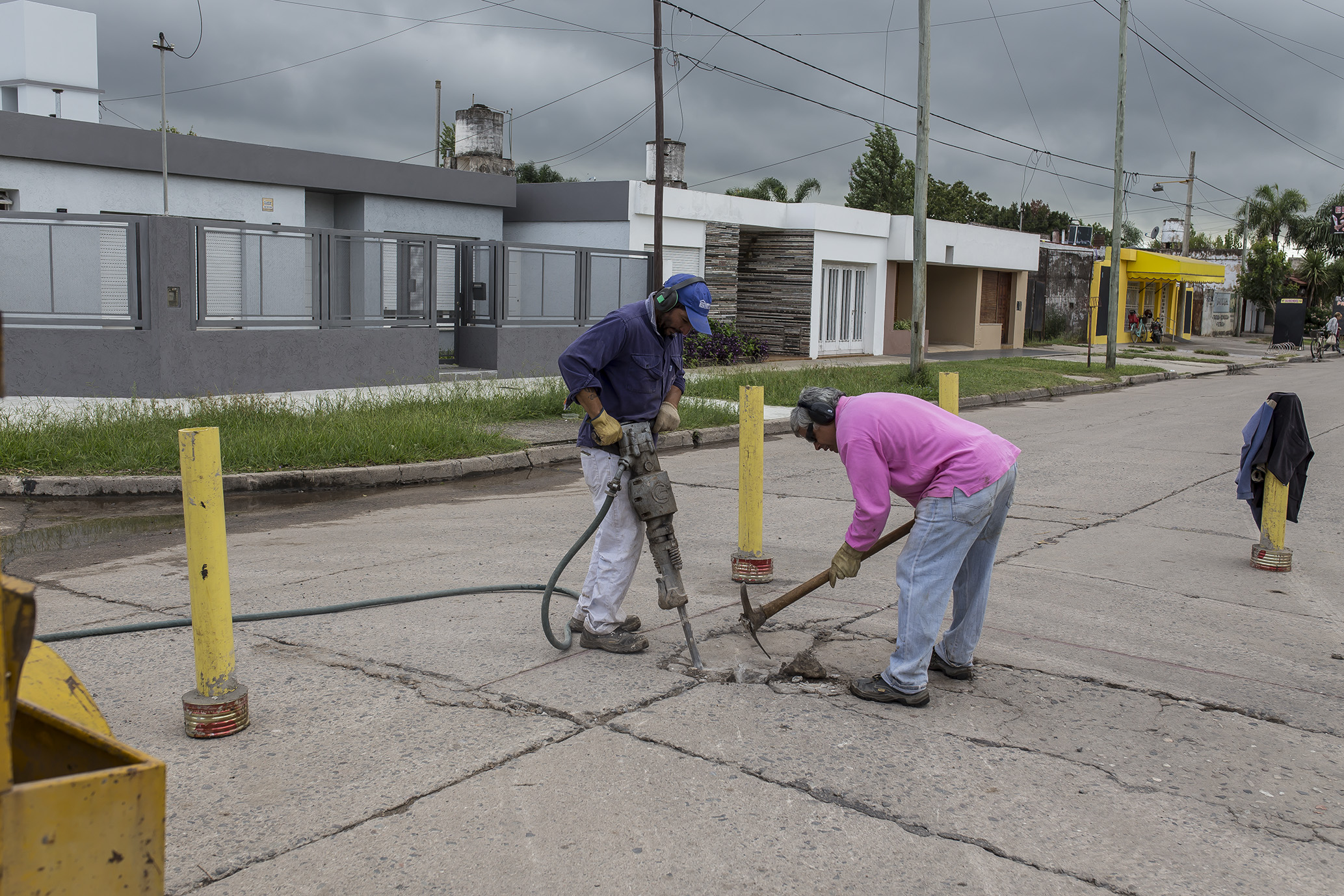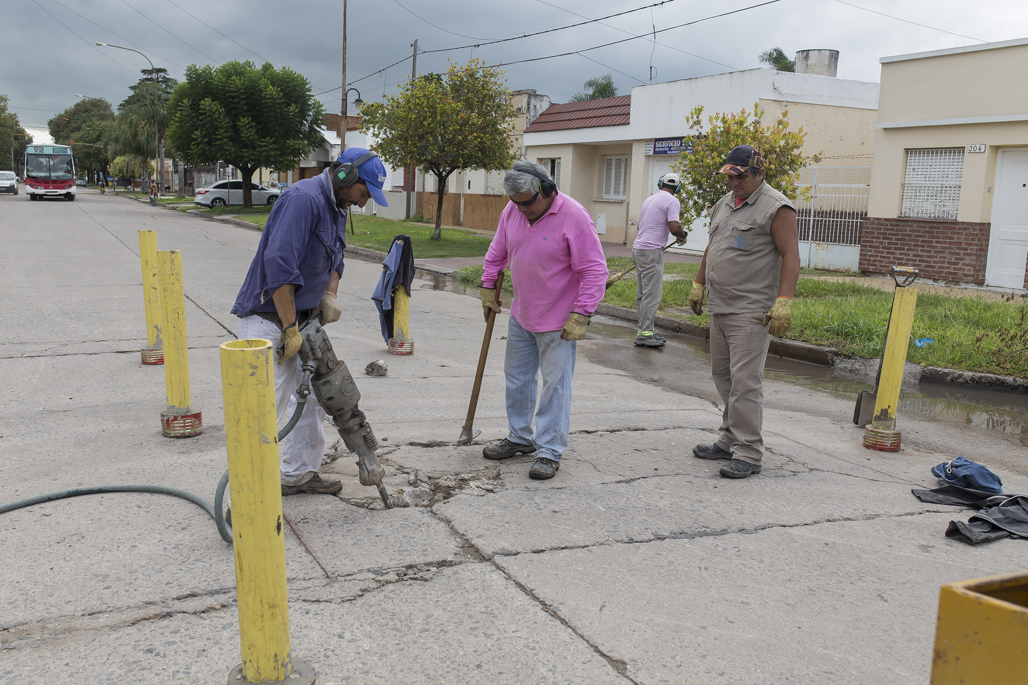 En el bulevar Presidente Perón se trabaja en el bacheo de hormigón. Esta mañana la intervención estuvo en inmediaciones de la calle Rodríguez Peña, removiéndose los sectores dañados para rellenarlos posteriormente con nuevo material.