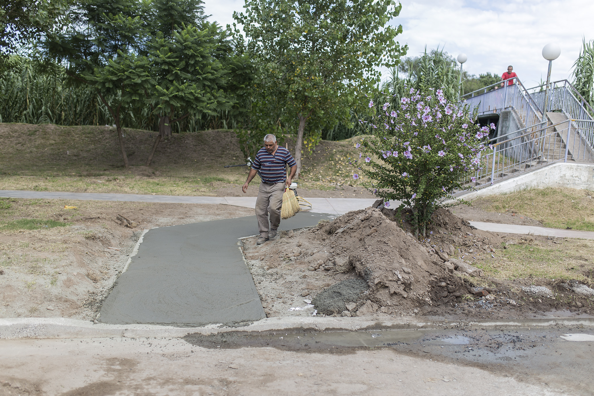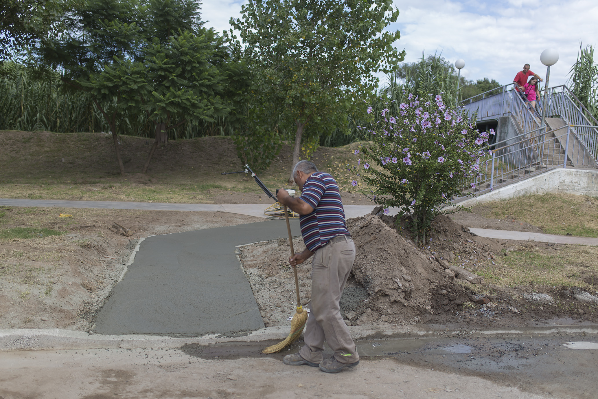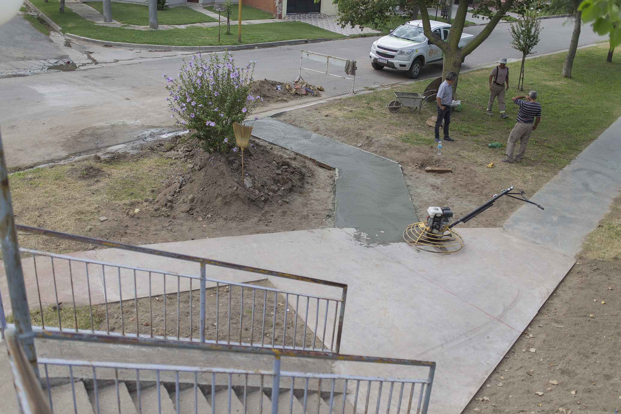 Cuadrillas municipales se encargaron de concluir esta mañana con el hormigonado de la vereda de acceso a la pasarela sobreelevada del lado del Barrio Portal del Río.