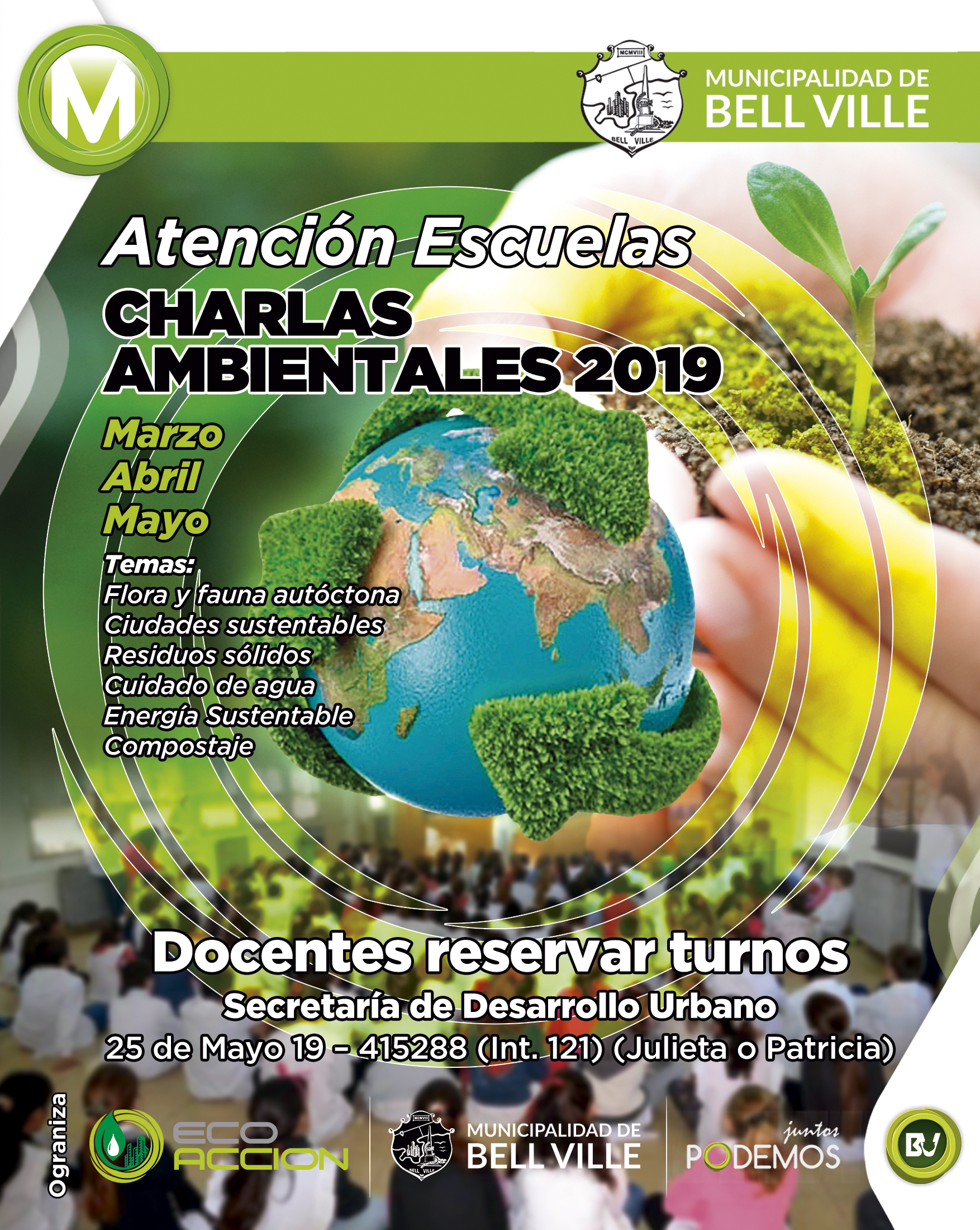 Los días martes y jueves de marzo, abril y mayo, de 08:30 a 09:30, en el salón Walter de Navazio, se dictarán las capacitaciones sobre educación ambiental a estudiantes de niveles primario y secundario.