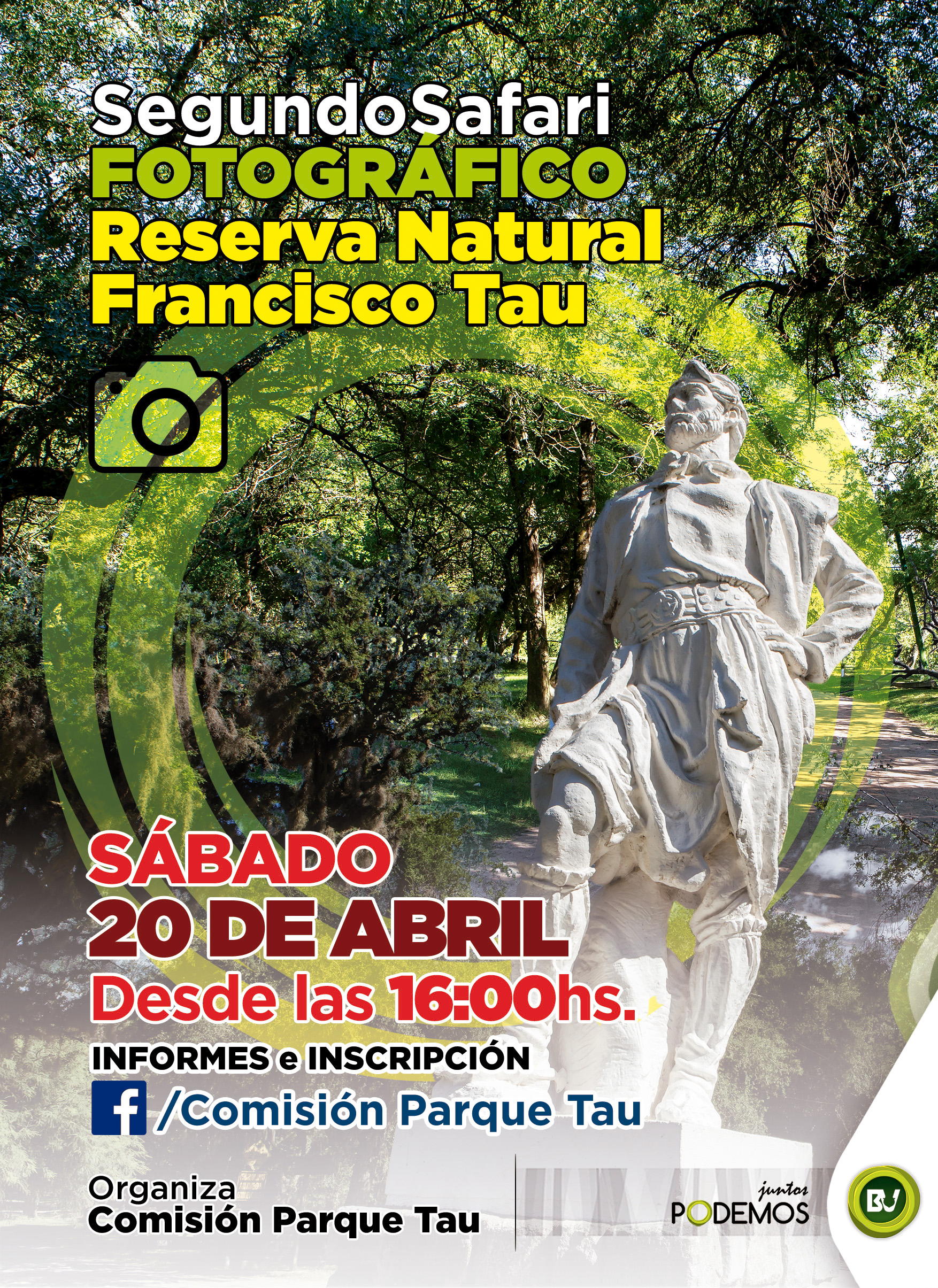 Este fin de semana se desarrollará el segundo SAFARI FOTOGRÁFICO en el Parque Tau. Se tiene previsto comenzar el sábado 20 a las 16 horas en la entrada del Parque. El objetivo de esta jornada es capturar imágenes tomadas en la Reserva Natural, ayudando a difundir sus valores. Se propone a los participantes elegir entre los siguientes temas: Senderos, personas, paisajes, río y seres vivos. La organización aclara que pueden participar todas las personas que estén interesados sin límites y propone que los primeros 30 participantes recibirán un árbol autóctono del Vivero Municipal de regalo. Al finalizar la jornada cada uno de los integrantes de este Safari Fotográfico deberán entregar 3 fotografías al mail comisionparquetau@gmail.com hasta el día 24 de abril inclusive, indicando: Datos personales / Seudónimo / Categoría en la que participa / Tema elegido / Título de la foto. Para mayor información al Facebook/Comisión Parque Tau.