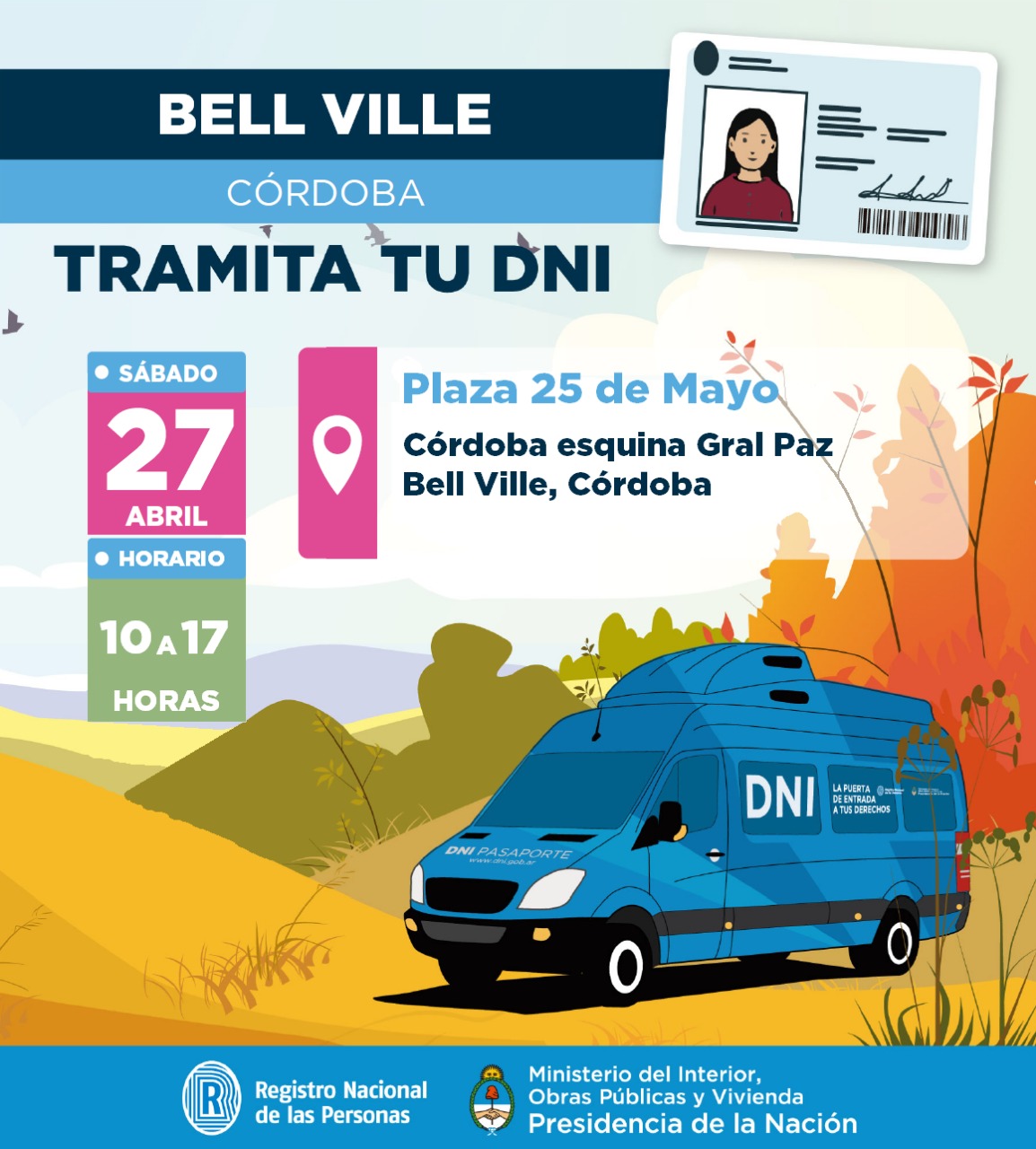 La unidad móvil del Registro Nacional de las Personas (Renaper), organismo dependiente del Ministerio del Interior, Obras Públicas y Vivienda, estará mañana para tramitar el DNI y el pasaporte de forma rápida, sencilla y gratuita a persona mayores de edad. El horario de atención será de 10 a 17 horas en la Plaza 25 de Mayo, intersección de Córdoba y Gral. Paz. Se aclara que no se efectuará ningún trámite a personas menores de edad.