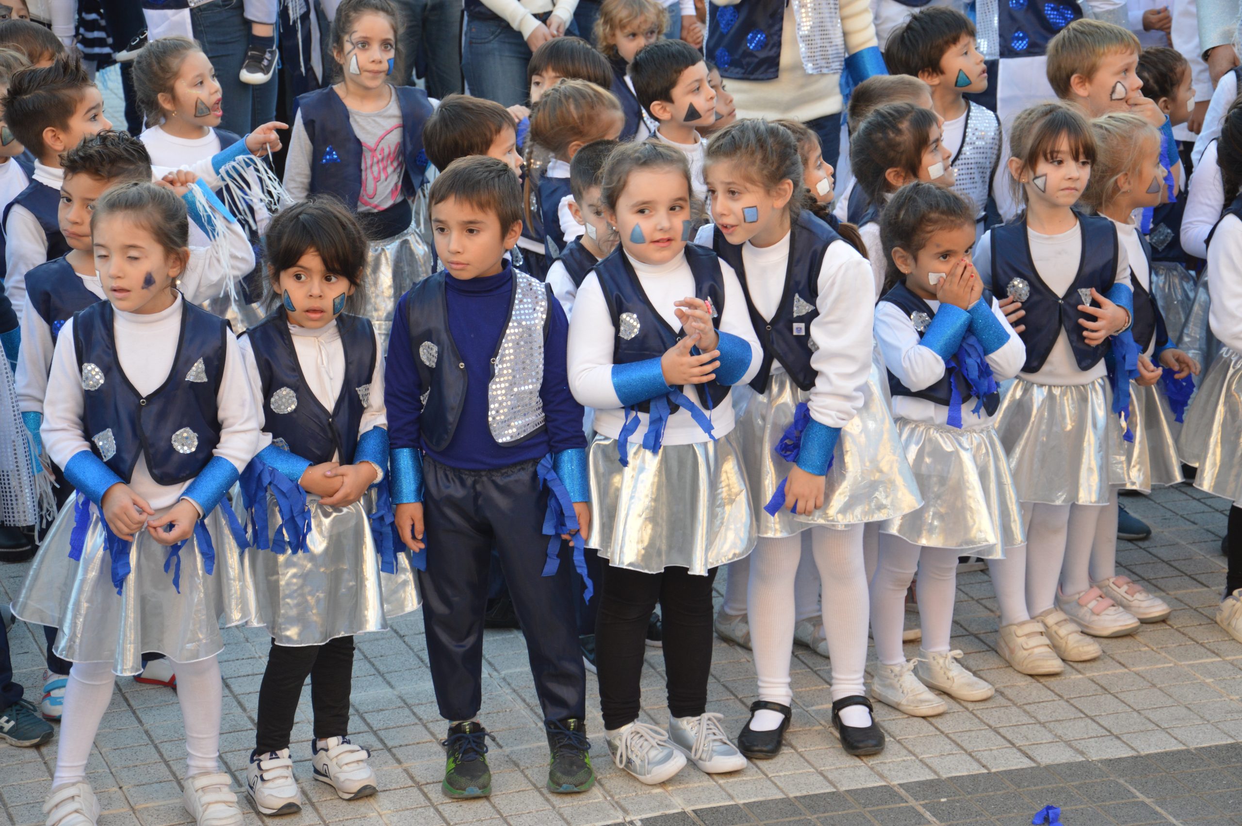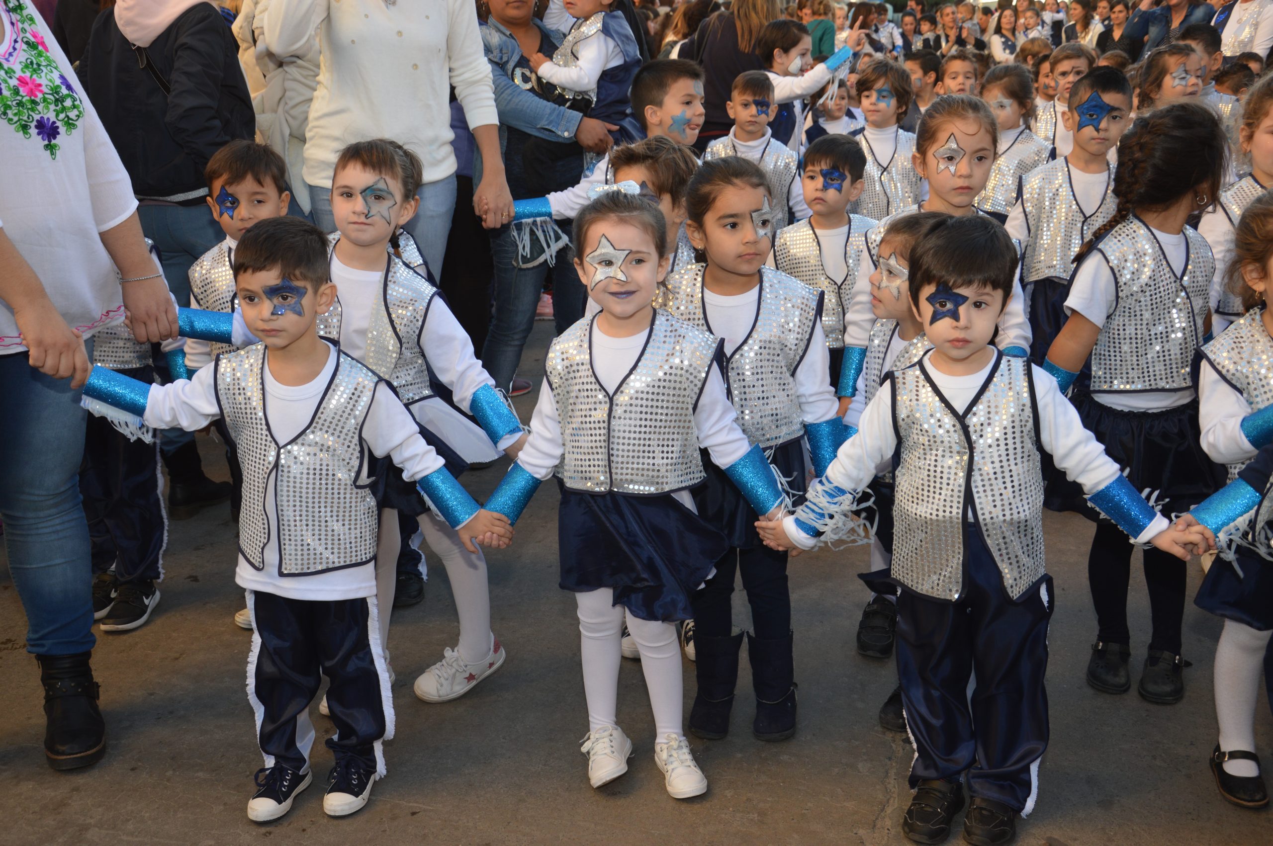 Tras una colorida y muy aplaudida actuación de la murga de las salitas del Jardín de Infantes del establecimiento educativo, comenzó el acto protocolar con el ingreso de las banderas de ceremonia, portadas por los estudiantes de los niveles superior (enseña nacional), secundario (bandera del Ejército de los Andes) y primario (provincia).