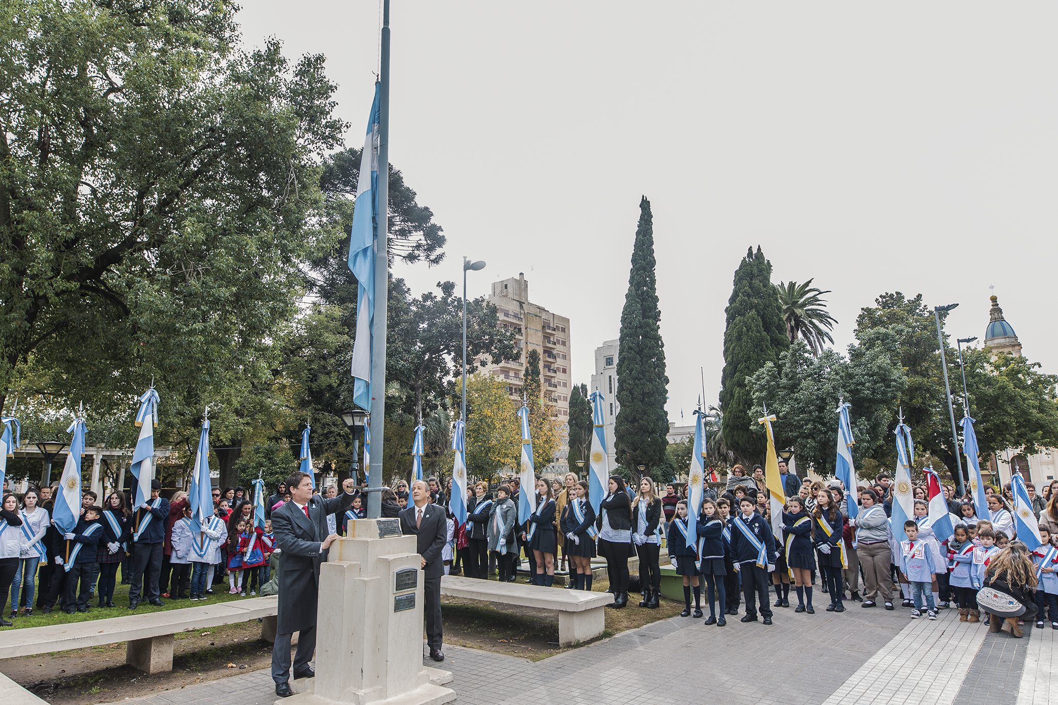 Además, estas instituciones educativas más personal de la Escuela Normal Superior “José Figueroa Alcorta” y Jardín de Infantes “Florentino Ameghino”, por celebrar este año su 110º y 80º aniversario, respectivamente, participaron del izamientos de las banderas de la Nación, Provincia y de Bell Ville, en los mástiles ubicados frente al palacio municipal.
