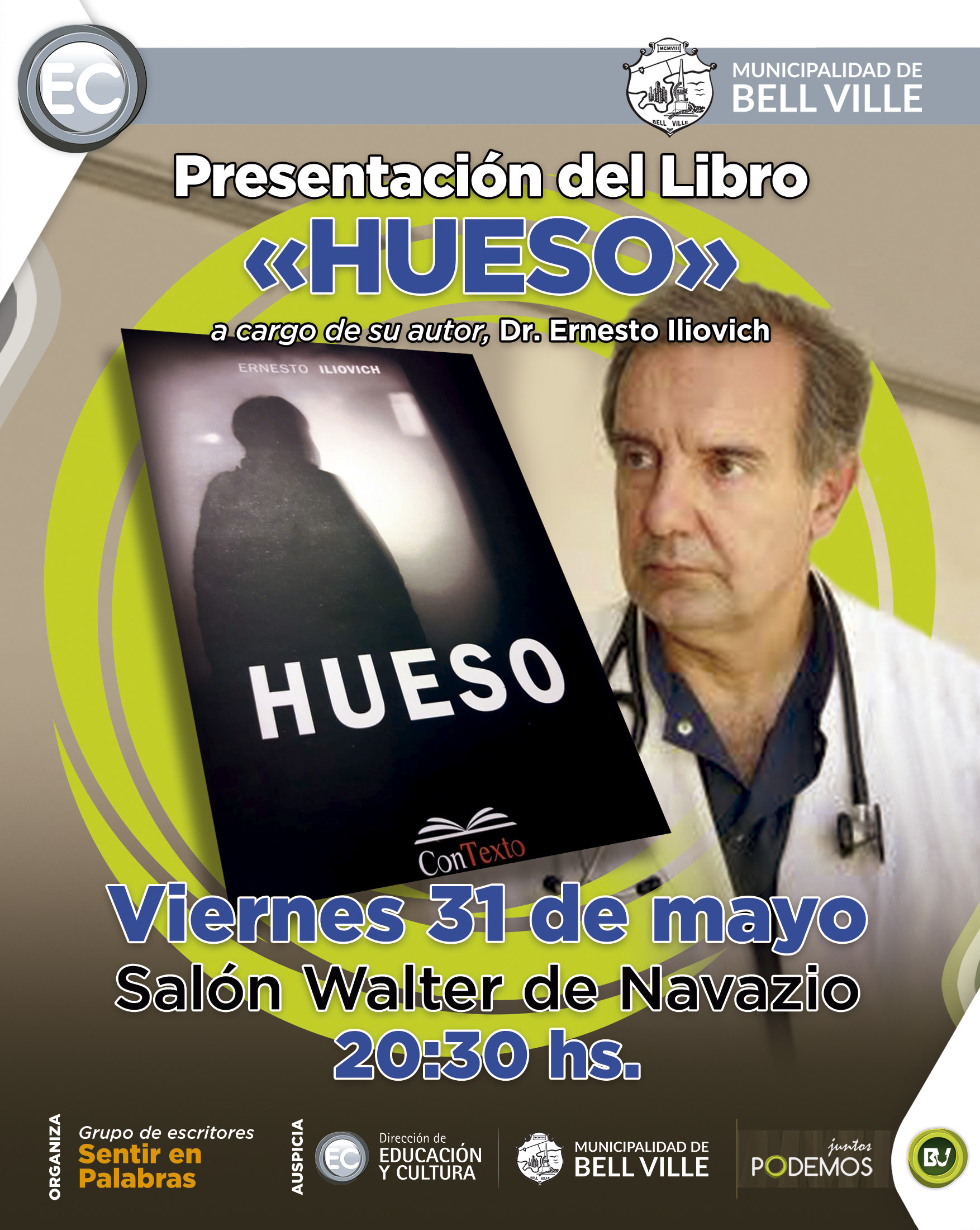 Organizado por el Grupo Literario “Sentir en Palabras”, este viernes a partir de las 20:30 en el salón Walter de Navazio, se presentará el libro “Hueso” del Dr. Ernesto Iliovich.