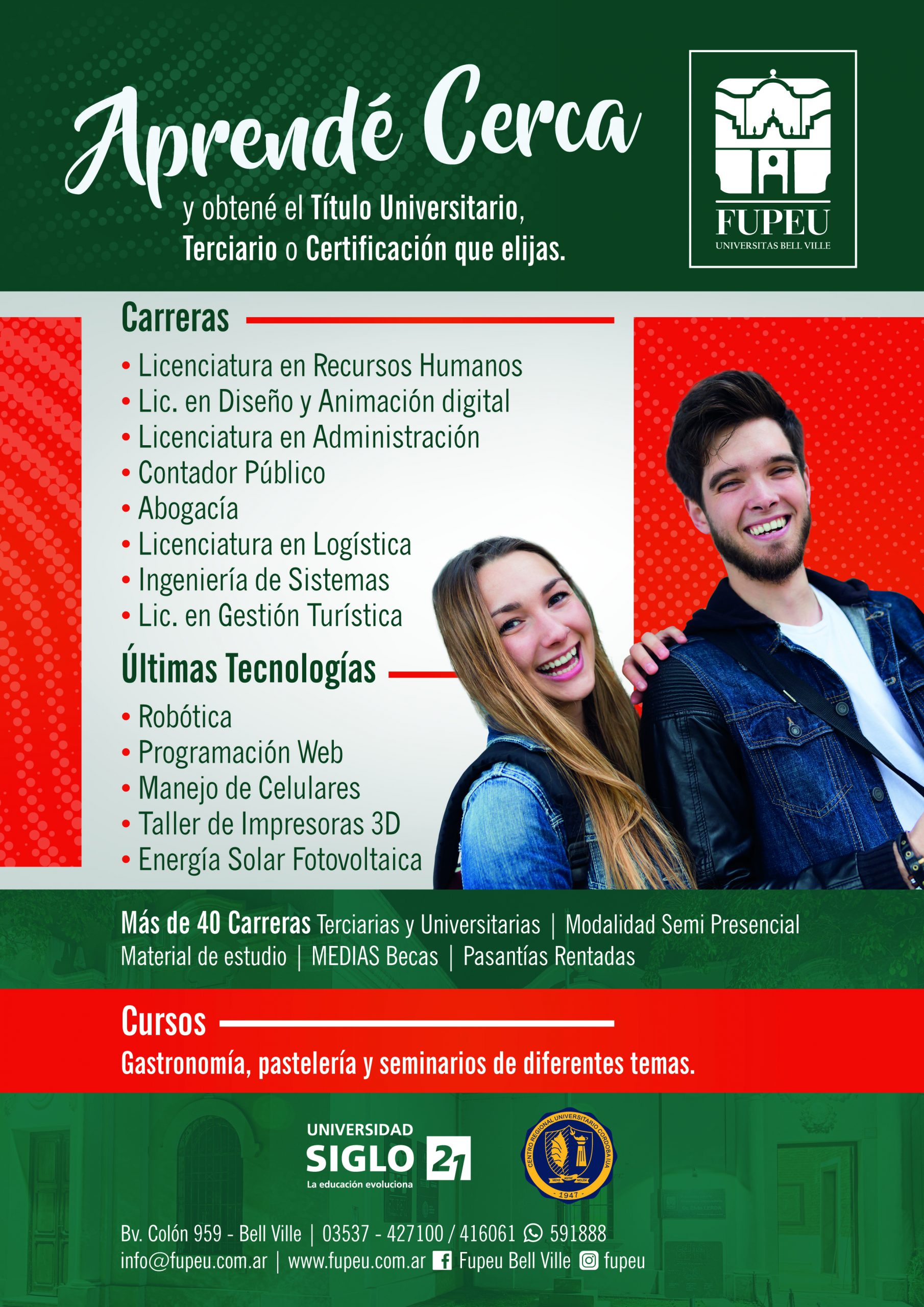 La Fundación para la Enseñanza Universitaria brinda una vasta oferta educativa para Bell Ville y la Zona. Más de 40 carreras terciarias y universitarias con modalidad semi presencial, ofreciendo materiales de educación, medias becas y pasantías rentadas. Las carreras que contiene la institución educativa son: Licenciatura en Recursos Humanos, Licenciatura en Diseño y Animación Digital, Licenciatura en Administración, Contador Público, Abogacía, Licenciatura en Logística, Ingeniería en Sistemas, Licenciatura en Gestión Turística. Además brinda cursos y talleres como Robótica, Programación Web, Manejo de Celulares, Impresoras 3D, Energía Solar Fotovoltaica, Gastronomía, pastelería y seminario de diferentes temas. Para mayor información dirigirse a la sede de la FUPEU, Bv. Colón 959 o telefónicamente a 03537 416061/427100 o WhatsApp 591888 – Facebook – E-Mail: info@fupeu.com.ar