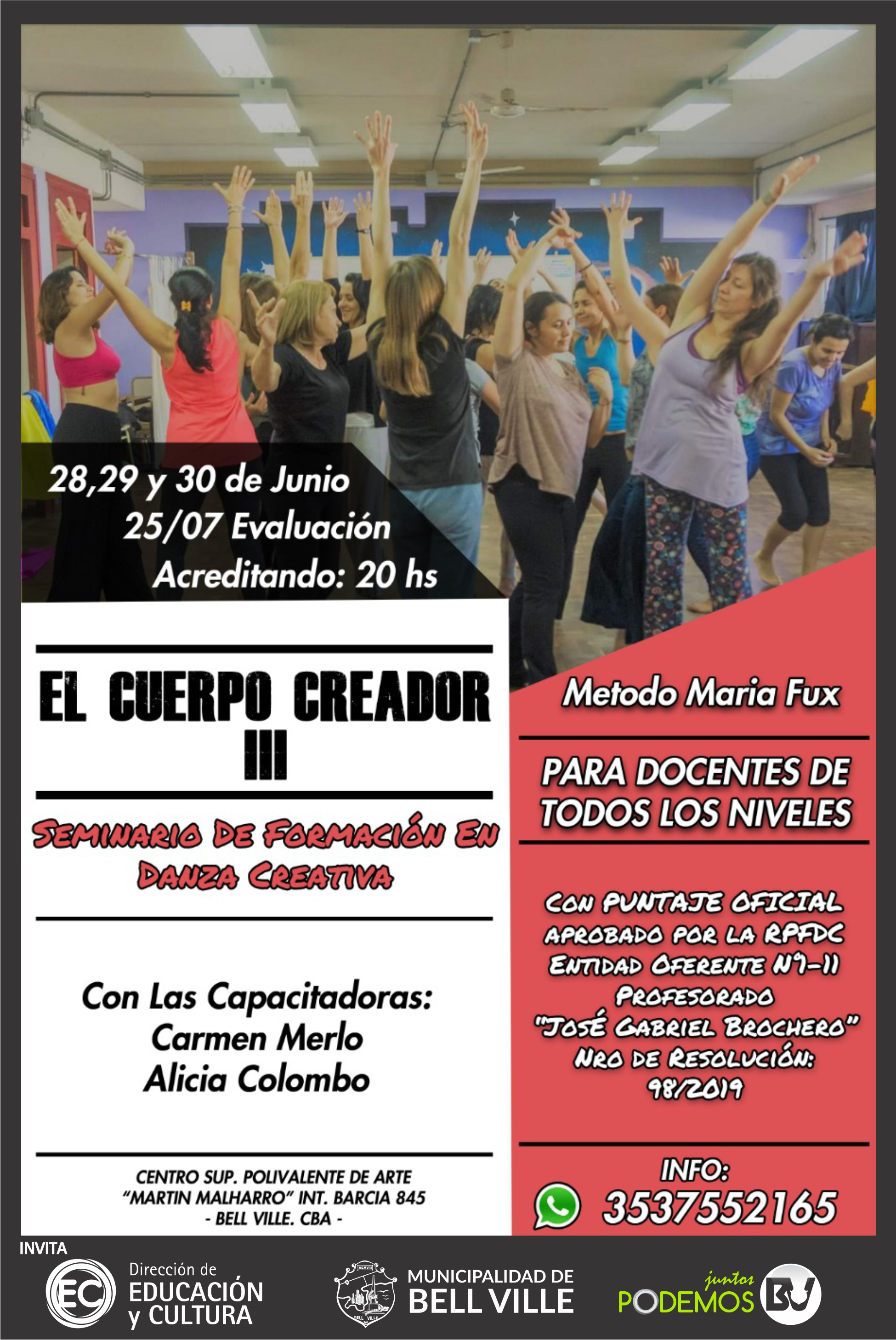 El Seminario de Danza Creativa “El Cuerpo Creador III”, continuando las propuestas de los Seminarios I y II, ampliará el aspecto didáctico a partir de los aportes de Laban y Fux propiciando la aceptación del propio cuerpo, y el distanciamiento de los estereotipos, que muchas veces la sociedad y nuestra cultura imponen como modelo a seguir, tales como cuerpos esbeltos, estilizados y dotados de condiciones naturales. En la actualidad, aún se cree que sólo puede bailar el que está habilitado por sus aptitudes físicas, y no aquel que desea o disfruta al hacerlo, sea éste, hombre, mujer, joven, adulto, en sillas de ruedas o sin ella. También brindará a los profesionales de la educación, del arte y de la salud, otras herramientas para descubrir las propias capacidades creativas, estimular la imaginación, descubrir las posibilidades de movimiento explorando el espacio, comunicarse con los otros.