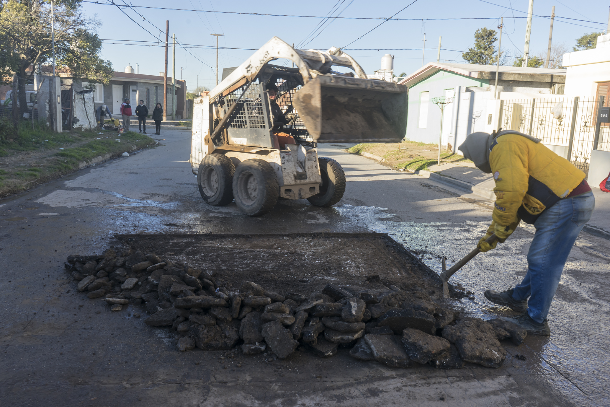 En la tarea constante de reparación de calles, se continúa también con el bacheo con asfalto en caliente.