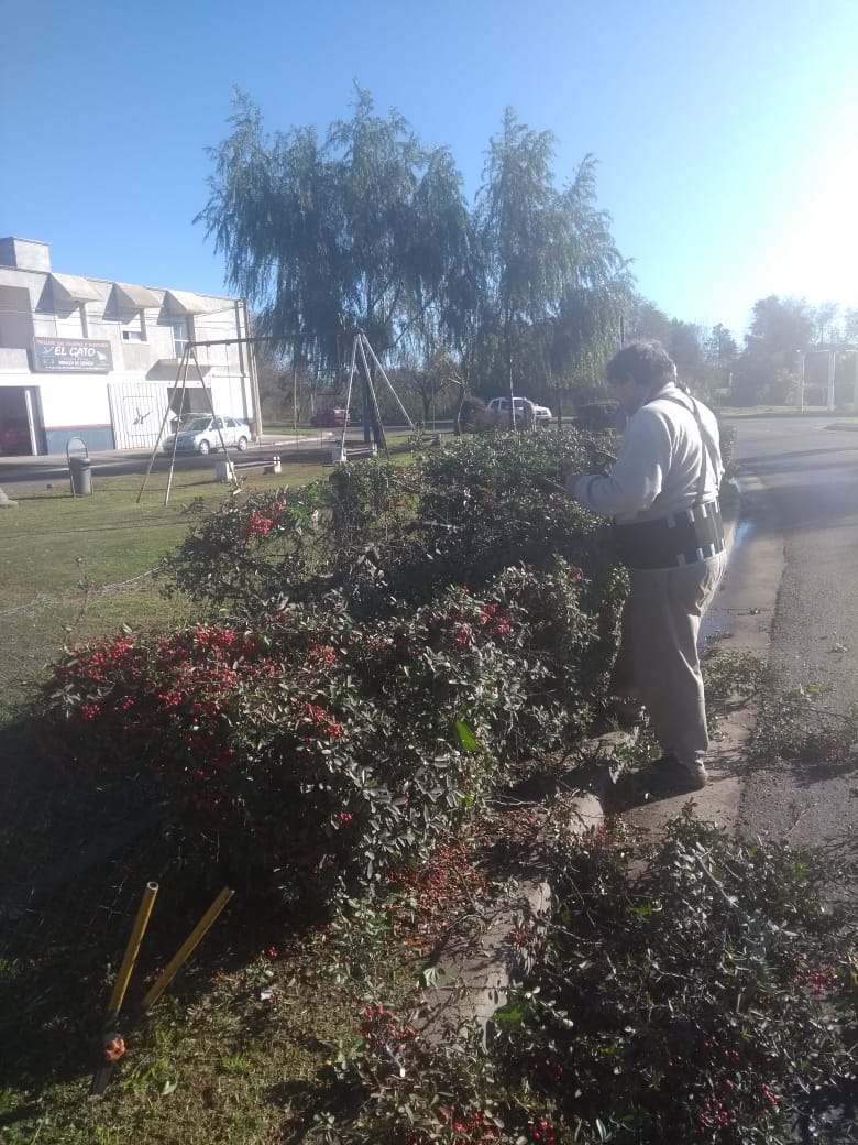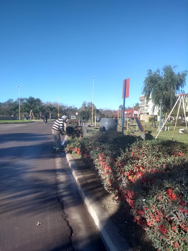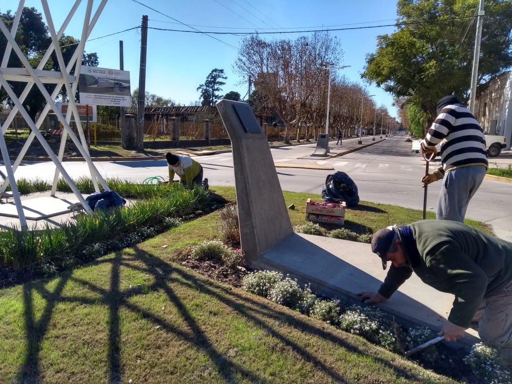 Tareas de poda, limpieza, ordenamiento y colocación de plantines son las tareas.Poda en puente de la historia, en jardín interno del palacio municipal…en puente sarmiento… reposición de plantines en rotonda de la pelota de fútbol y ferrocarril y pintura en muros de acceso a puente de la historia.