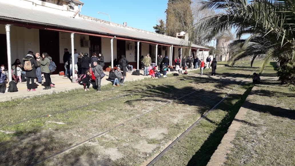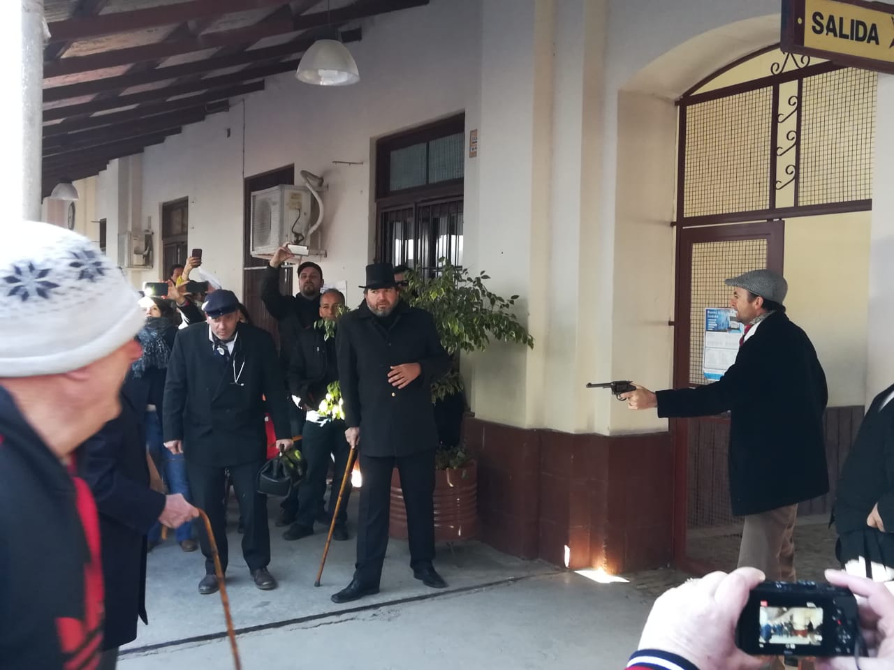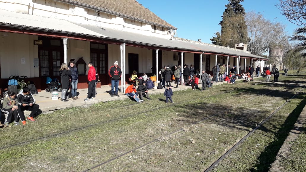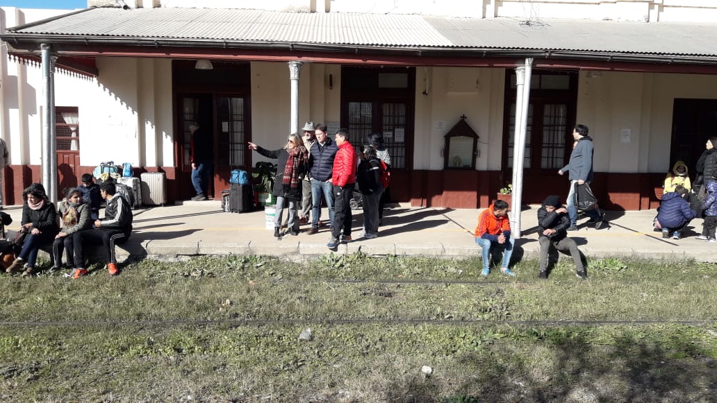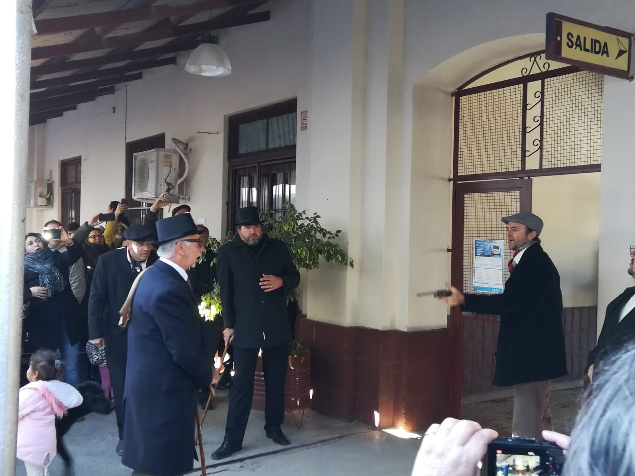 Mientras aguardaban el arribo de la formación férrea, los pasajeros a partir, acompañados de sus familias se vieron sorprendidos por once personajes de “otra época” quienes fueron ocupando sus lugares.