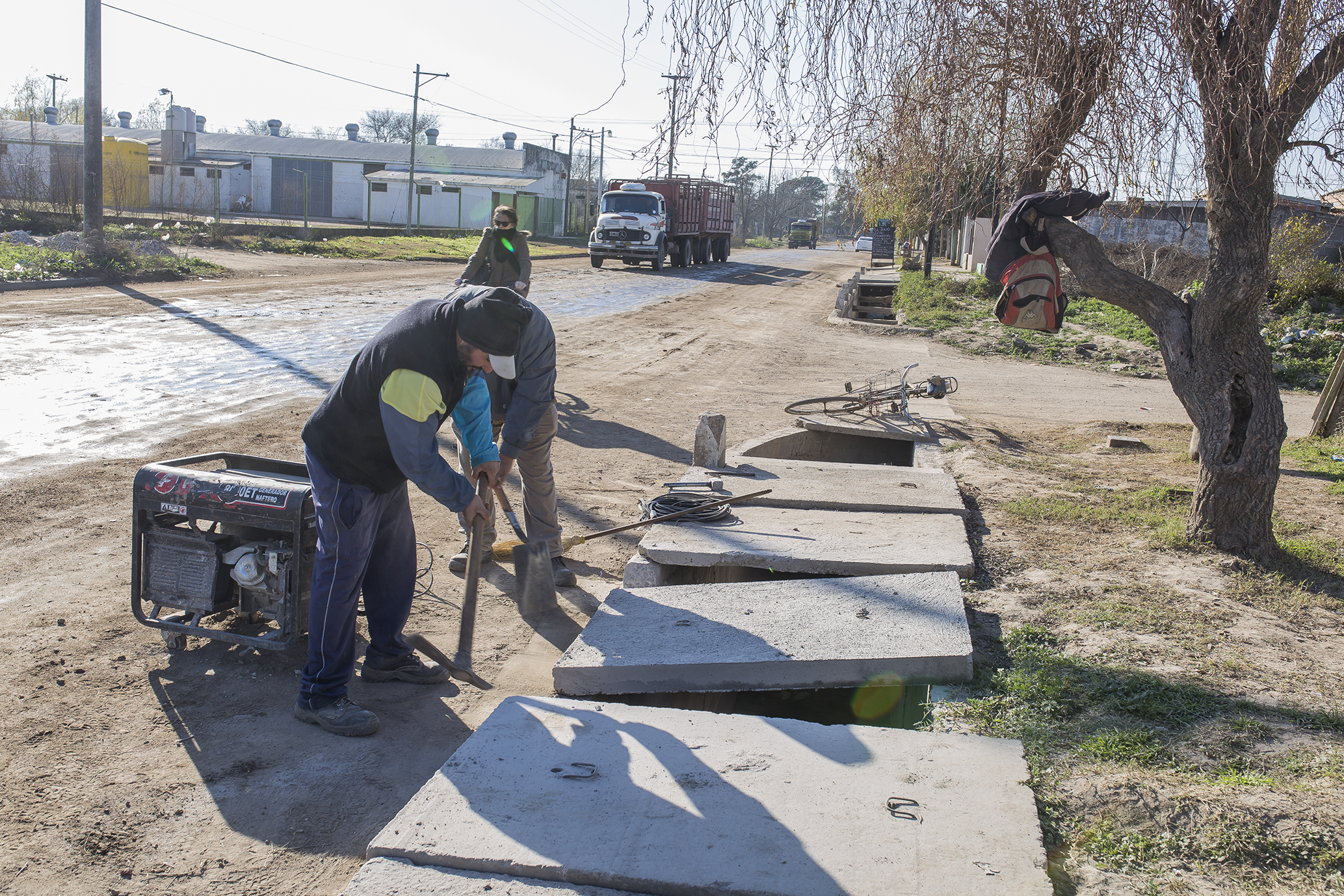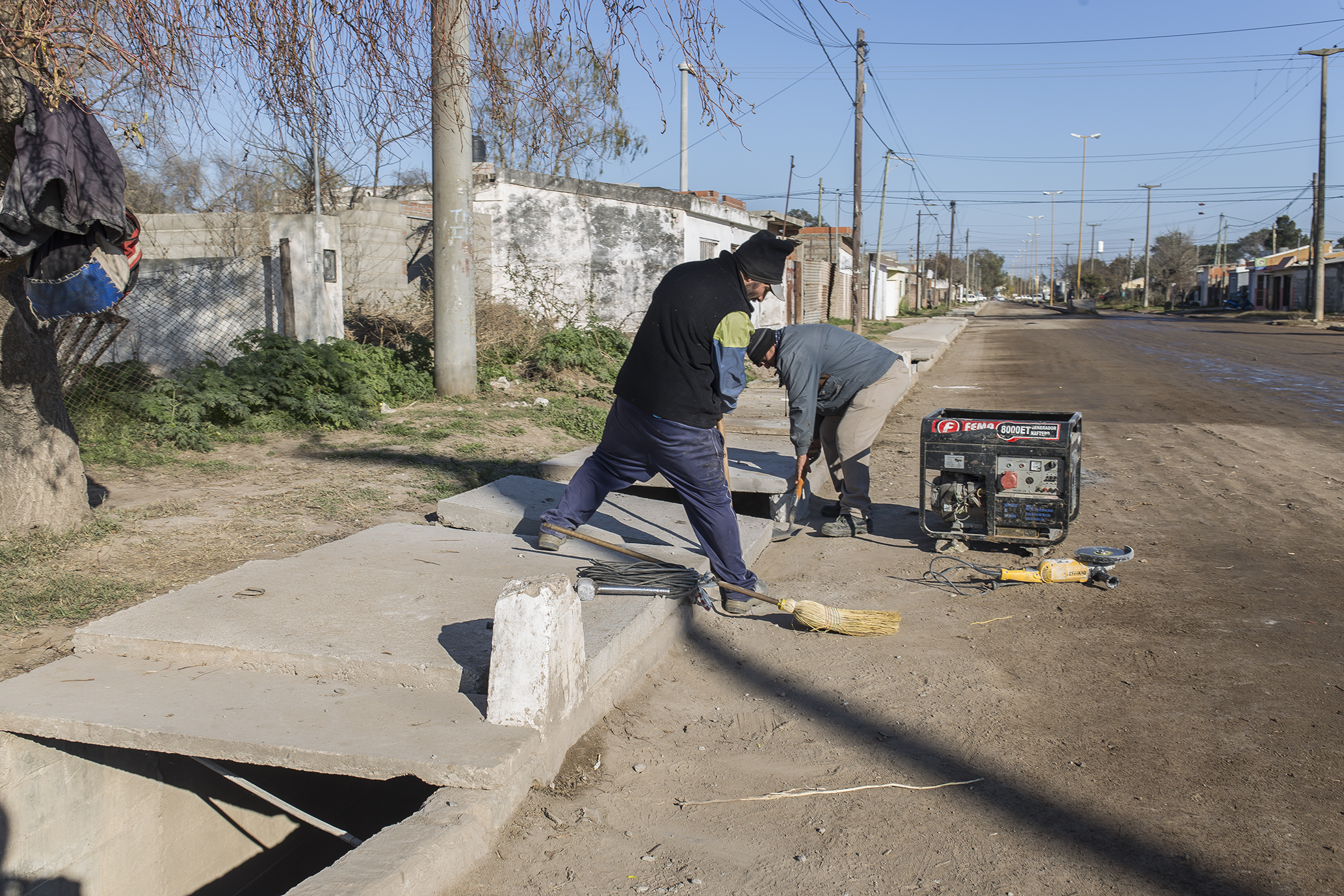 A medida que se van confeccionando se siguen colocando las tapas sobre el canal de desagüe en el bulevar Eva Perón.