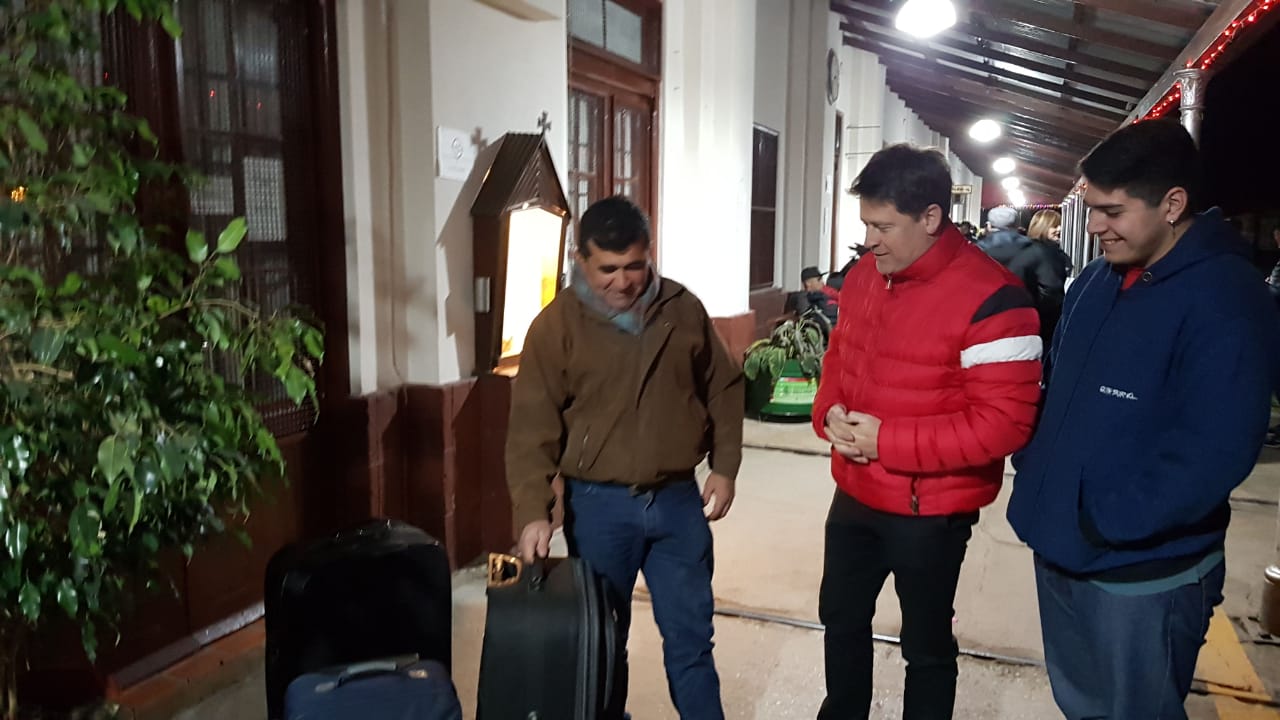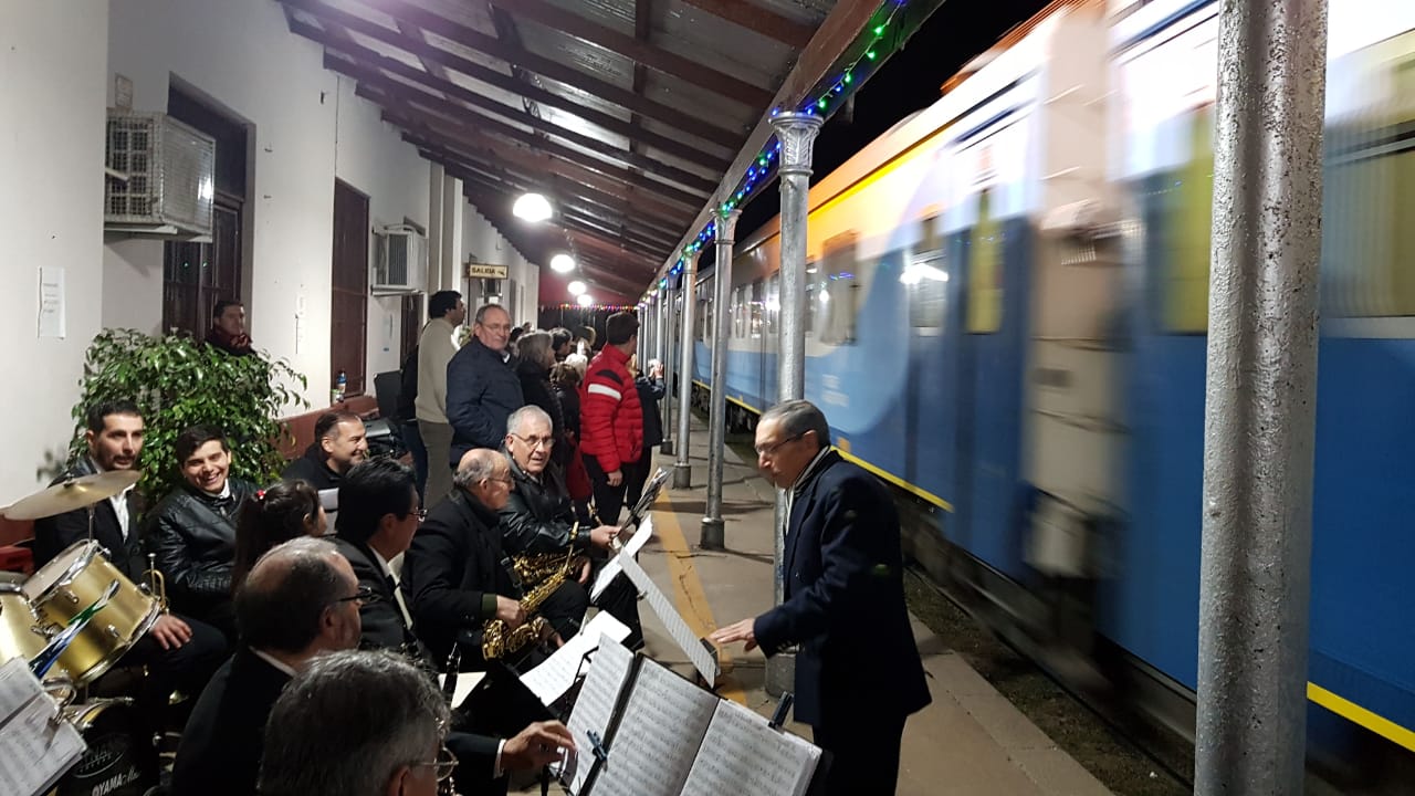 El frío reinante no impidió que la Orquesta Vocacional del Reencuentro cumpliera con su concierto en el andén del ferrocarril, en el momento que la formación se detenía para el ascenso y descenso de pasajeros.