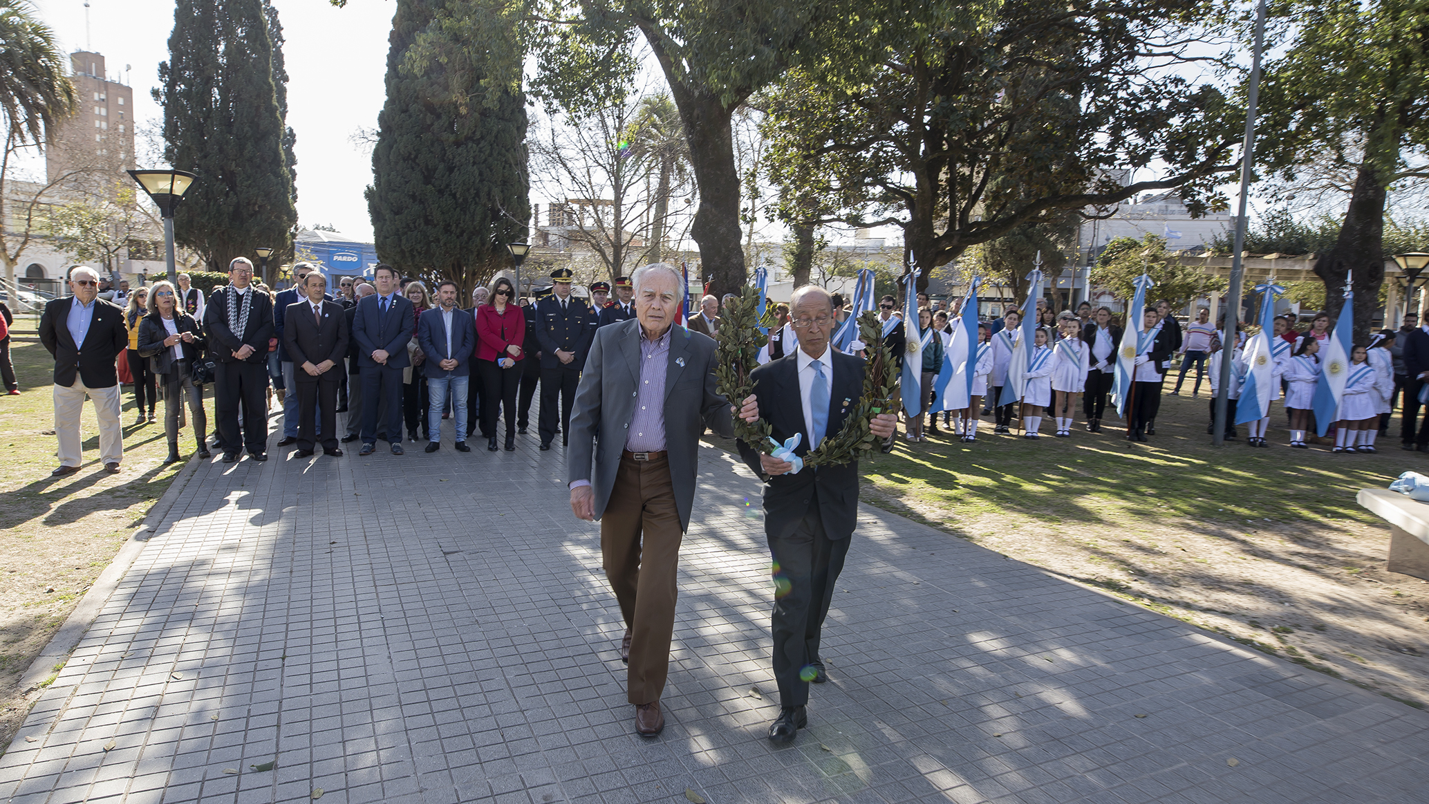 Autoridades encabezadas por el intendente, Dr. Carlos Briner, jefes policiales, bomberiles, veteranos de Malvinas, representantes de instituciones del medio, invitados especiales, abanderados, escoltas, docentes y numeroso público, siguió con atención el acto conmemorativo.
