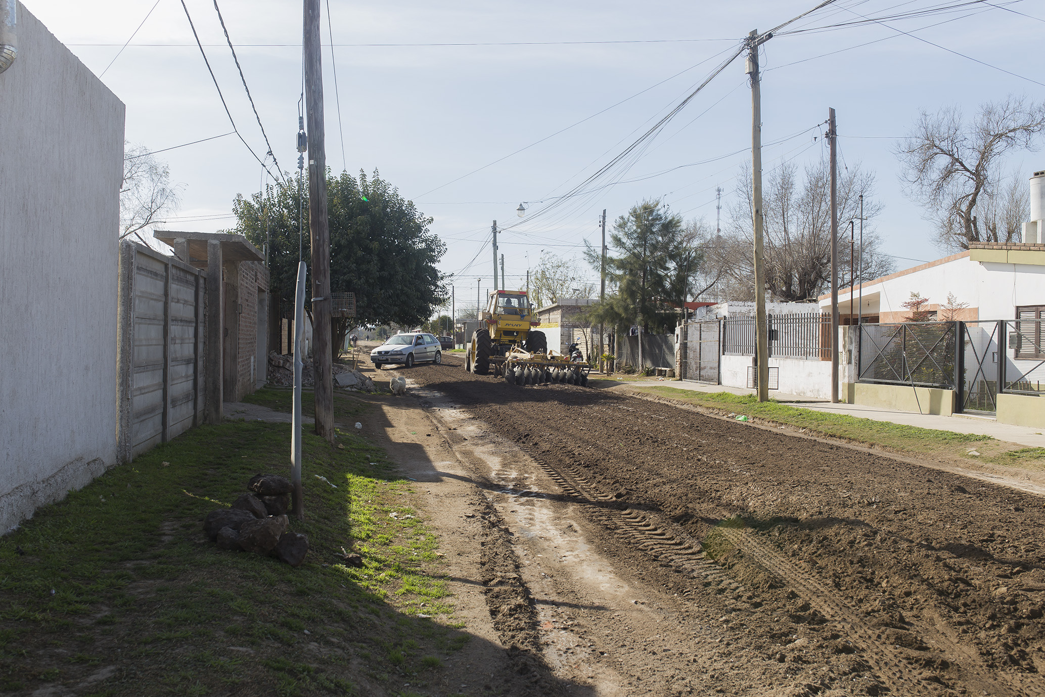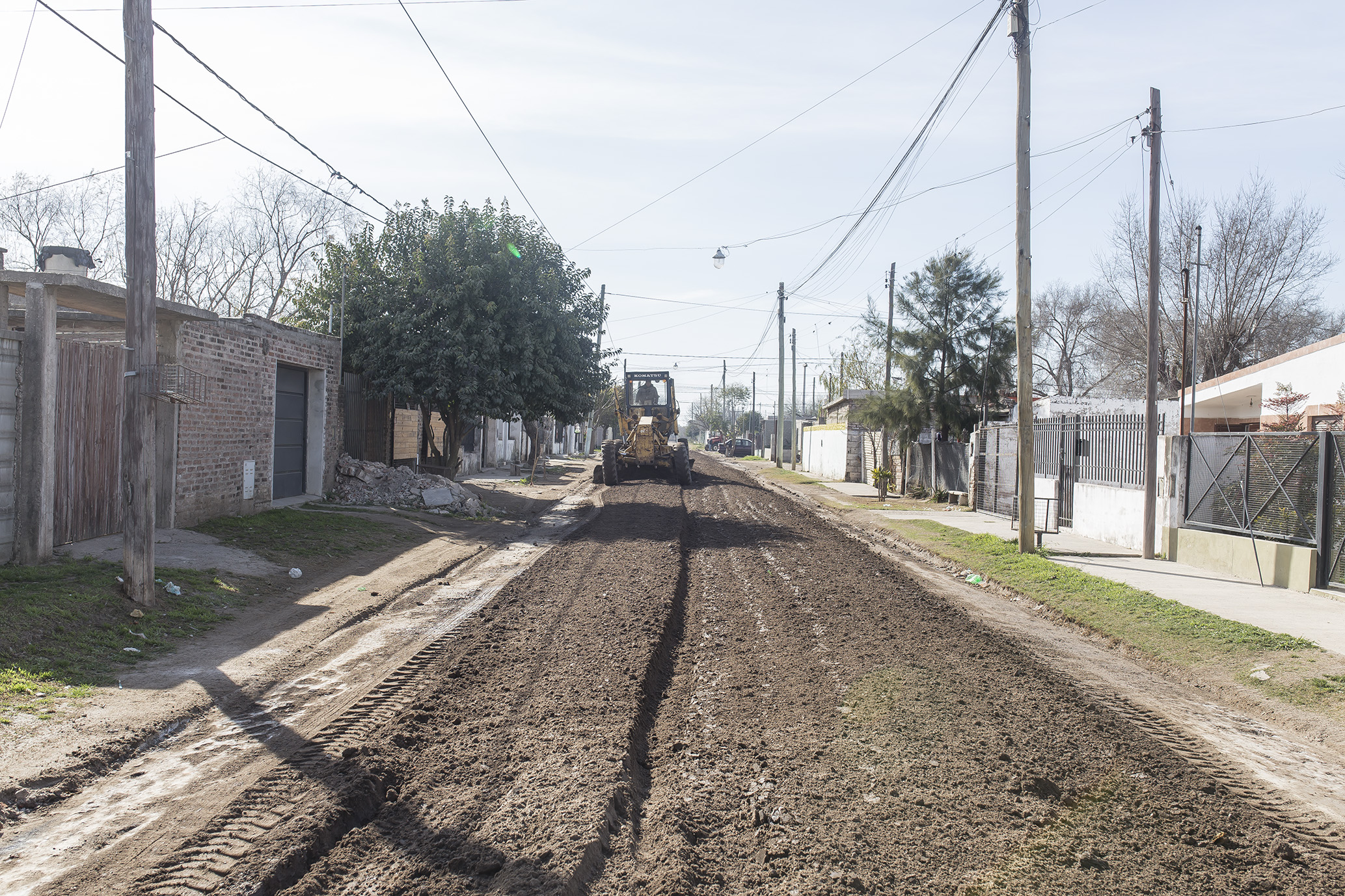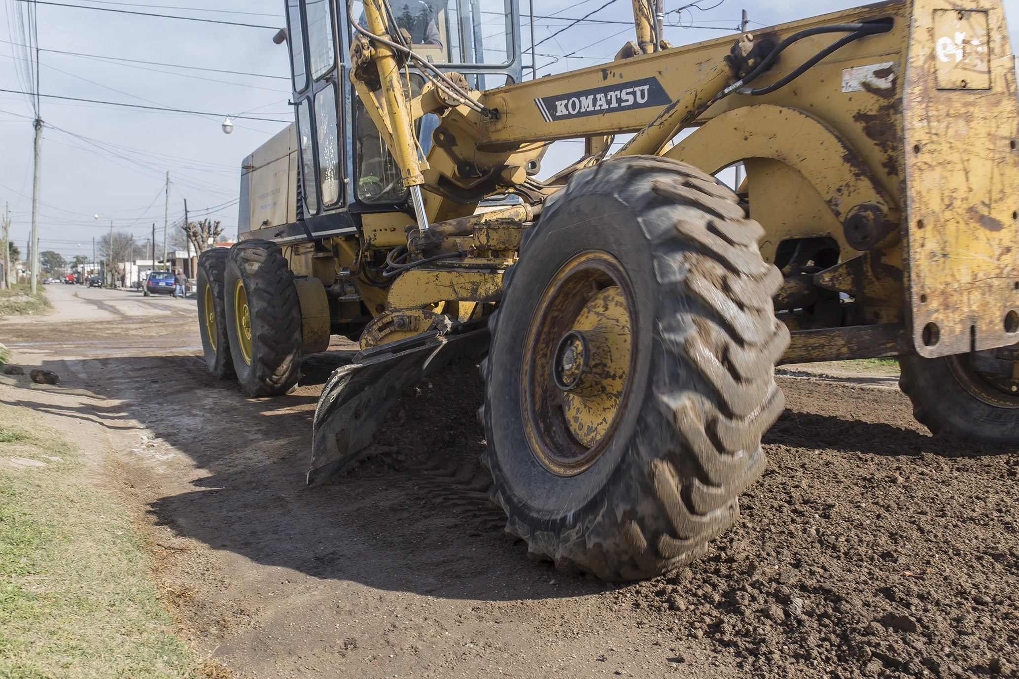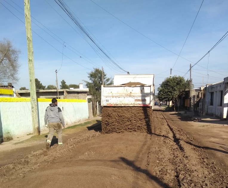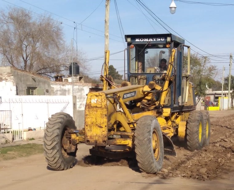 Con la motoniveladora reincorporada al municipio luego de una reparación integral, prosigue el arreglo de calles de tierra, incluyendo el agregado de áridos para su mejor compactación.