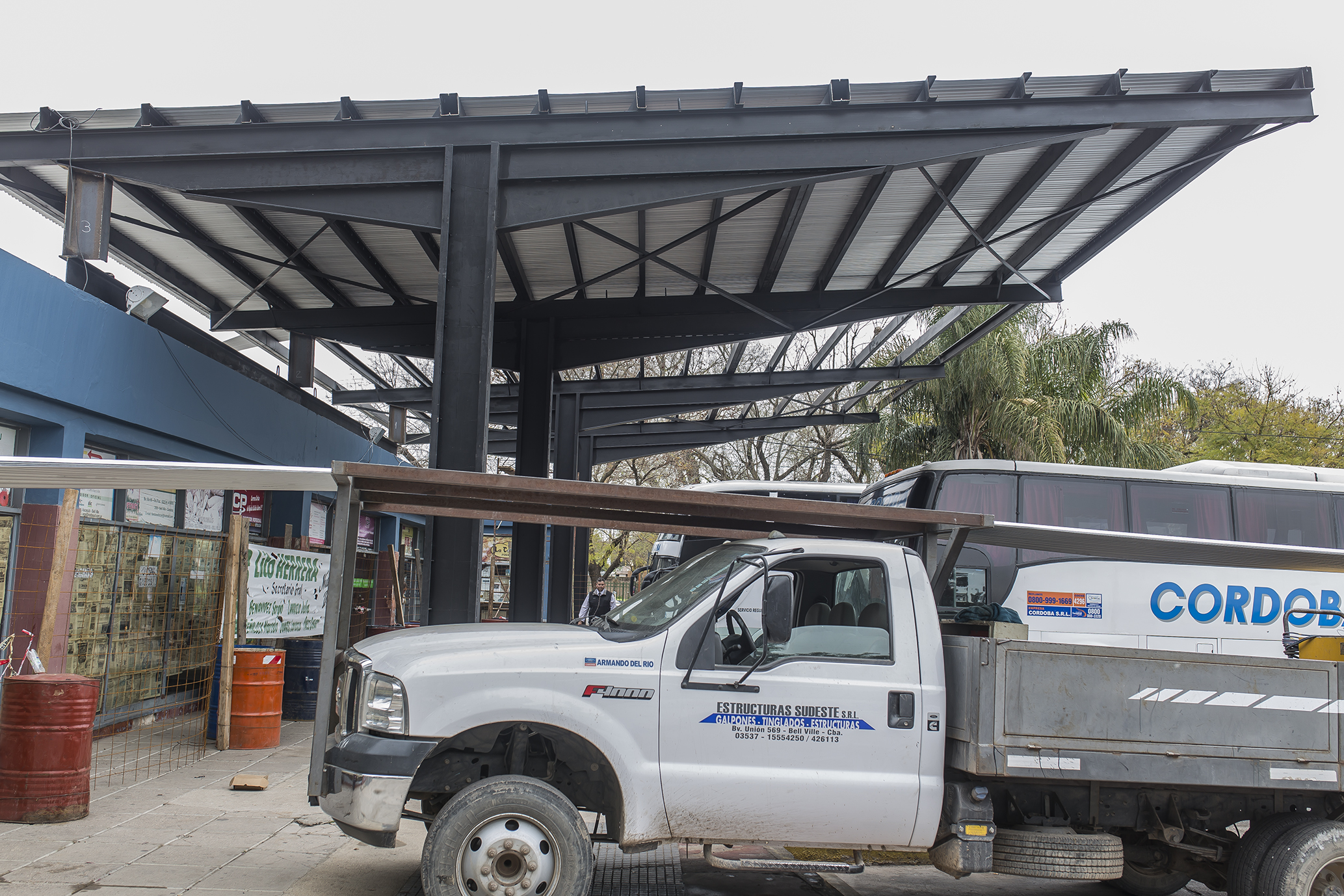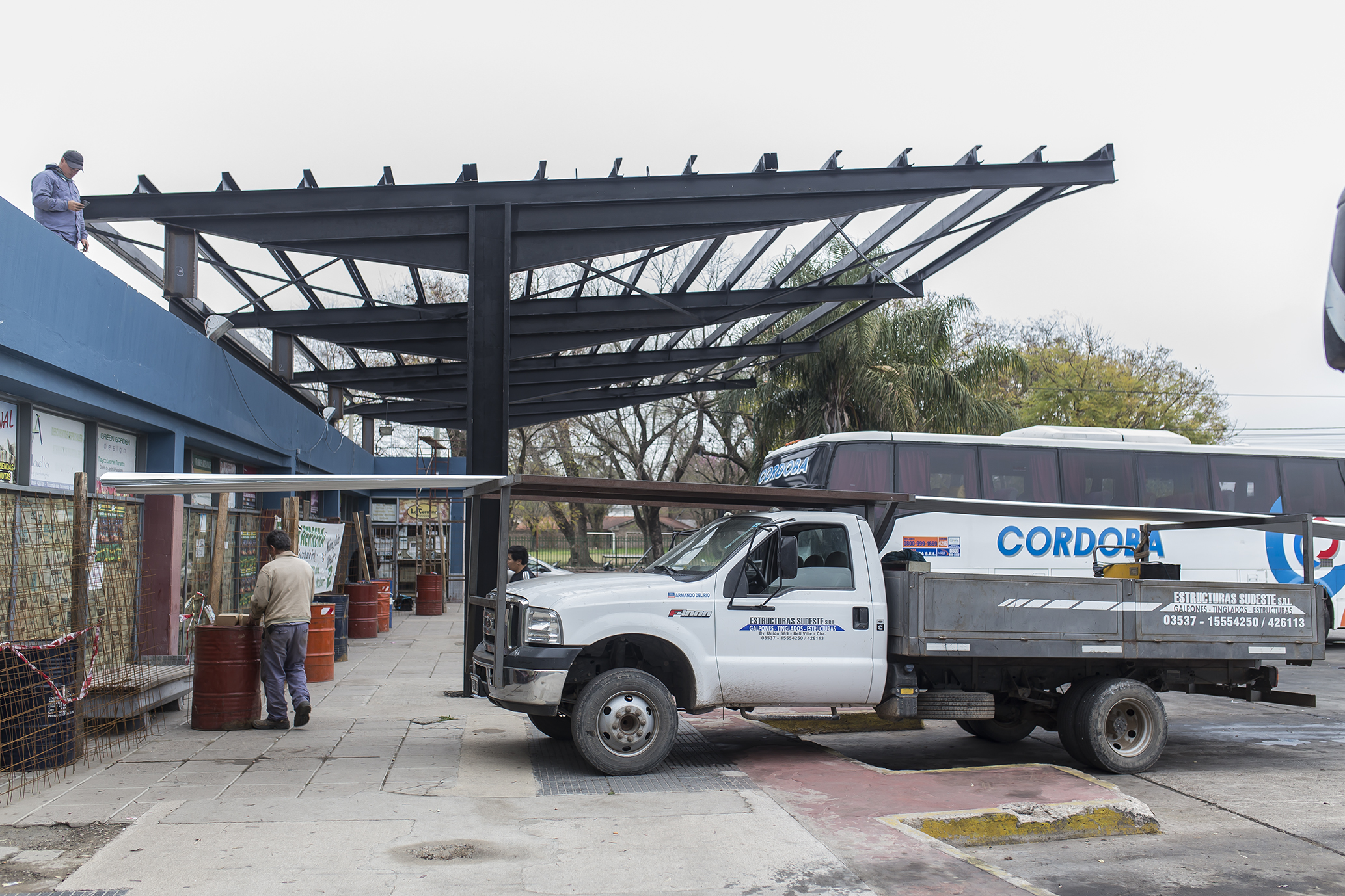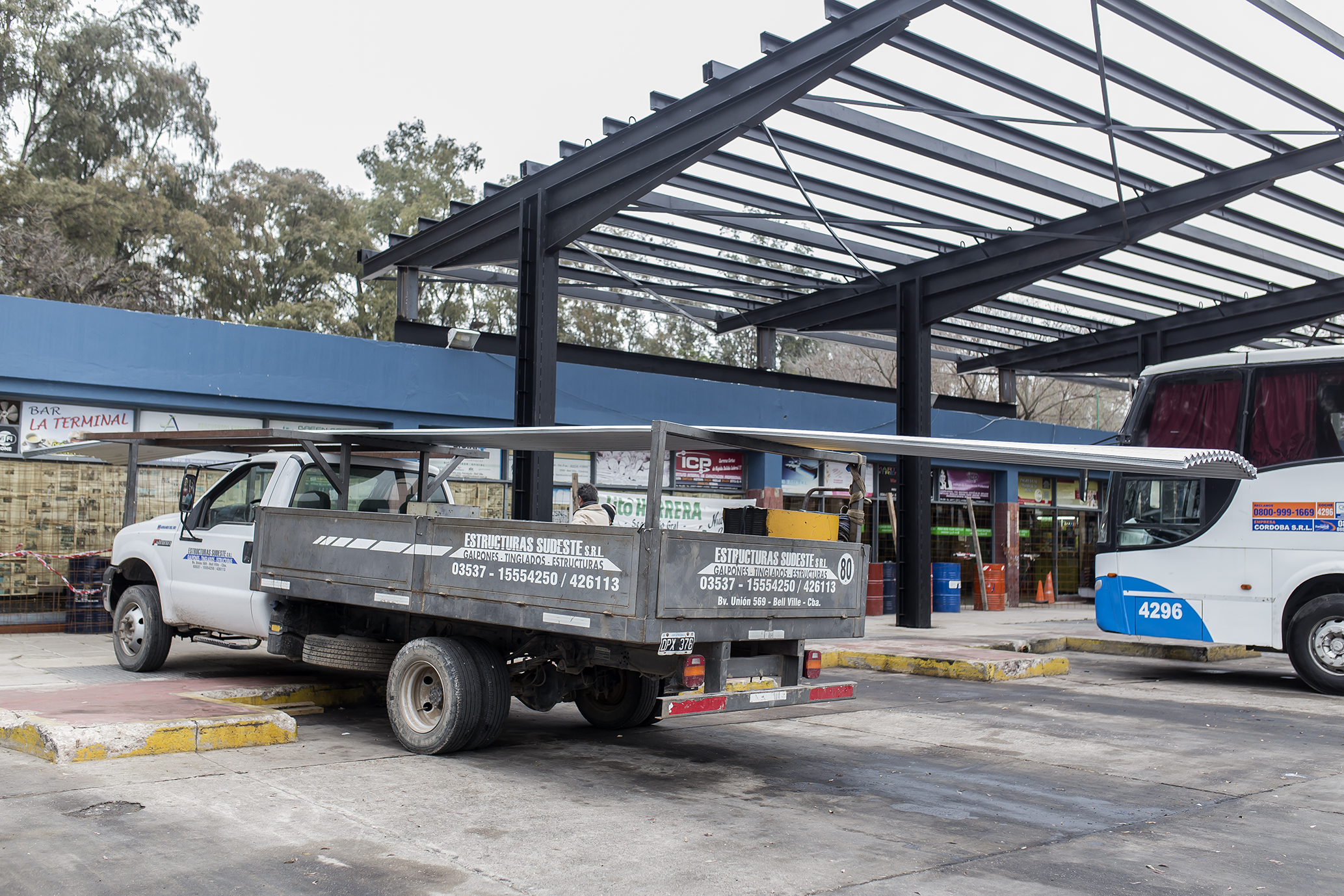 Personal de la empresa contratada por el municipio, está colocando la cubierta del alero sobre las dársenas de la Terminal de Ómnibus.