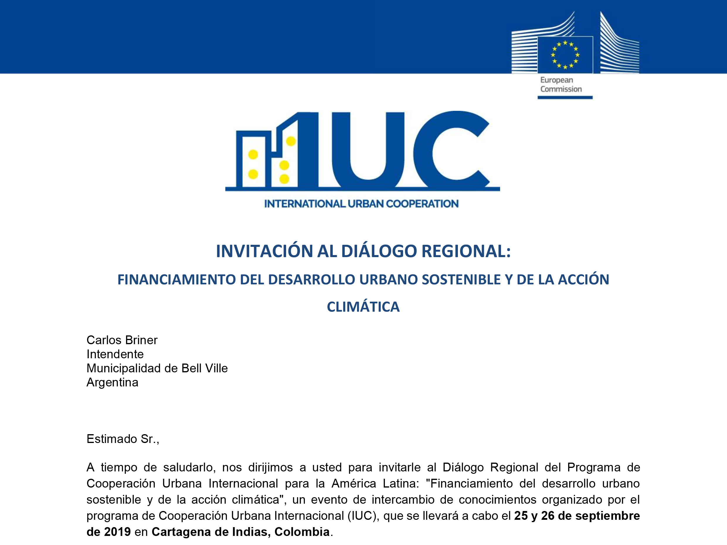 Invitado especialmente por los organizadores, el intendente Carlos Briner participará del Diálogo Regional del Programa de Cooperación Urbana Internacional para la América Latina: “Financiamiento del desarrollo urbano sostenible y de la acción climática”, un evento de intercambio de conocimientos organizado por el programa de Cooperación Urbana Internacional (IUC), que se llevará a cabo el 25 y 26 de este mes en Cartagena de Indias, Colombia.