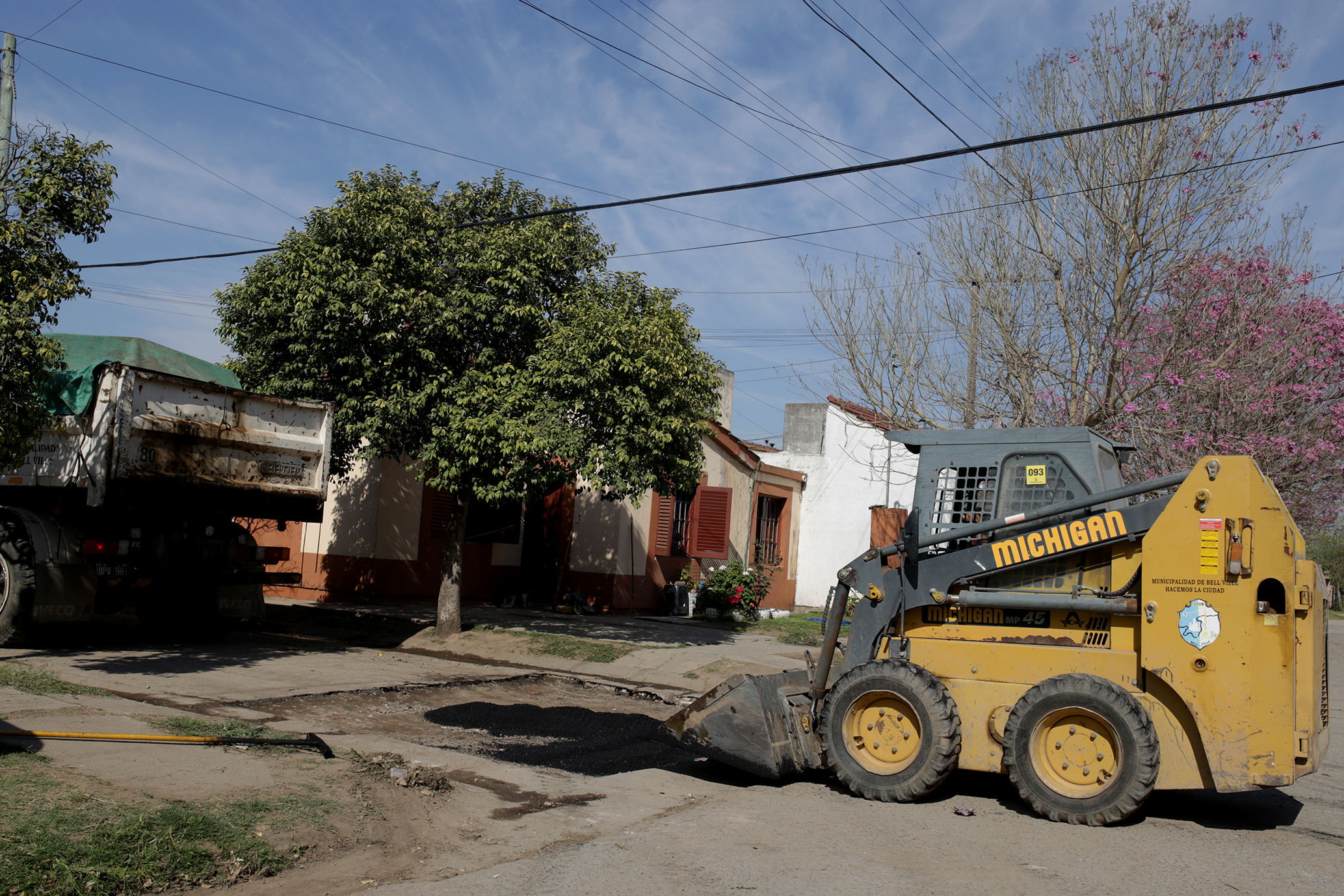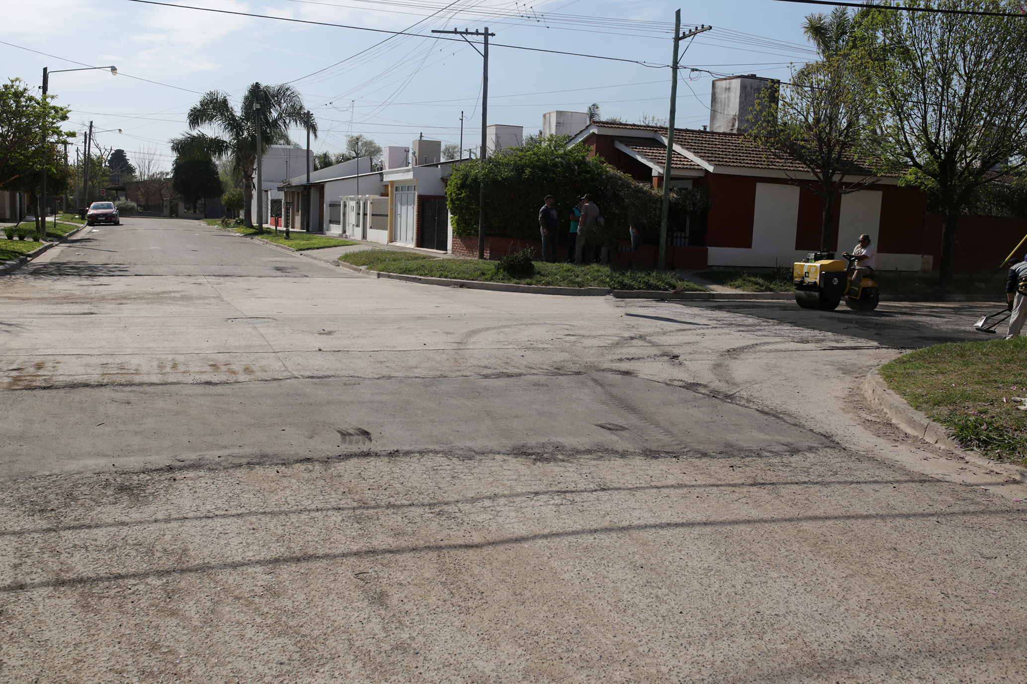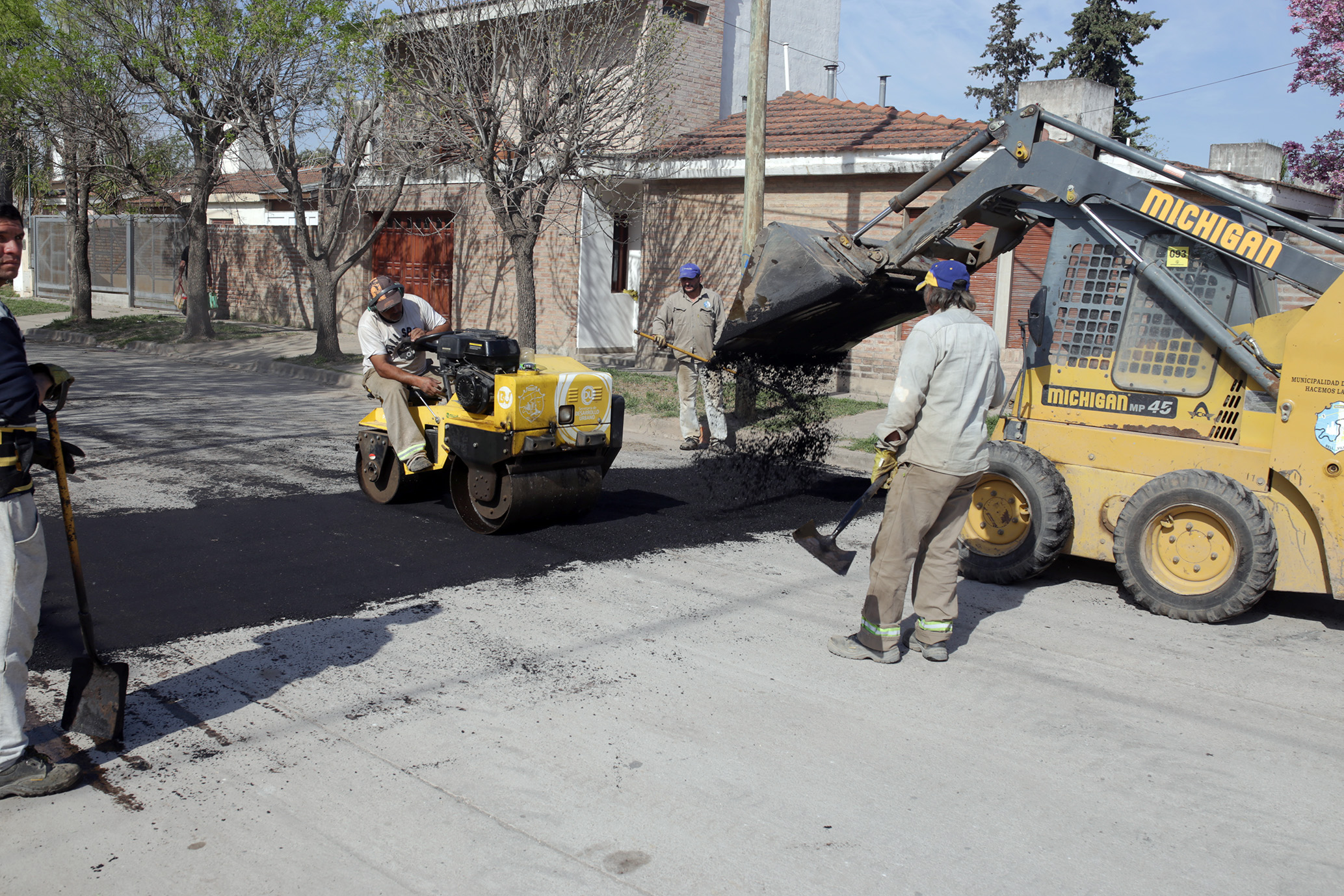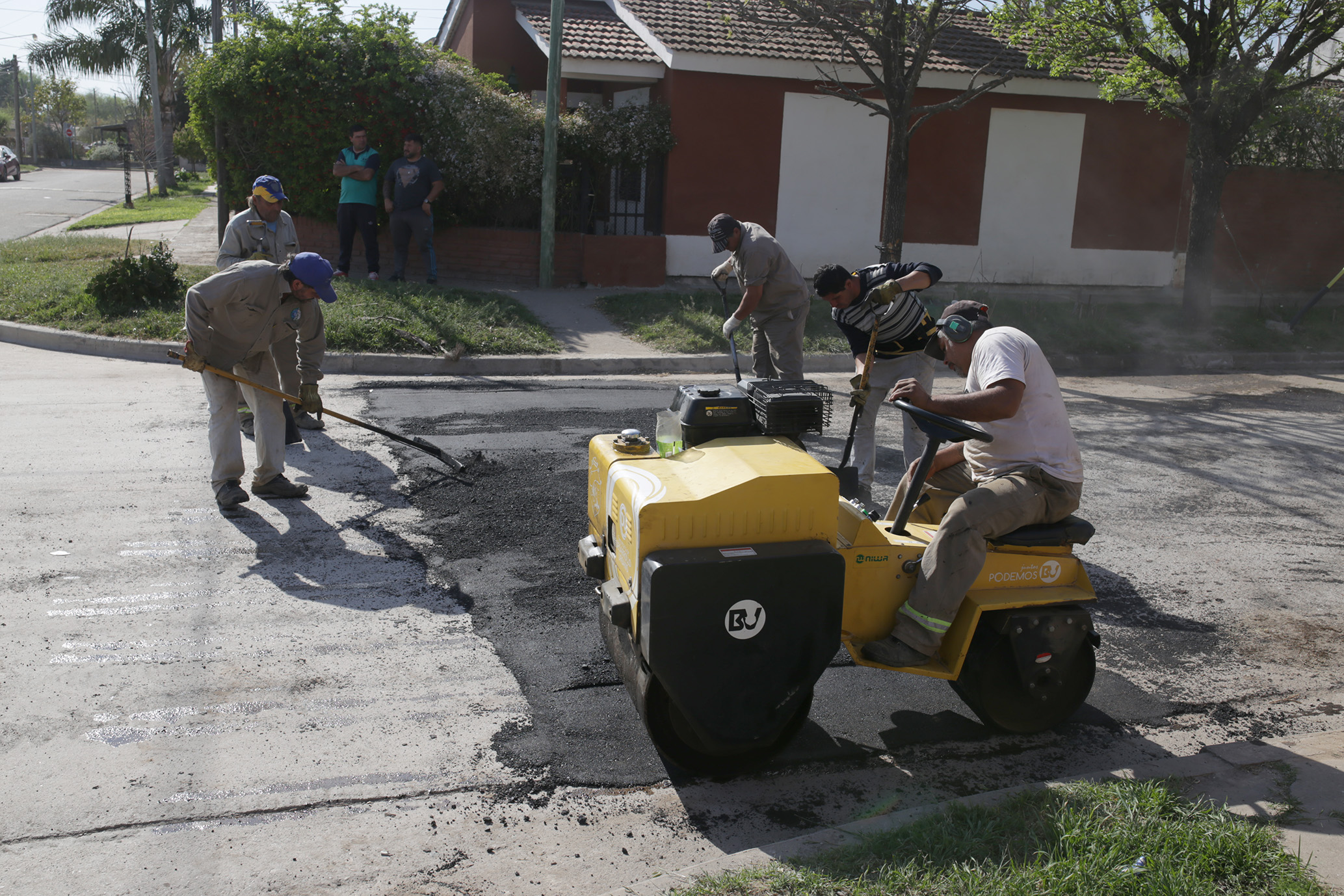 La cuadrilla municipal de Obras Públicas afectada a las tareas de bacheo de calles, intervino en arterias del Barrio Jardín.