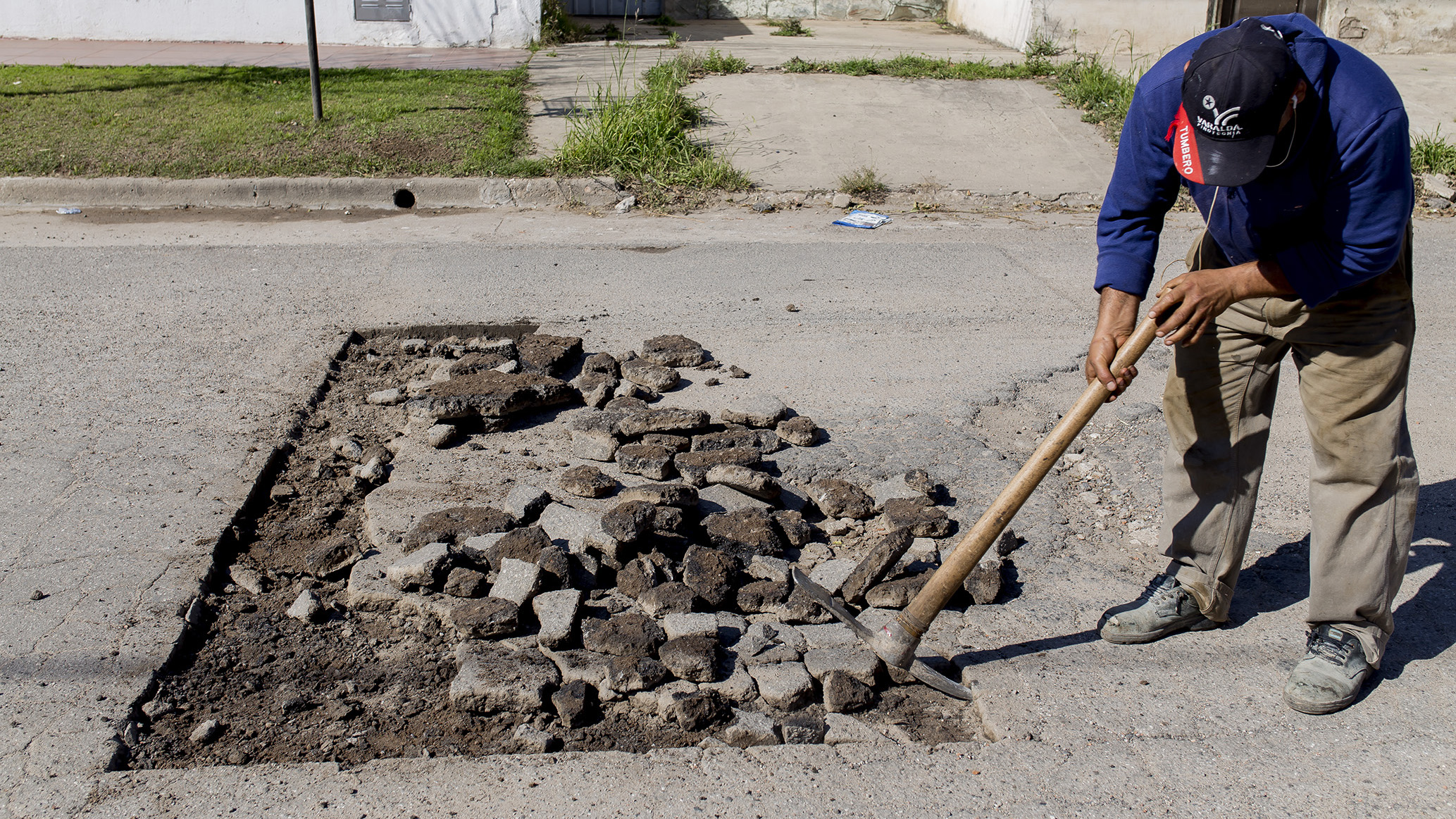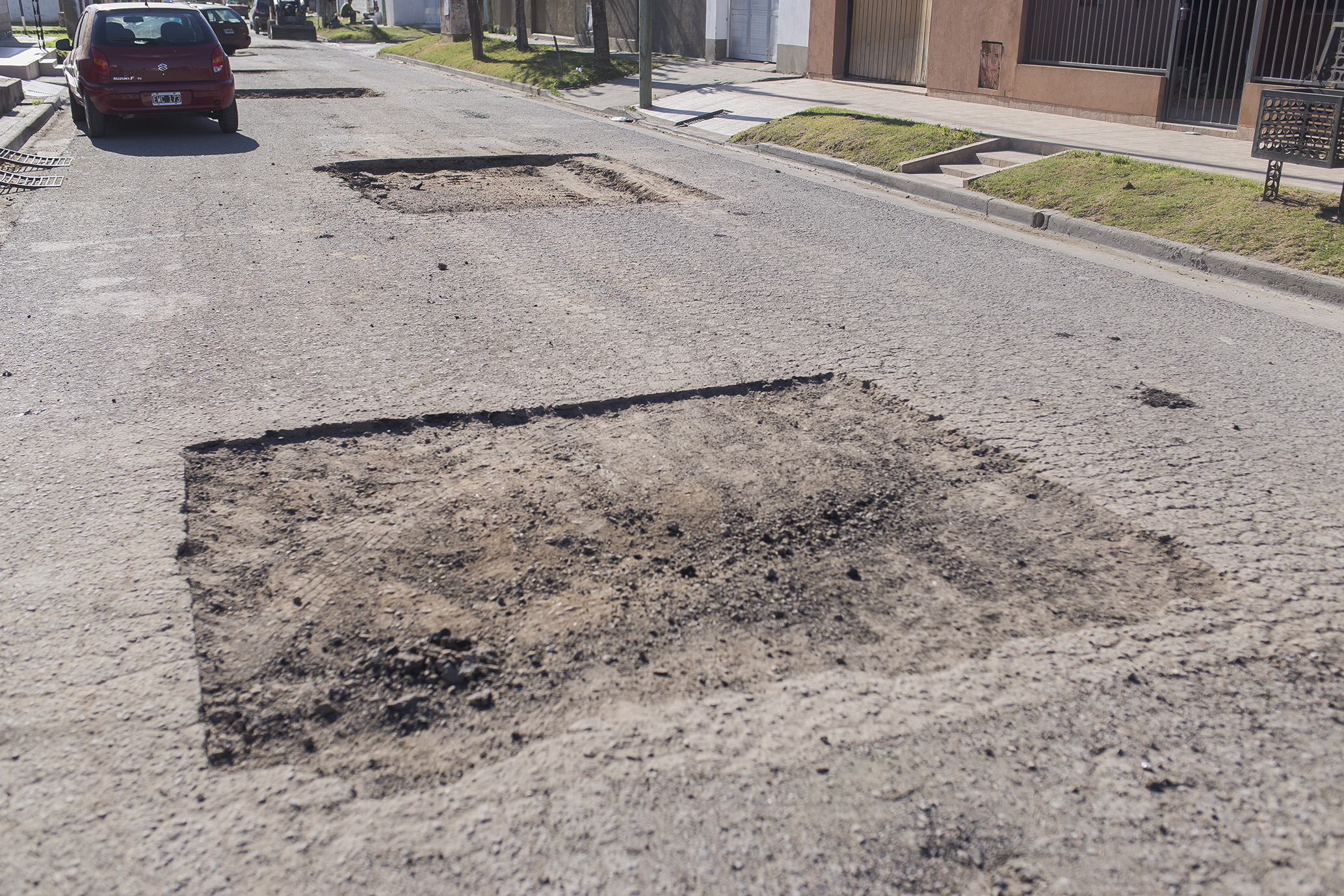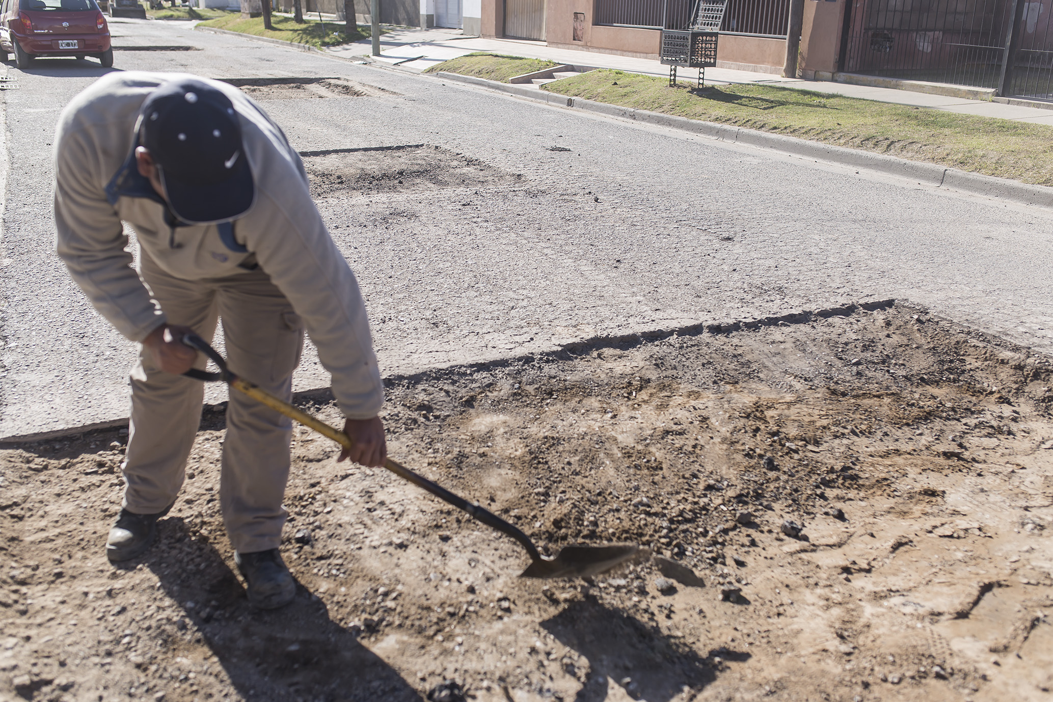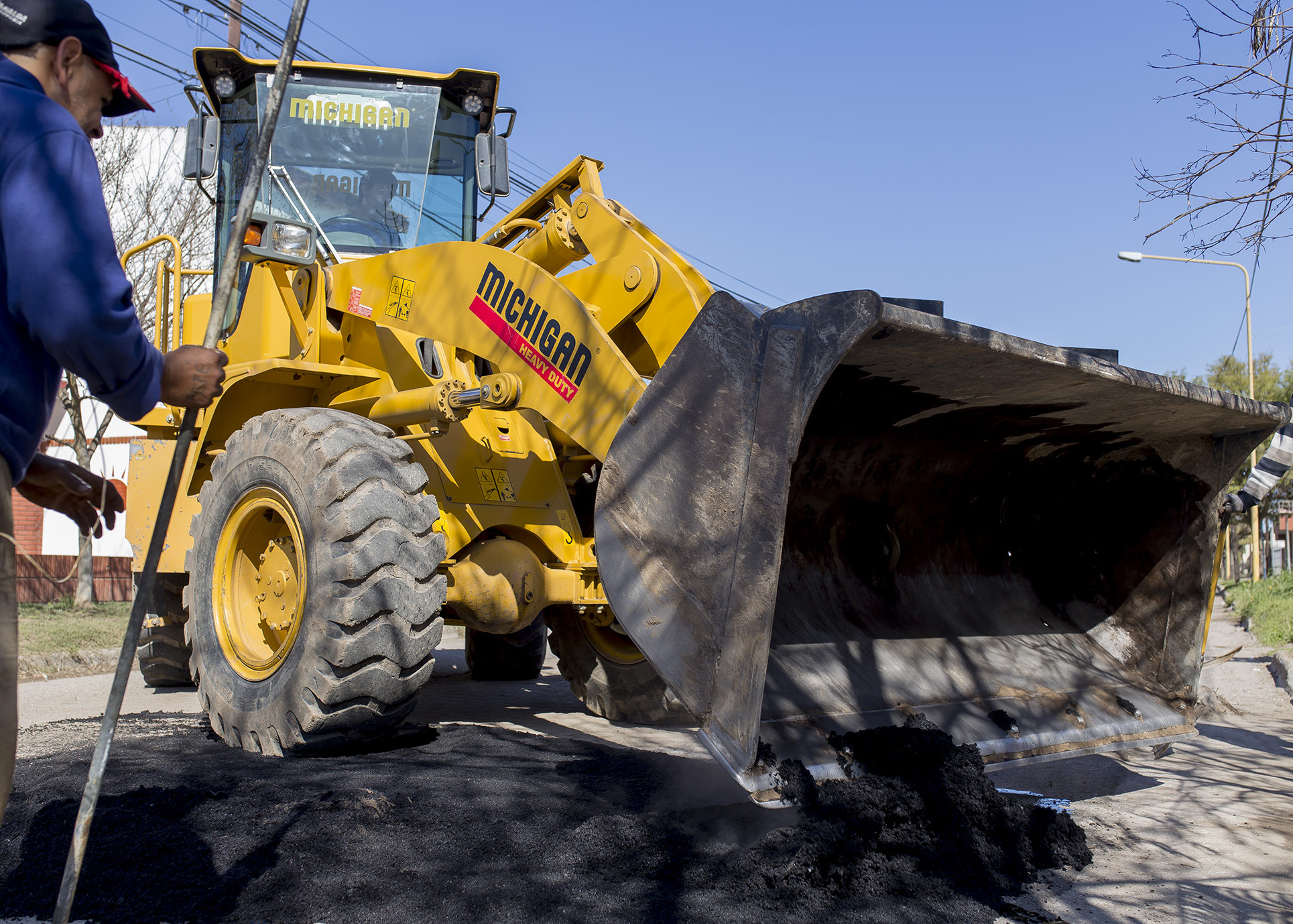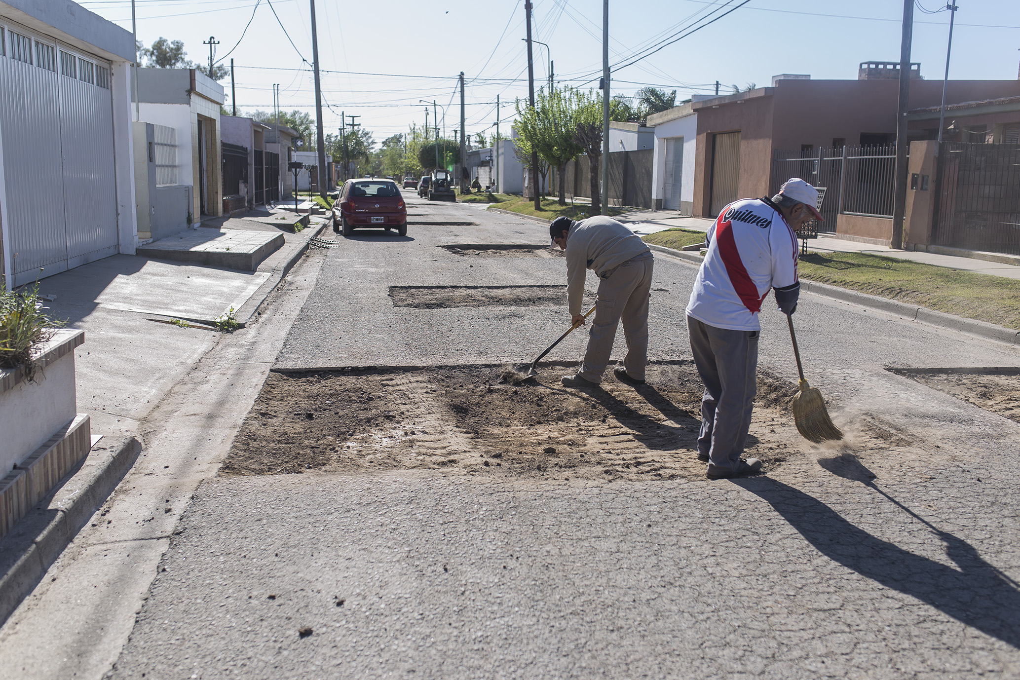 La labor ininterrumpida de reparación de calles, se trasladó a la arteria América. Luego del levantamiento de las partes más afectadas se procedió al relleno correspondiente con asfalto en caliente.
