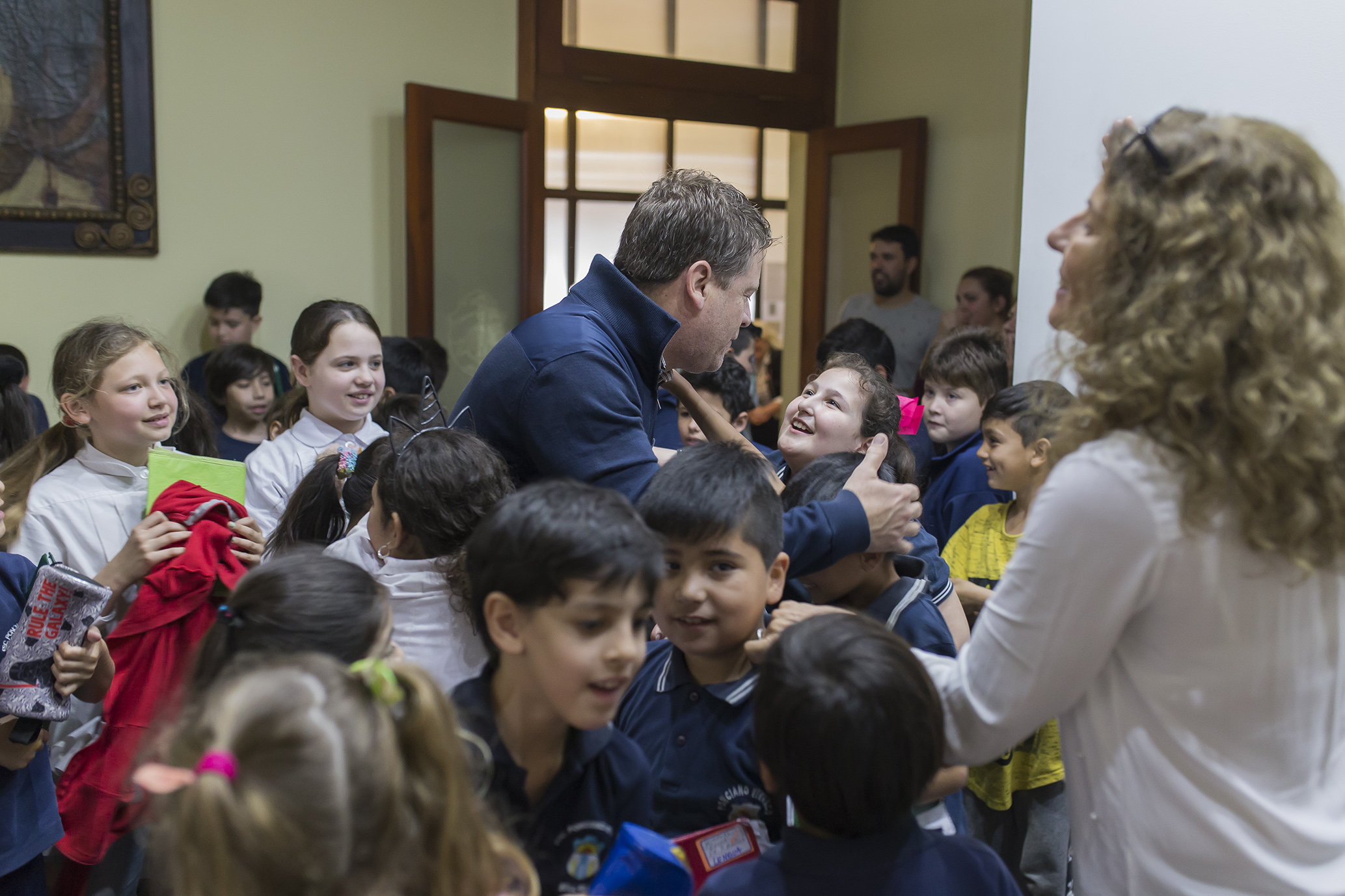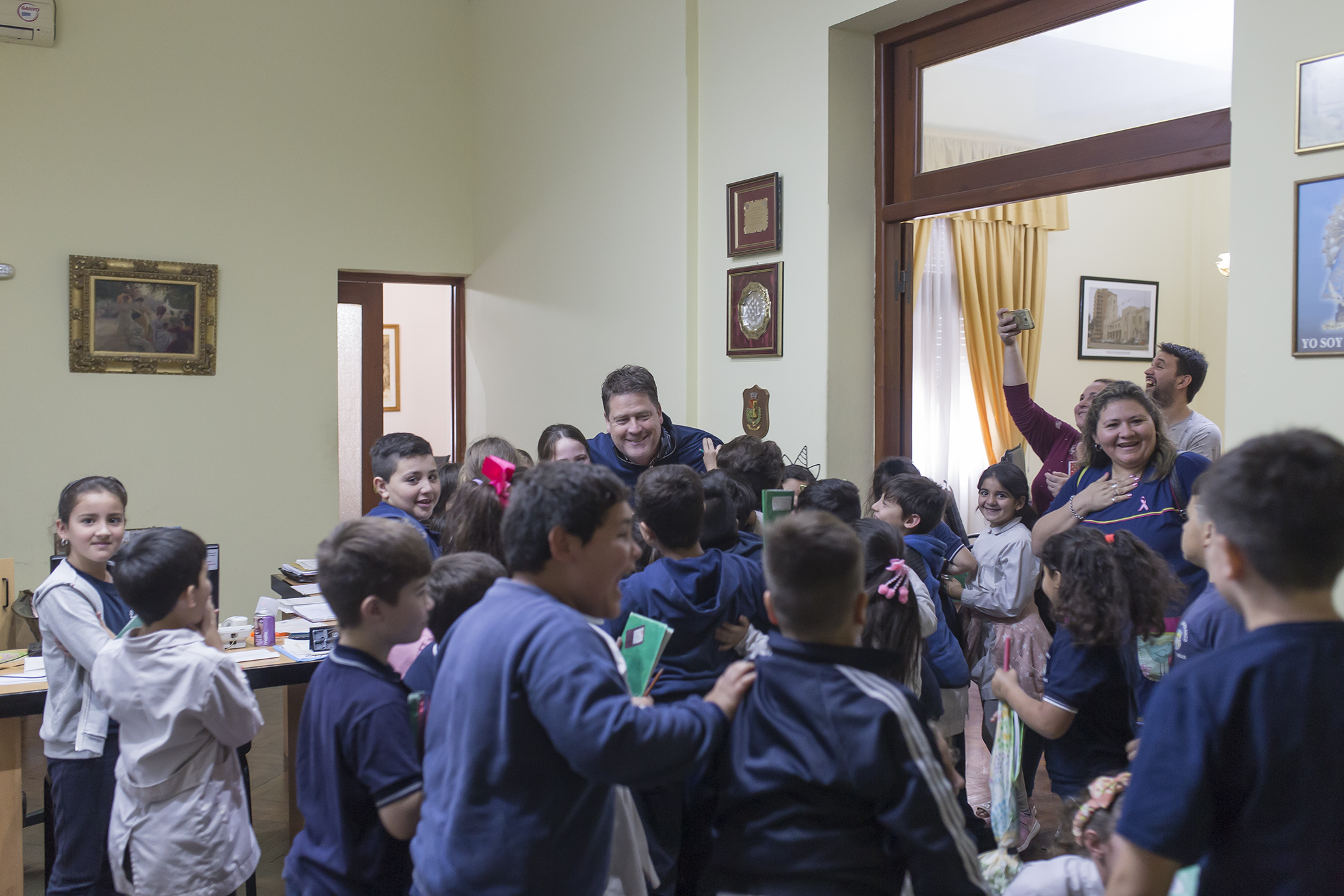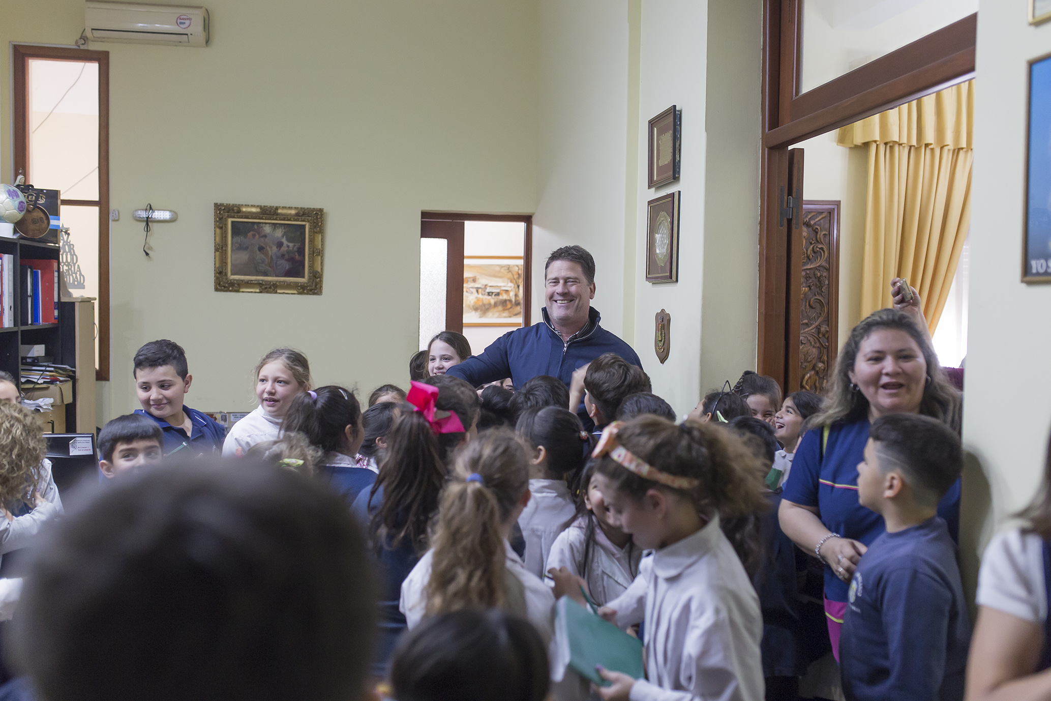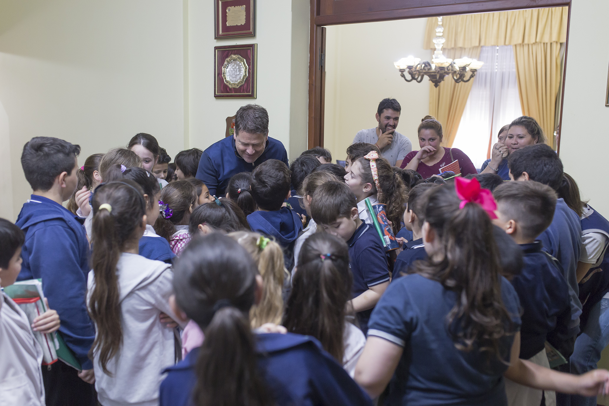 Tras la información brindada por personal municipal en el salón Walter de Navazio, las niñas y niños, acompañados de las docentes Laura Paola Serra y María Rosa Alzamendi, fueron recibidos por el intendente, Carlos Briner.