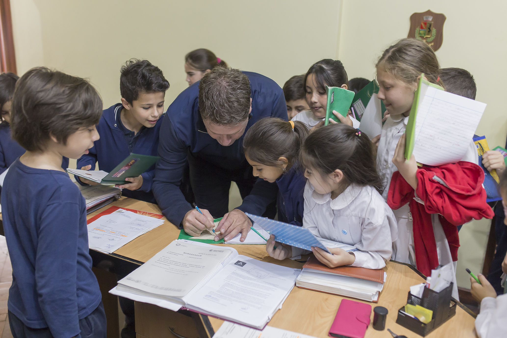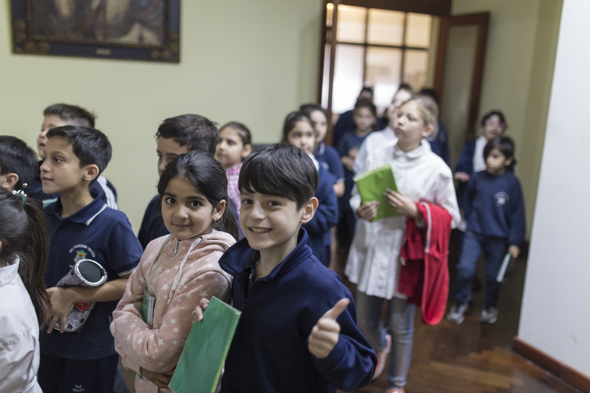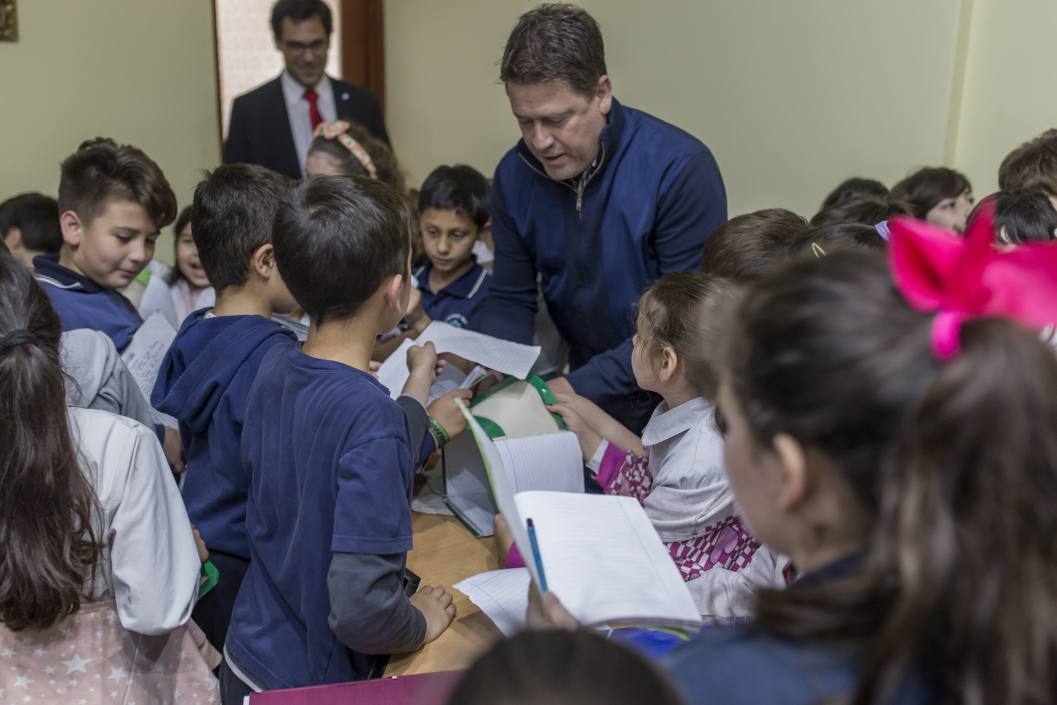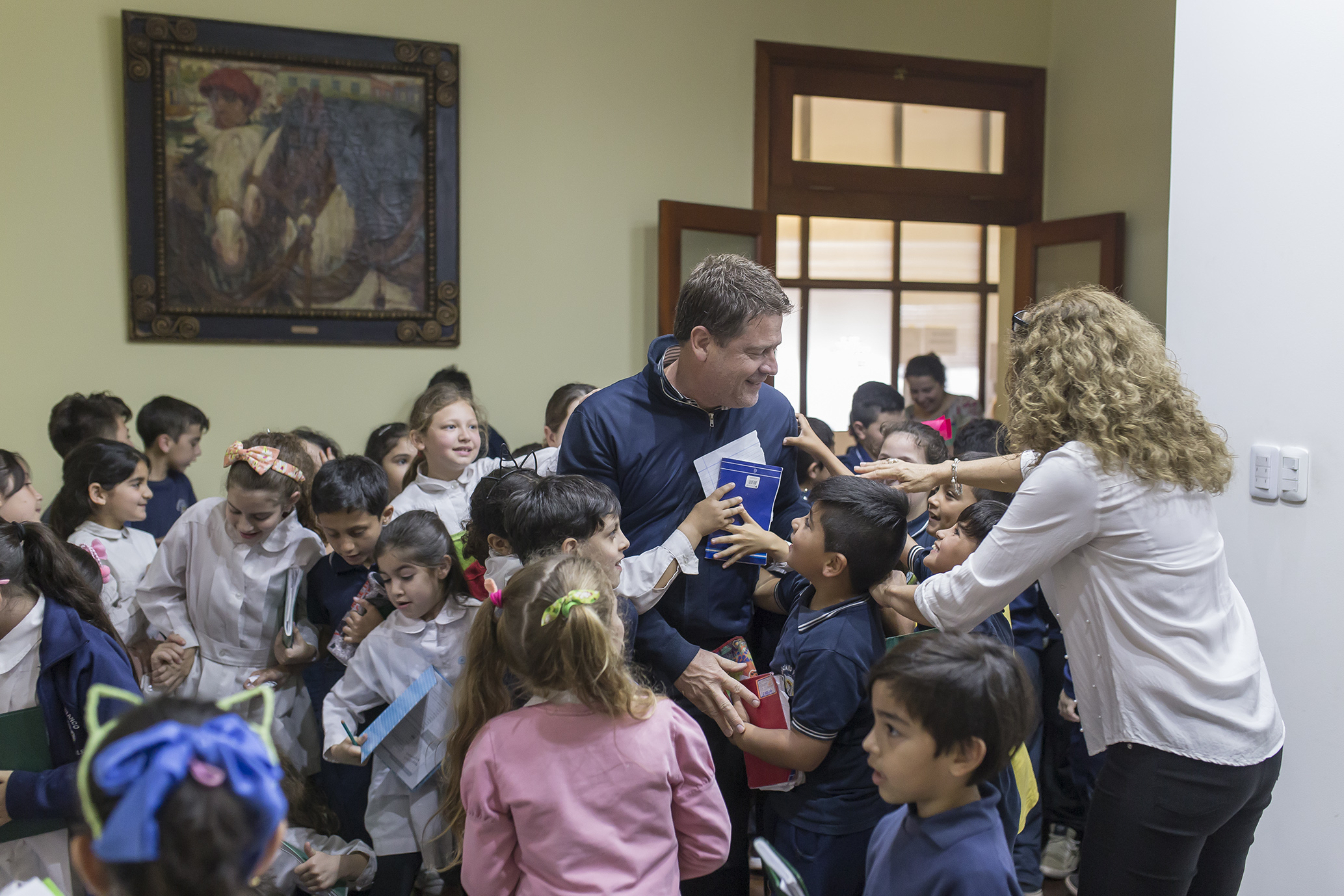 Tras la información brindada por personal municipal en el salón Walter de Navazio, las niñas y niños, acompañados de las docentes Laura Paola Serra y María Rosa Alzamendi, fueron recibidos por el intendente, Carlos Briner.