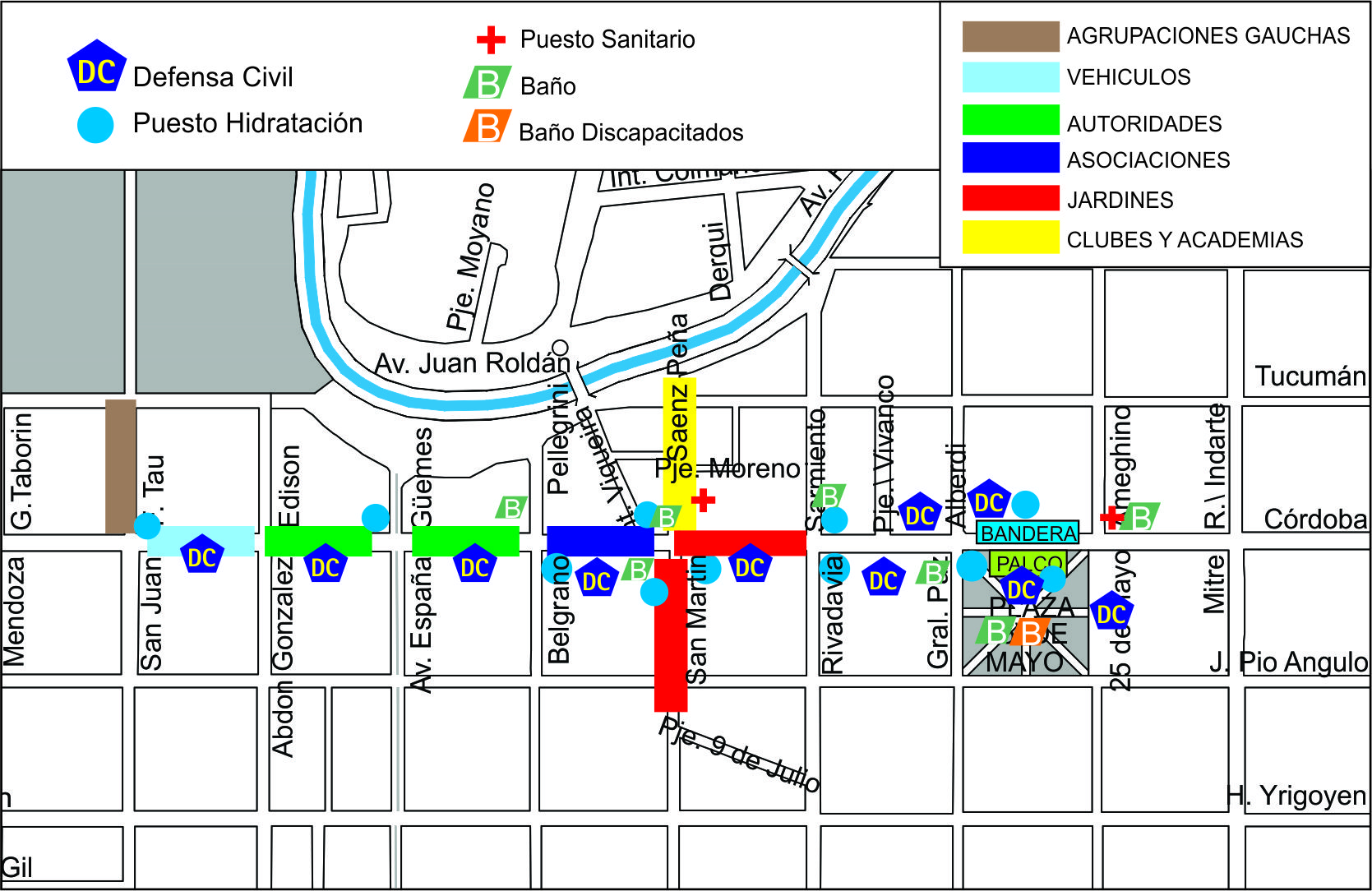 Habrá puestos sanitarios en Pasaje Moreno y Ameghino, más profesionales de Defensa Civil en cada cuadra; puestos de hidratación y baños químicos, incluyendo sanitarios para discapacitados, los que estarán ubicados en Plaza 25 de Mayo.