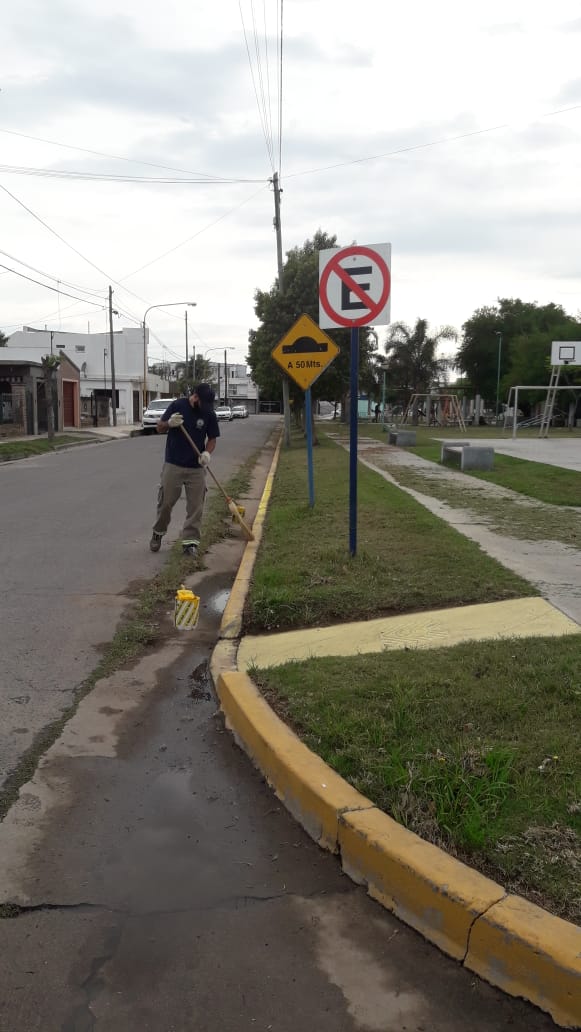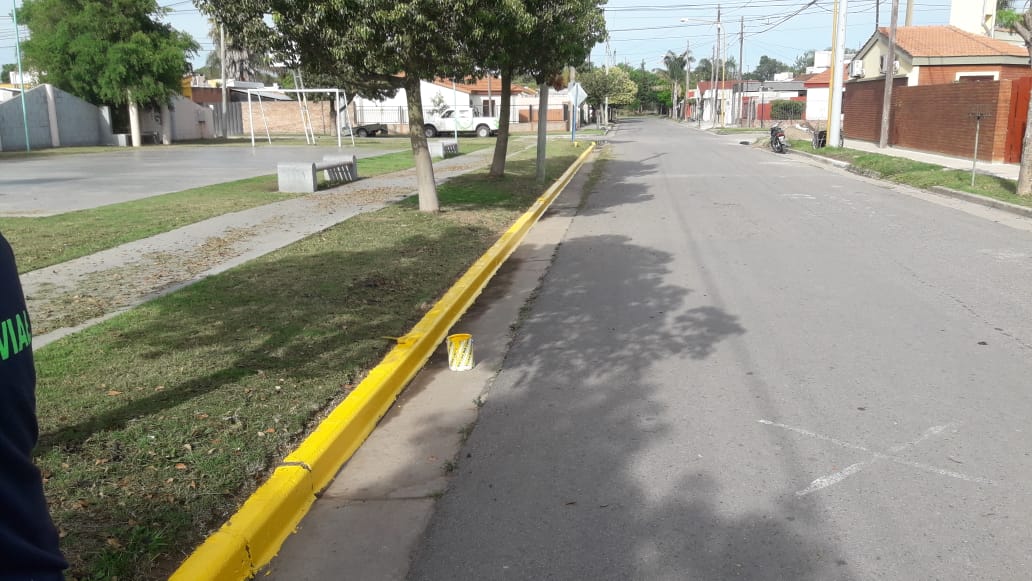 Personal municipal del Taller Vial, perteneciente a la secretaría de Convivencia Ciudadana, está pintando cordones en la zona de Barrio Portal del Río y bulevar Ascasubi.