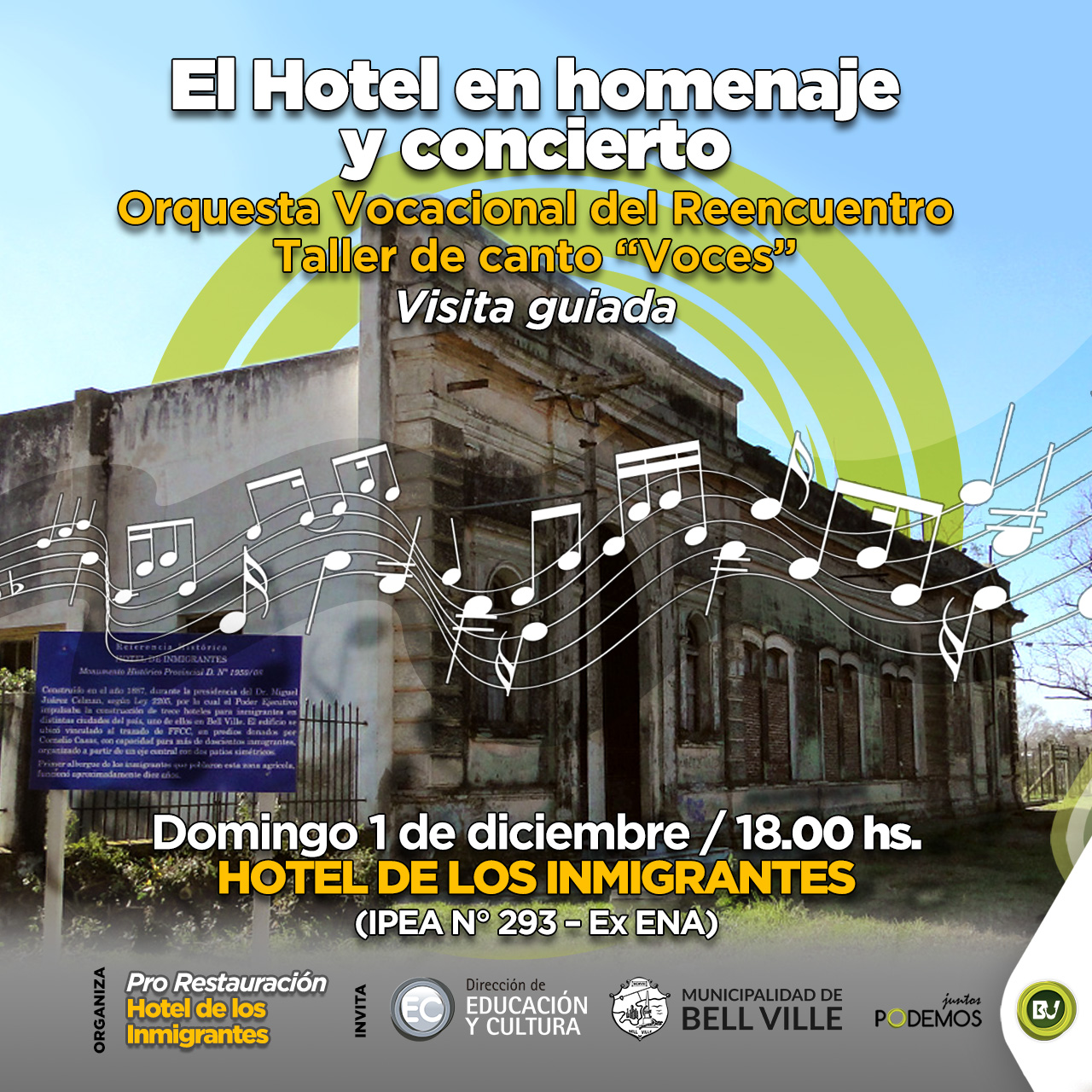 En el predio del IPEA Nº 293 Agr. Orestes Chiesa Molinari-Ex Ena, donde se asienta el emblemático inmueble, ese día desde las 18:00 se presentará la Orquesta Vocacional del Reencuentro y el Taller de Canto Voces, además de visitas guiadas al hotel.