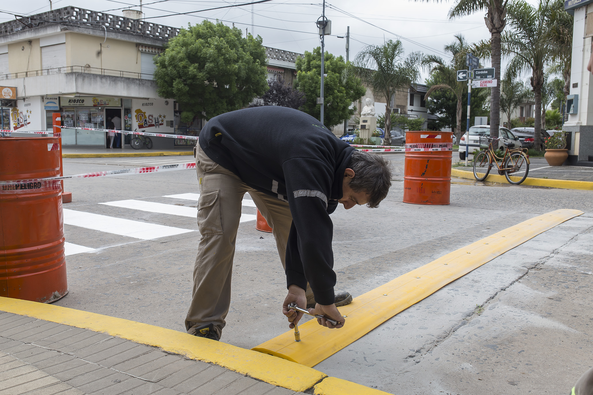 En distintas calles se continúa con la instalación de reductores de velocidad. Junto al repintado de sendas peatonales, se trabaja sobre calle Córdoba en las esquinas que forma con avenidas España y Güemes.