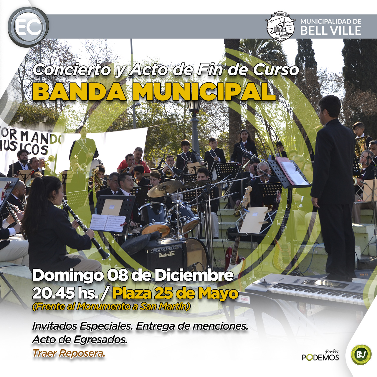 Este domingo 8 de diciembre, en el hemiciclo de la Plaza 25 de Mayo, desde las 20:45, la Escuela de Música y Banda Municipal “Ernesto Alfonso Bianchi” presentará su Acto de Fin de Curso y Concierto.