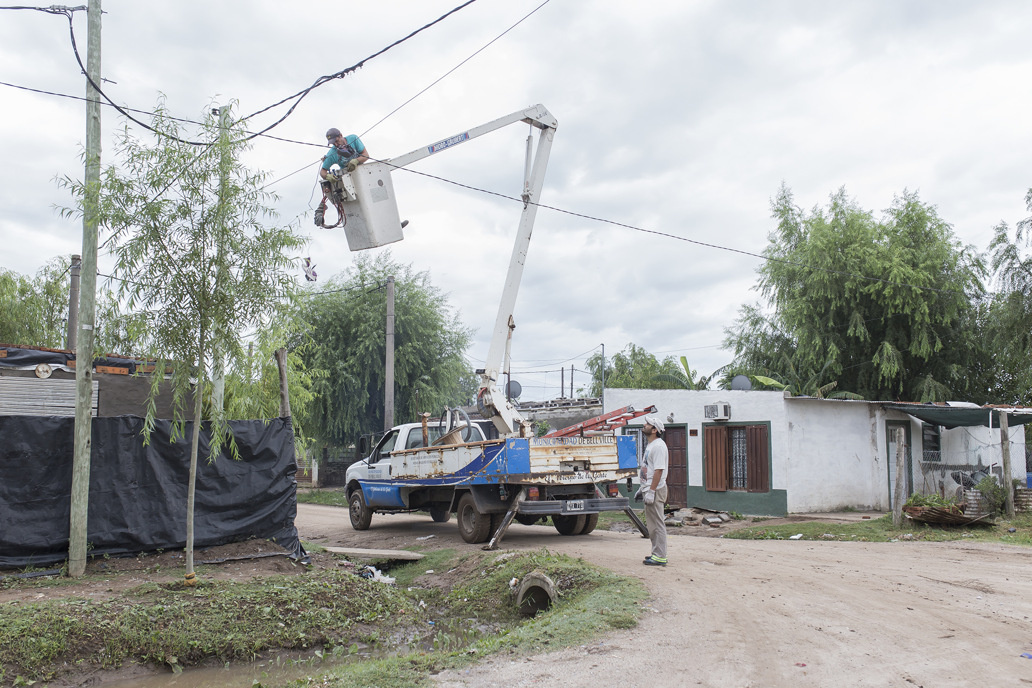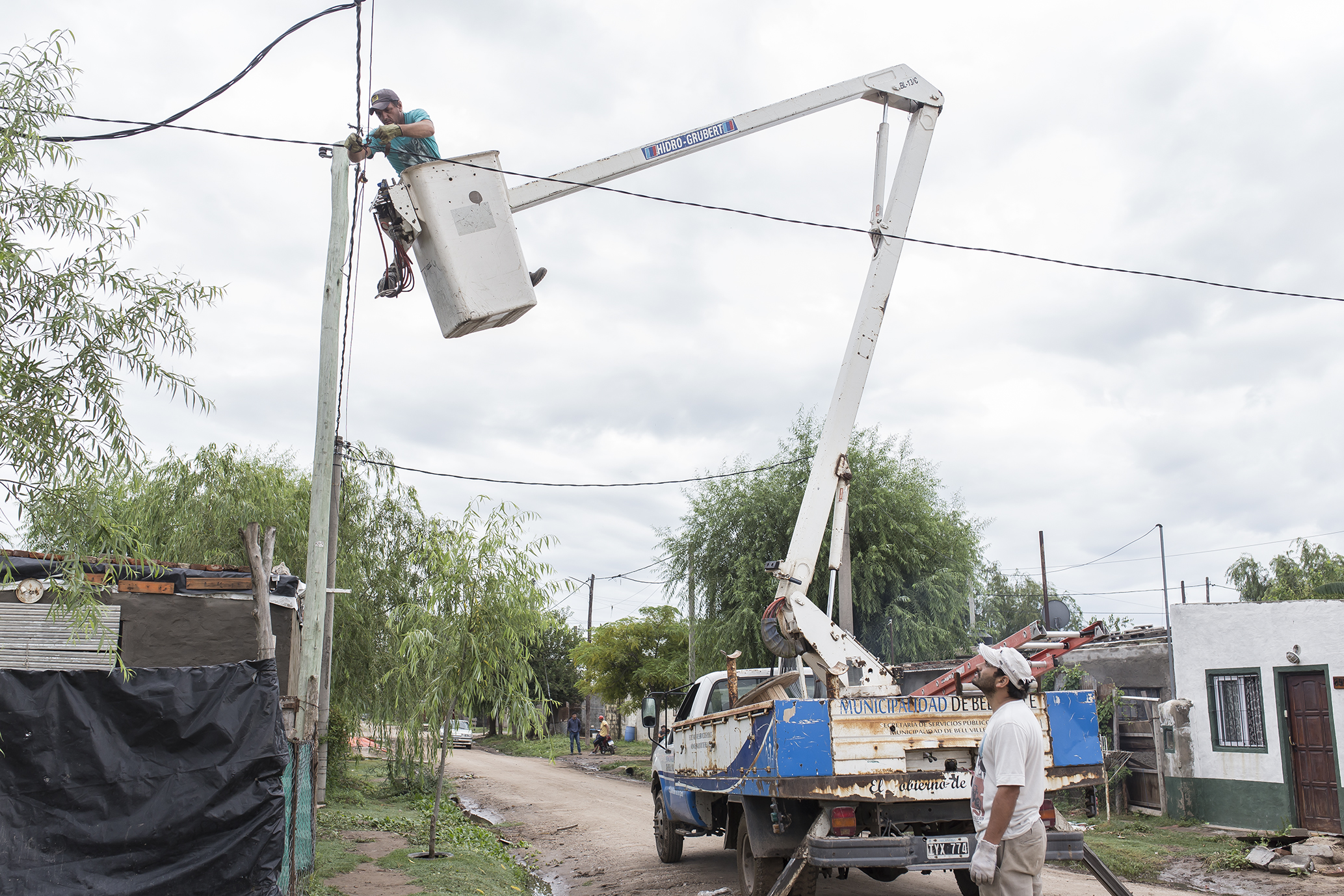 Personal del área municipal de Electricidad está reponiendo cables de electricidad destinados al alumbrado público en calle Perito Moreno, entre Uruguay y Vélez Sarsfield.