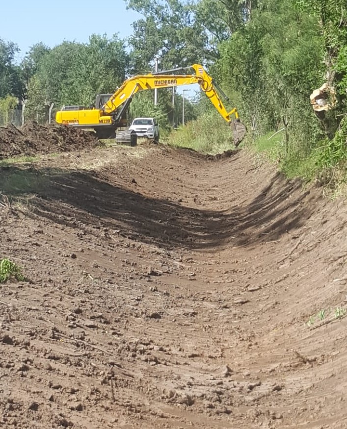 En el estratégico canal de desagüe se prosigue con el trabajo de mantenimiento en toda su extensión y hormigonado de la base para el funcionamiento de la bomba extractora de agua en la laguna de retardo.