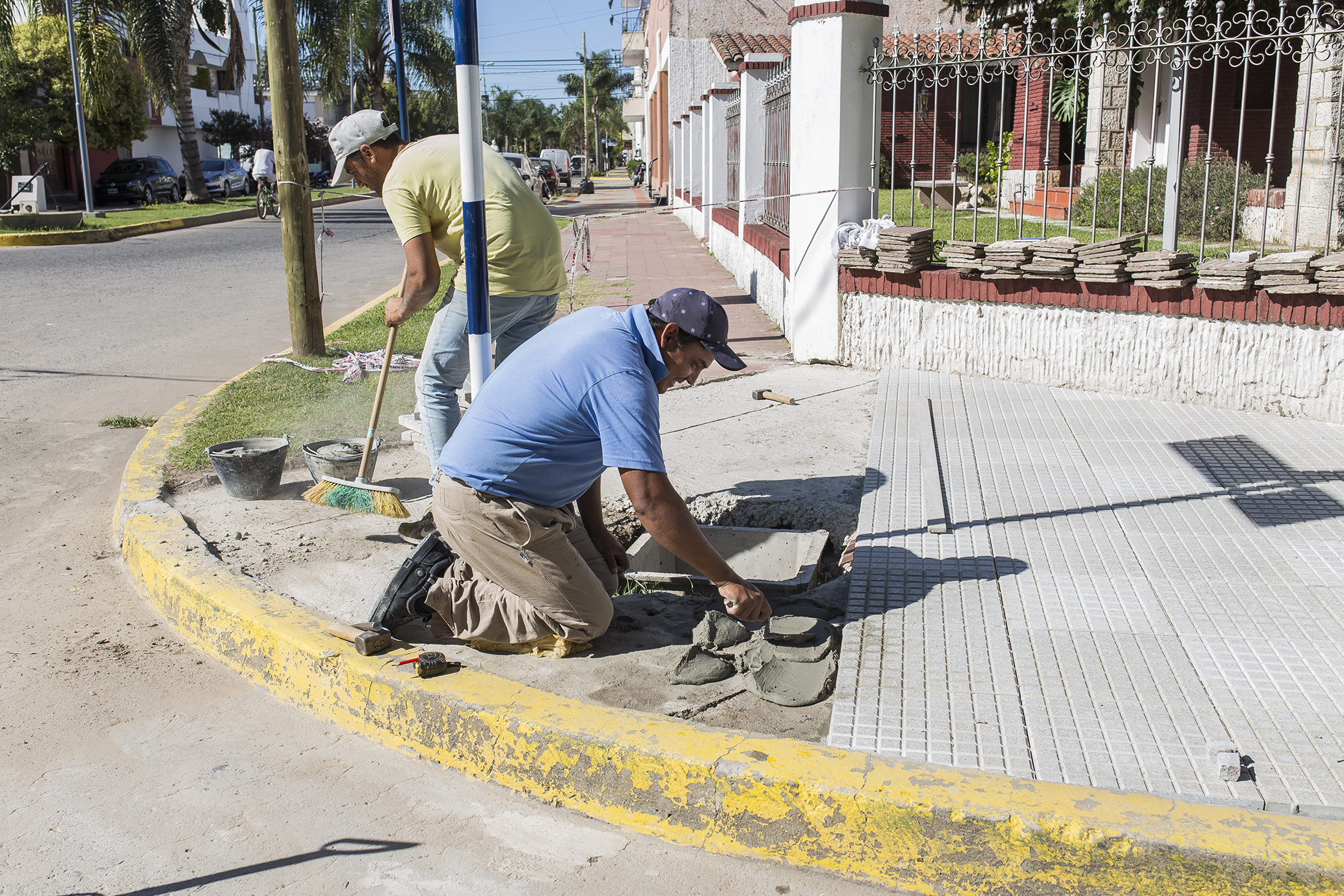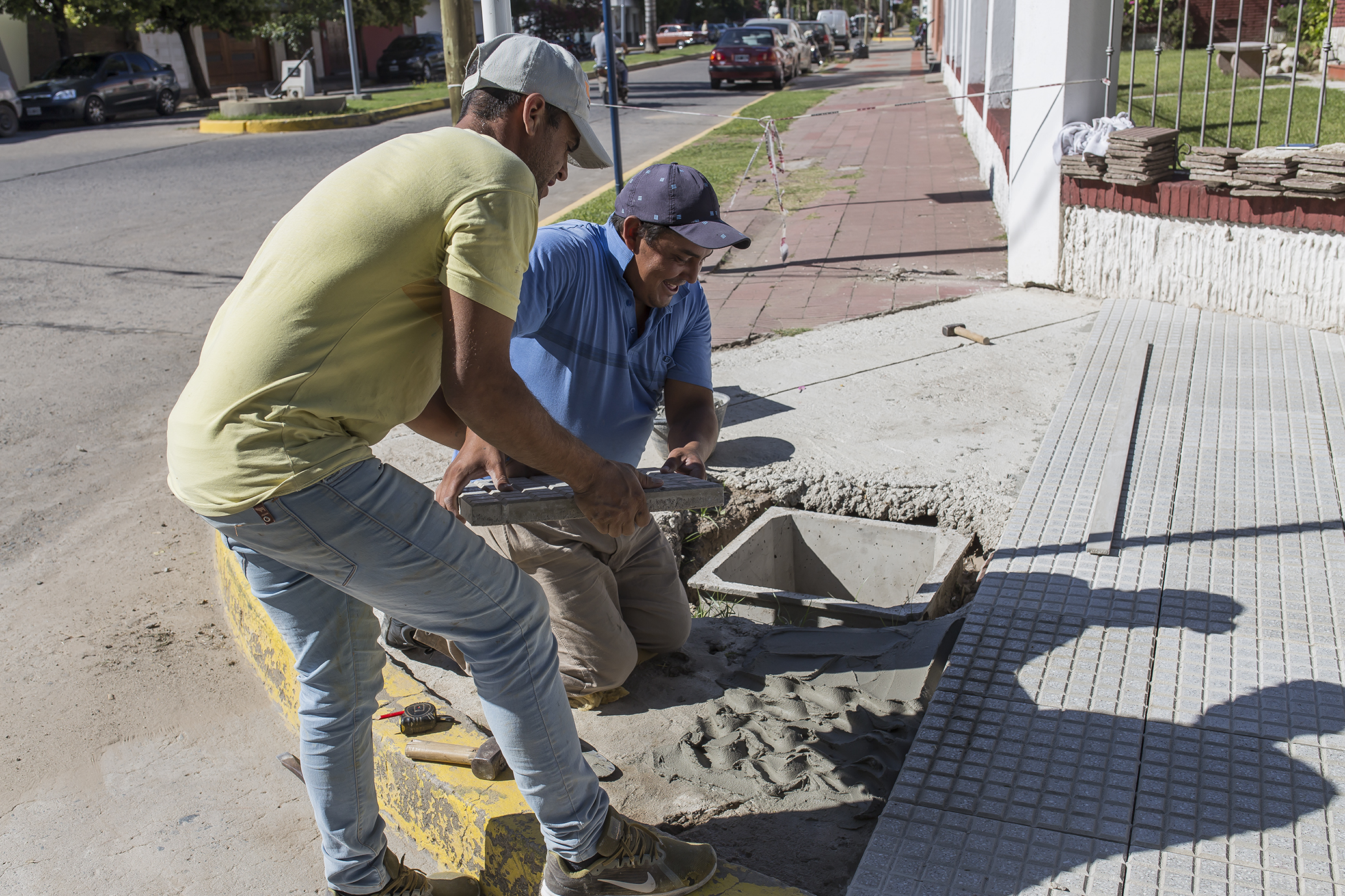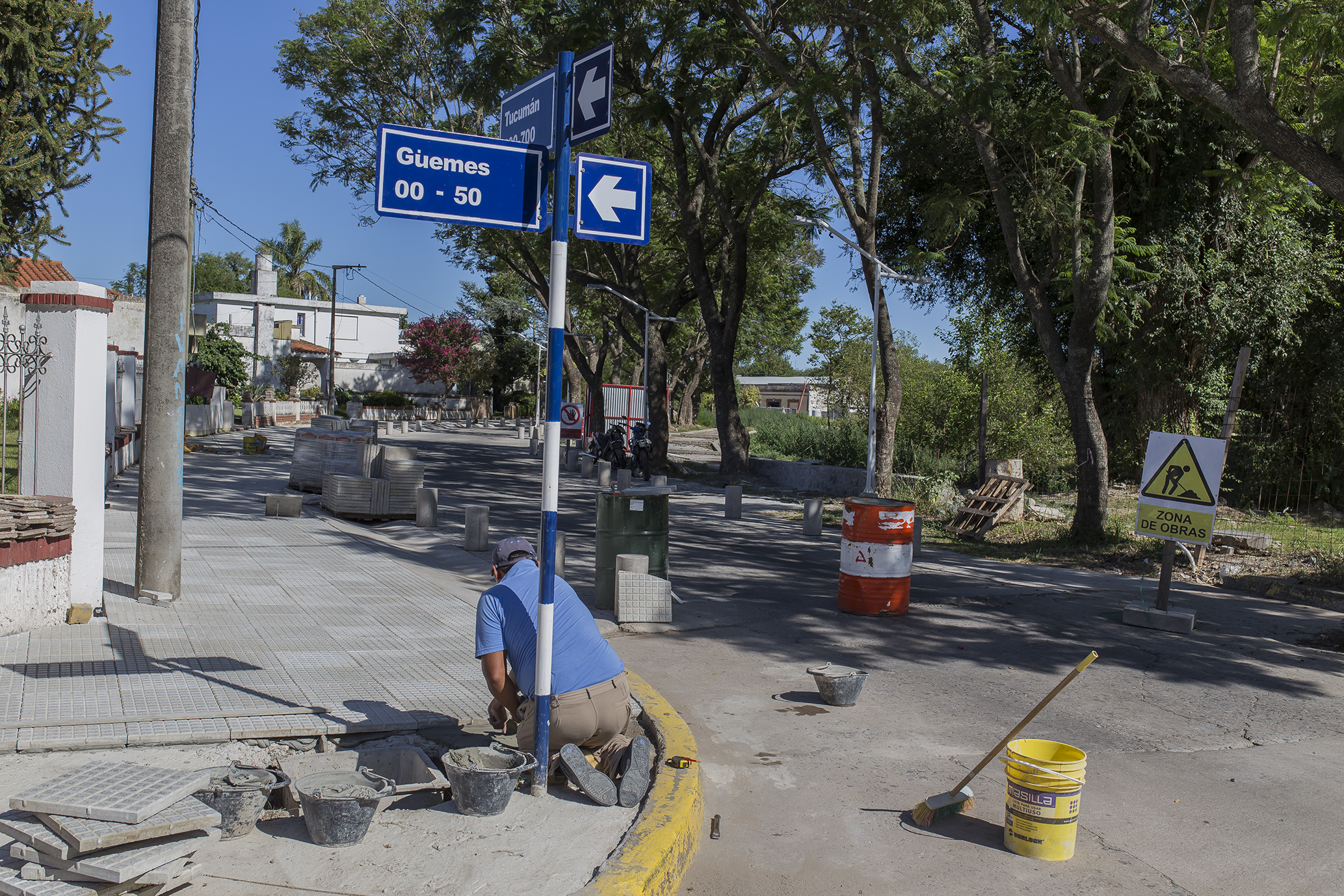 Comenzó la colocación de losetas en la vereda Sur, sector de viviendas, del Paseo Tucumán, entre avenida Güemes y calle Edison.