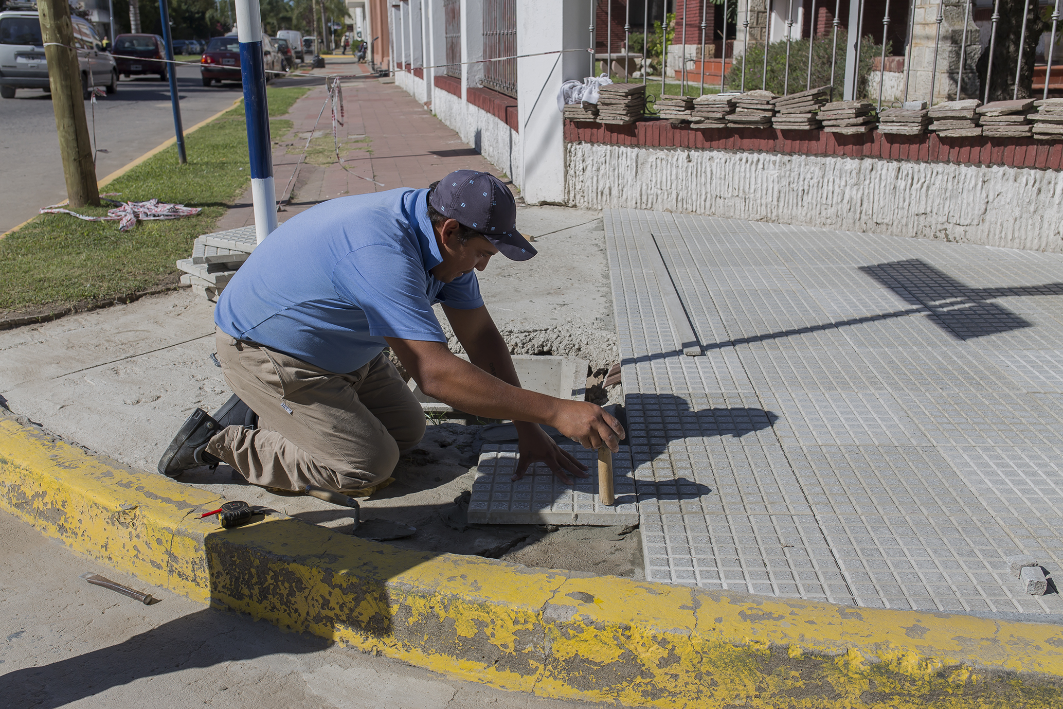 Se colocan las losetas en la vereda Sur del Paseo Tucumán.