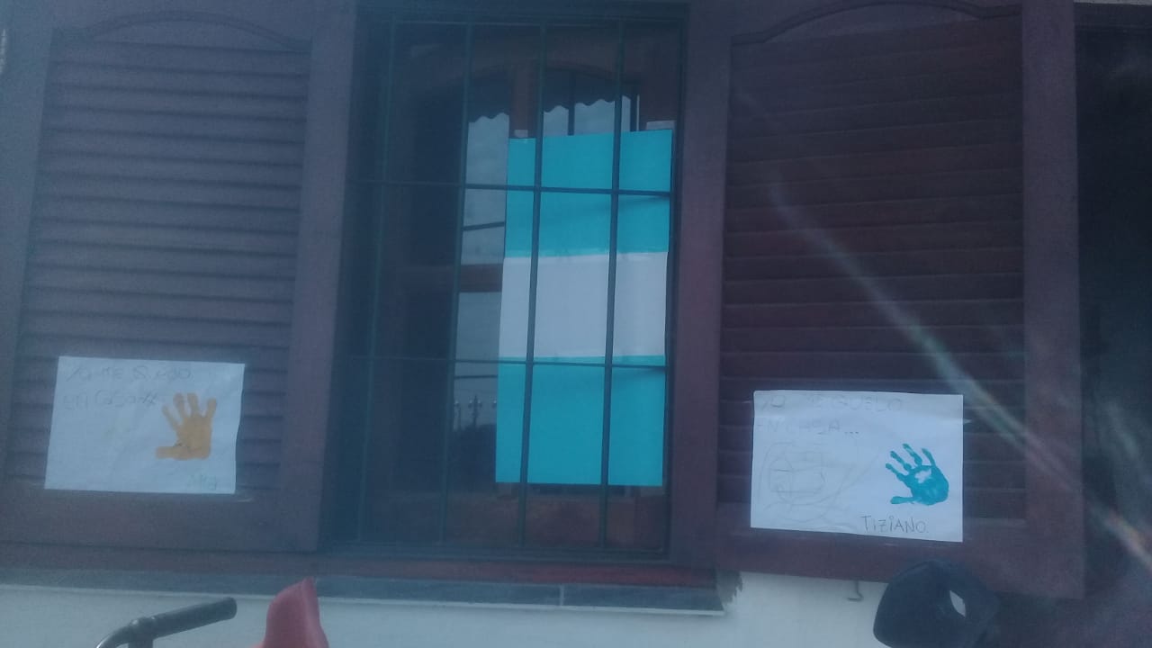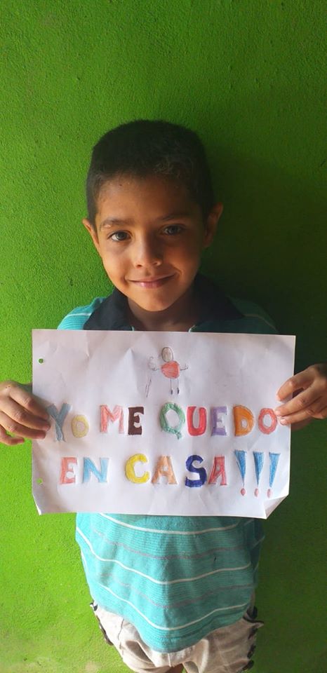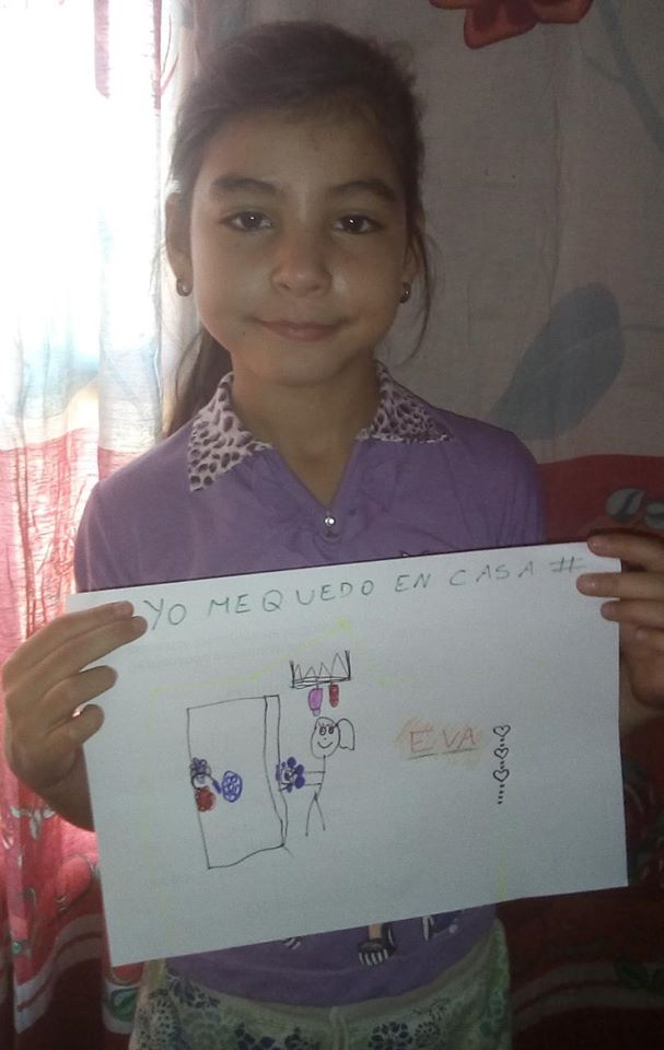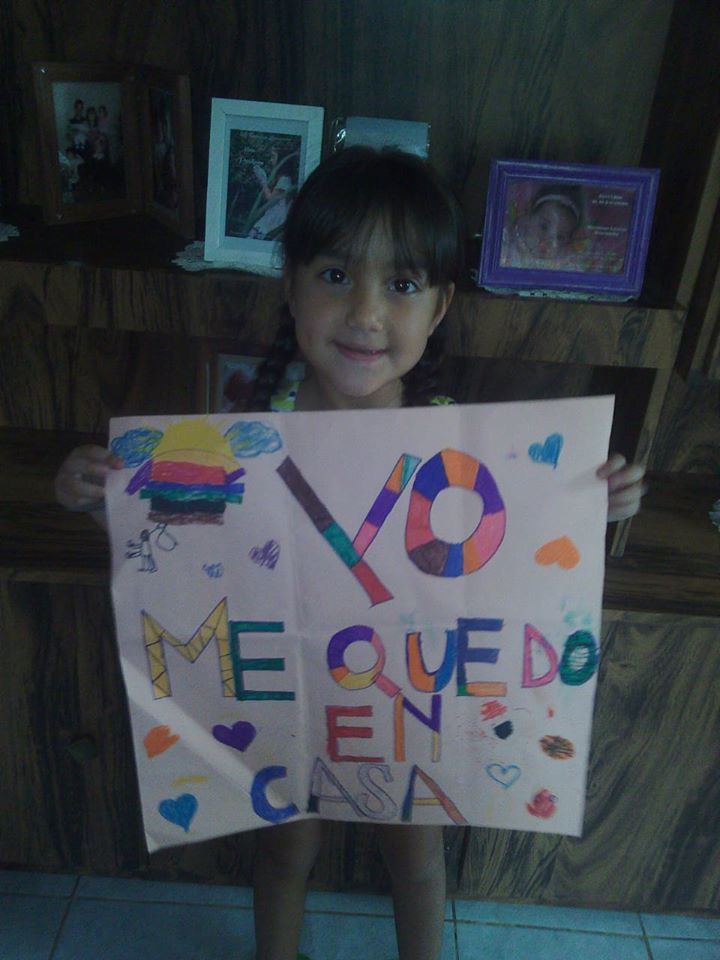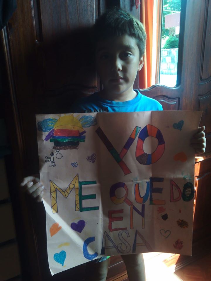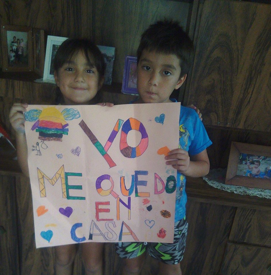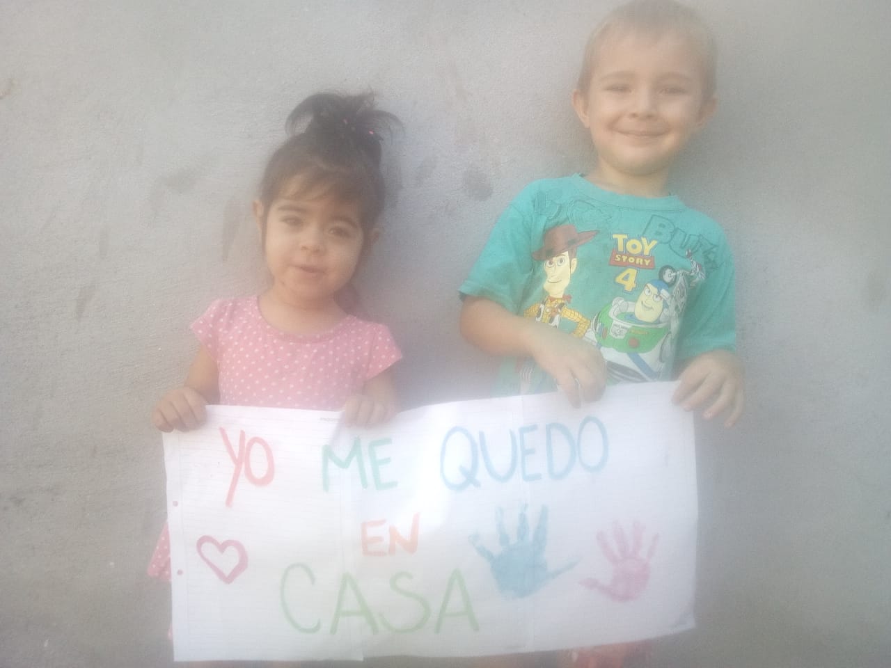 Los pequeños que asisten a la Casa del Niño, pero que por la emergencia permanecen ahora en sus hogares, elaboraron carteles con la consigna “Yo me quedo en casa” y las exhiben en el frente de sus viviendas.