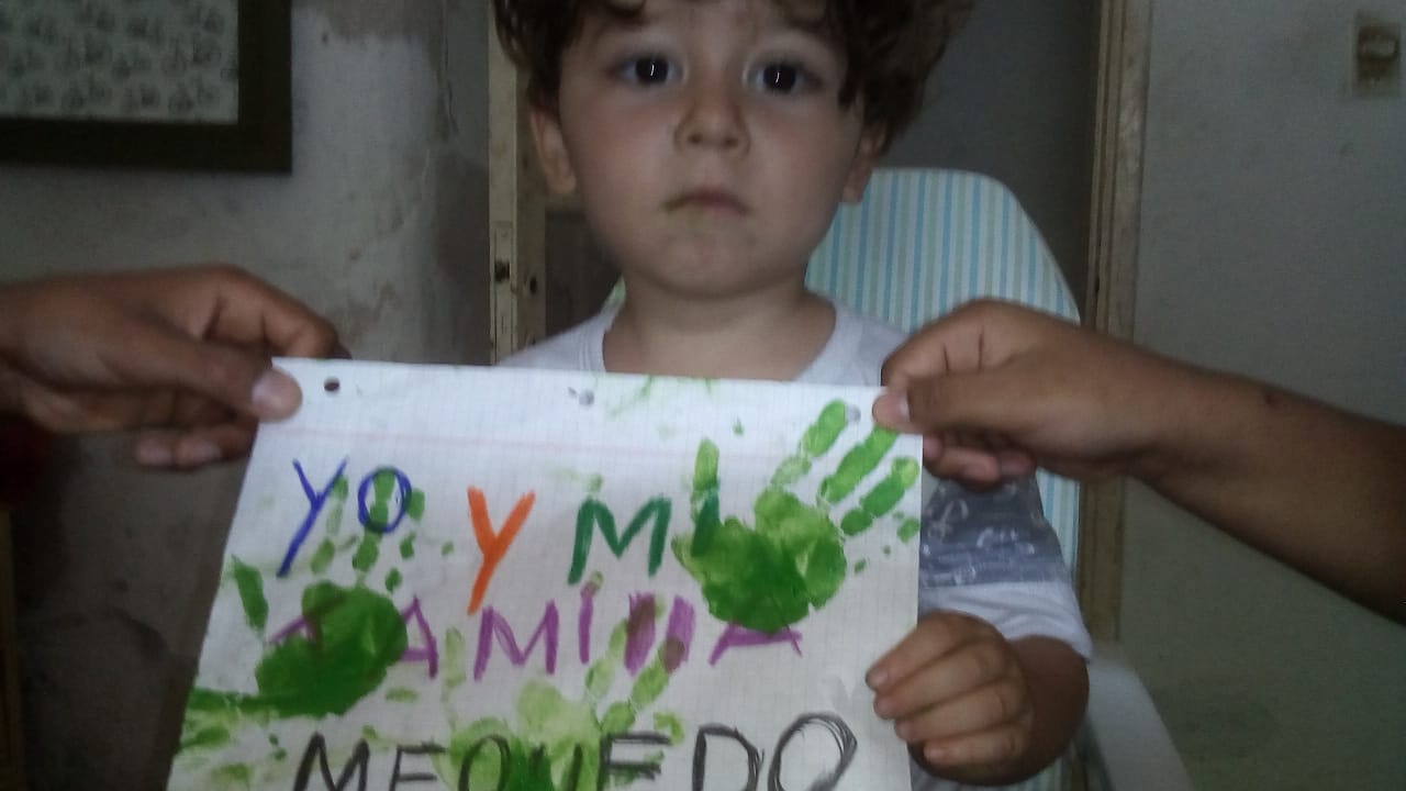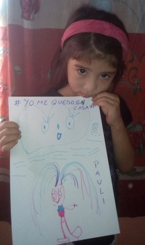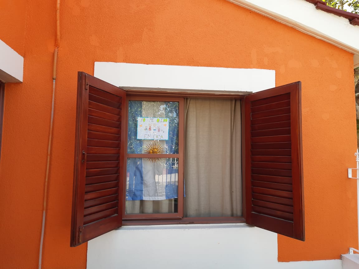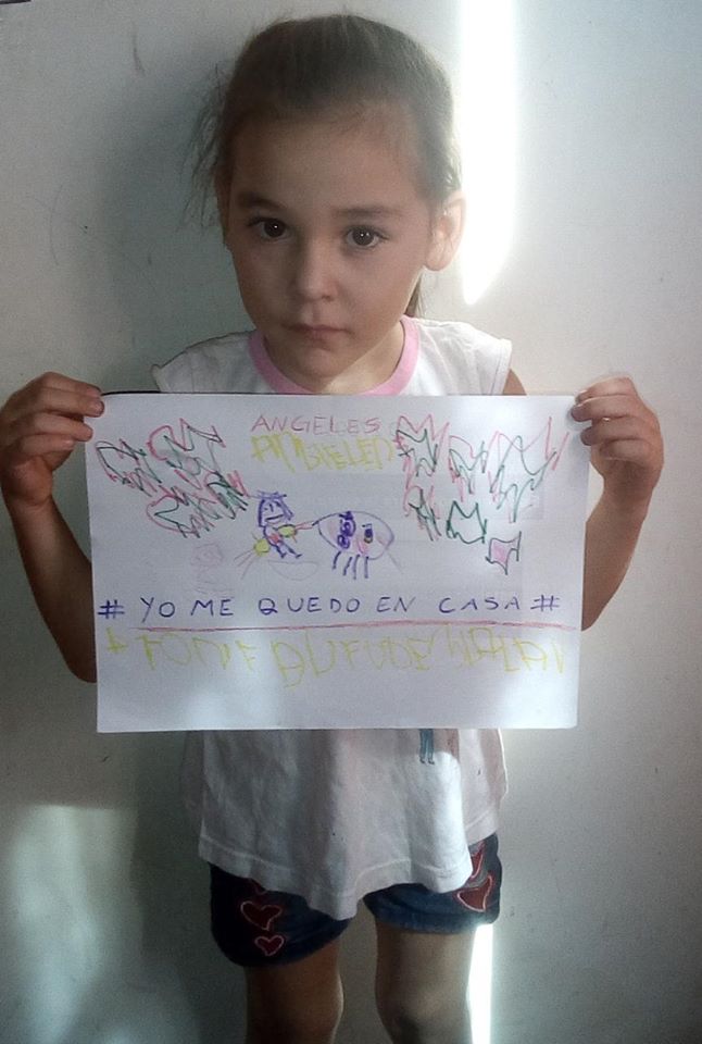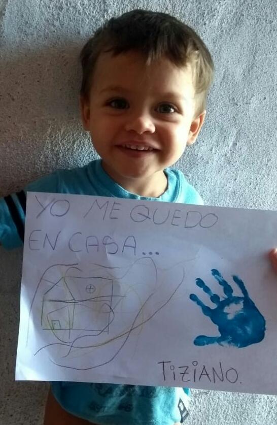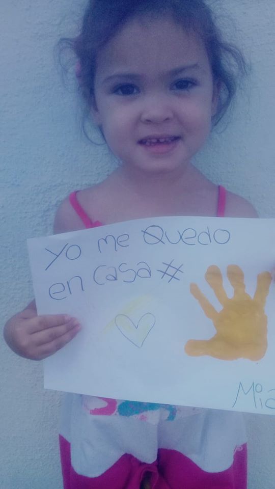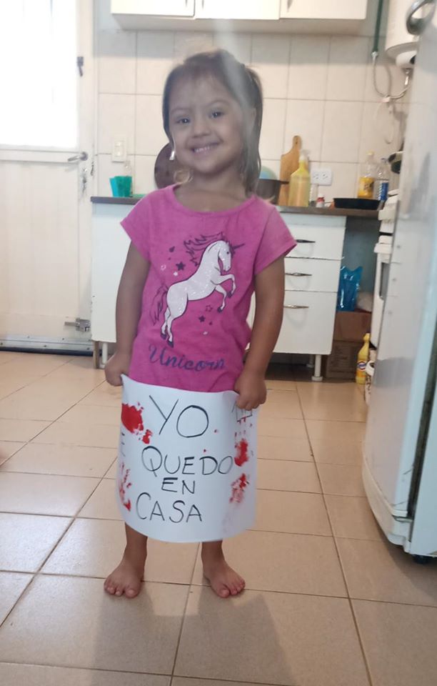 Los pequeños que asisten a la Casa del Niño, pero que por la emergencia permanecen ahora en sus hogares, elaboraron carteles con la consigna “Yo me quedo en casa” y las exhiben en el frente de sus viviendas.