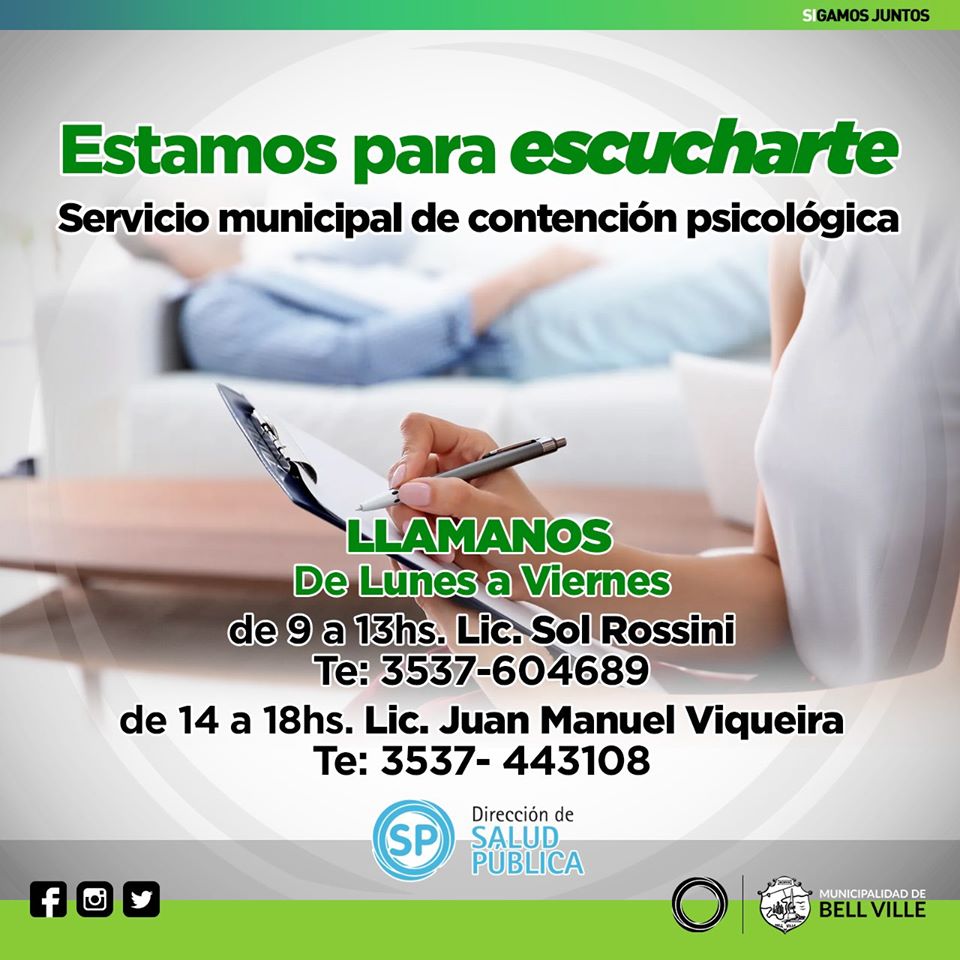 Desde el área de Psicología del municipio, se pondrán a disposición dos líneas telefónicas para recibir consultas vinculadas a situaciones de angustia, ansiedad, síntomas depresivos, etc., relacionados a la cuarentena obligatoria que rige para nuestro país debido a la pandemia de Covid-19.