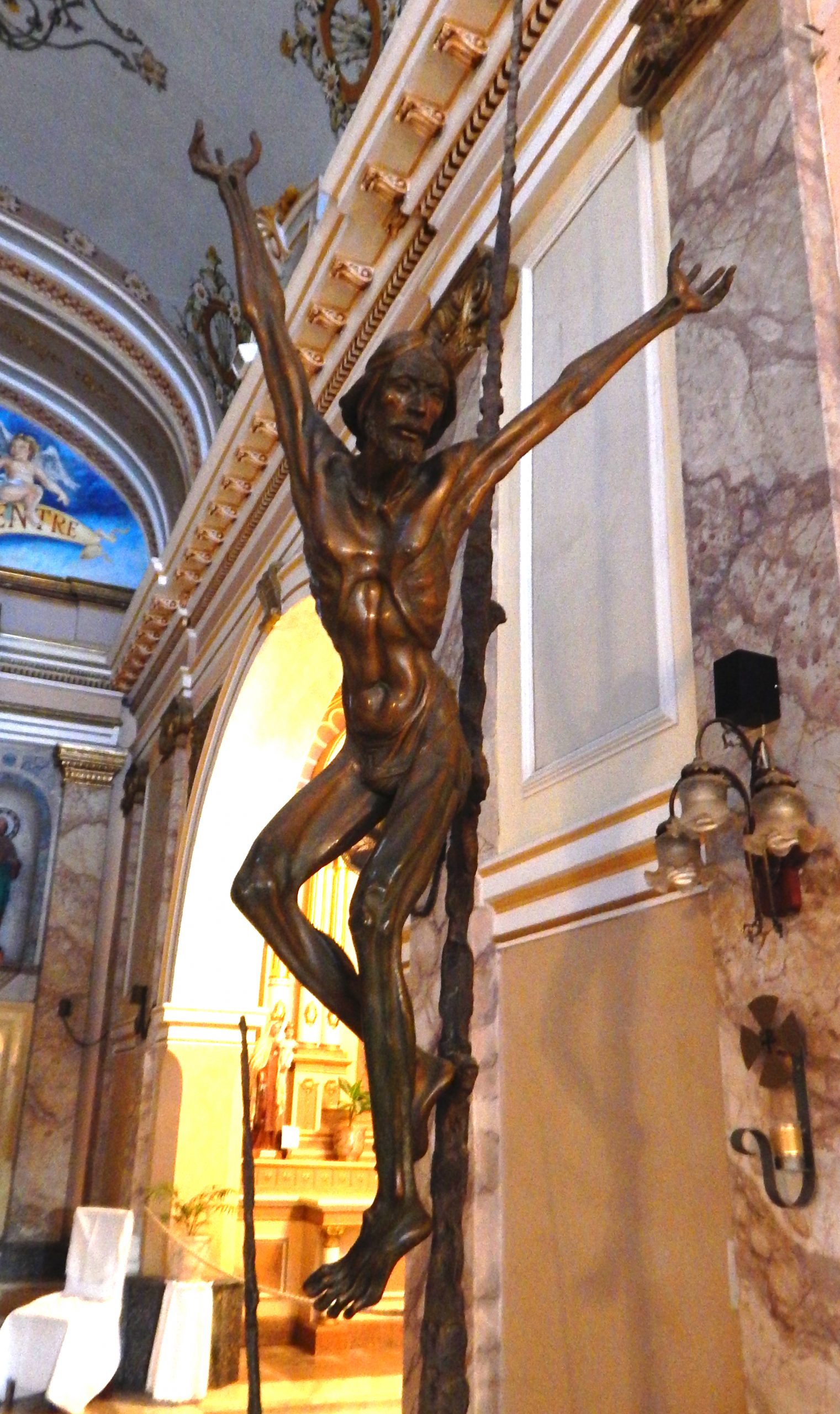 La obra de 3,8 metros de alto es fuertemente expresionista y consta de una cruz insinuada en la que un Cristo crucificado asemeja flotar en el aire con los brazos extendidos, reflejando ofrecimiento y acogimiento.
