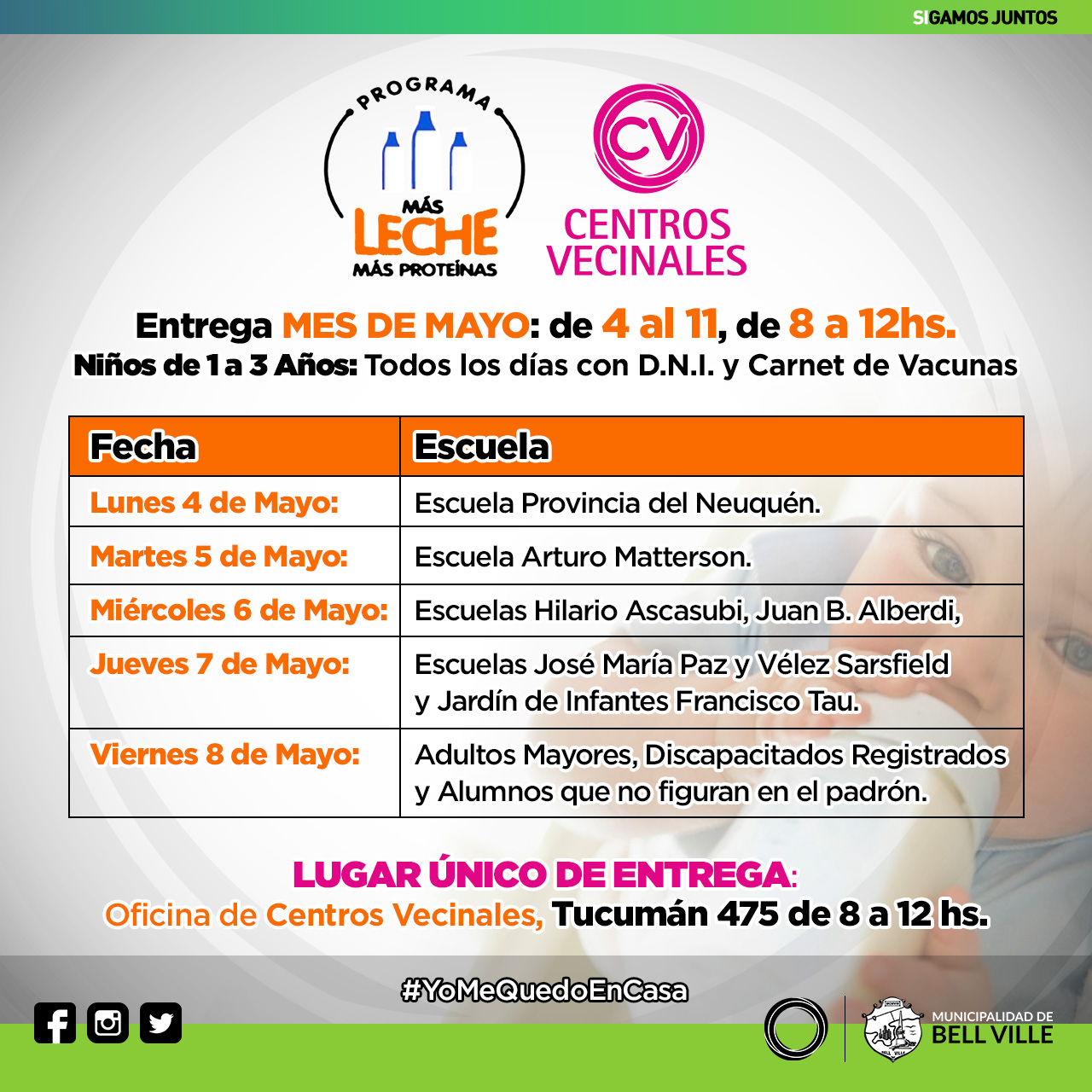 Únicamente en la oficina de Centros Vecinales de Tucumán 467, salones externos del SUM Municipal, comenzará la distribución de la lecha del programa provincial “Más leche más proteínas”.