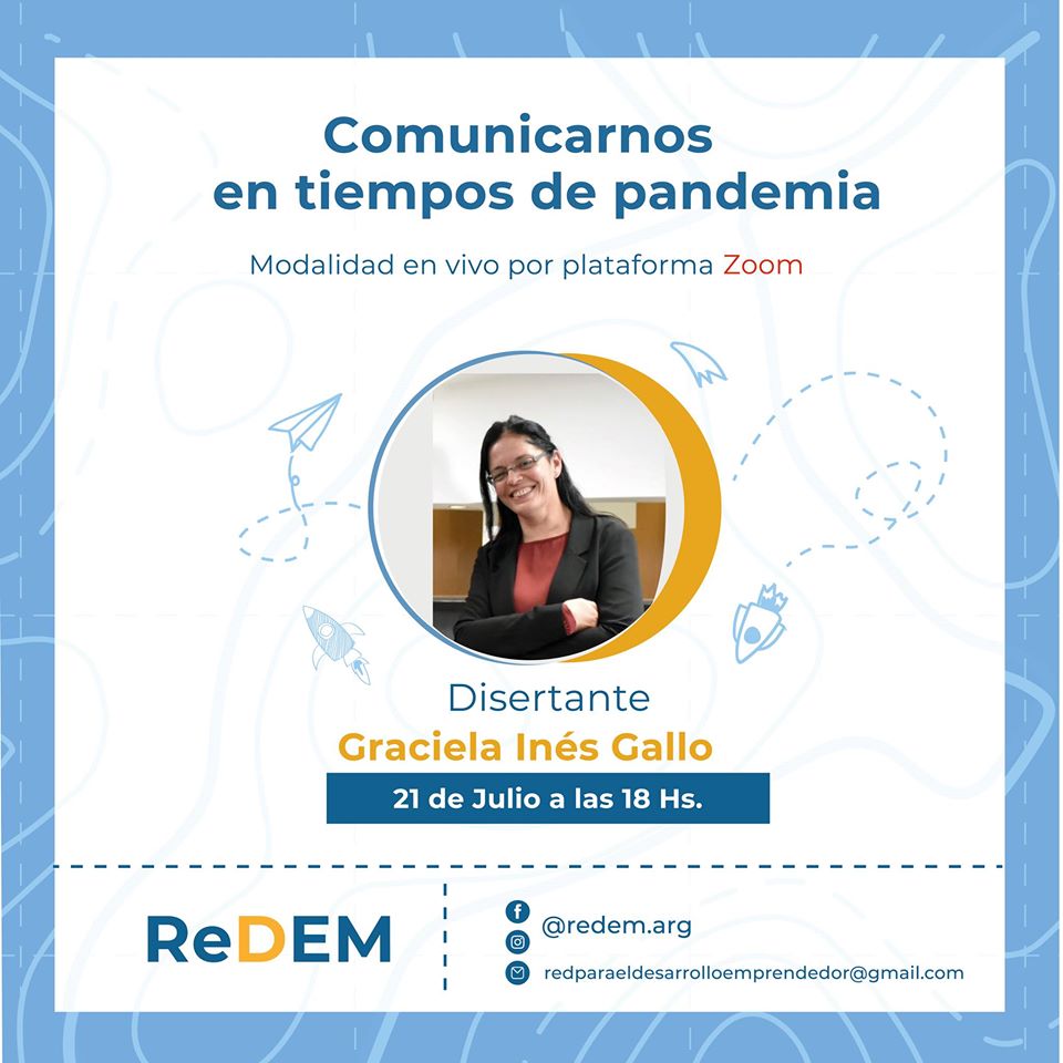 Esta tarde a las 18:00 por plataforma Zoom y en vivo, se brindará una nueva capacitación para emprendedores. En esta oportunidad, Graciela Inés Gallo, directora del Centro de Emprendedores; titular de la cátedra de Administración Hotelera en la Escuela Argentina de Negocios y docente de la Universidad de Buenos Aires (Turismo Rural), se referirá a “Comunicaciones en tiempos de pandemia”.