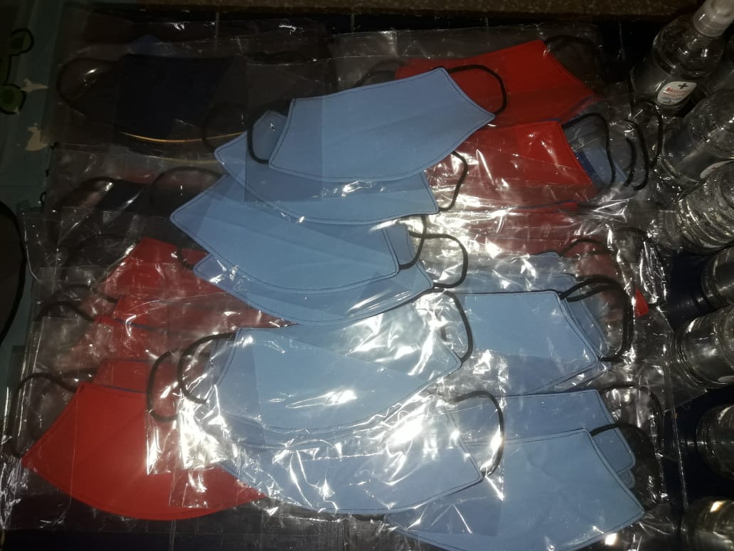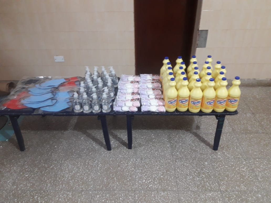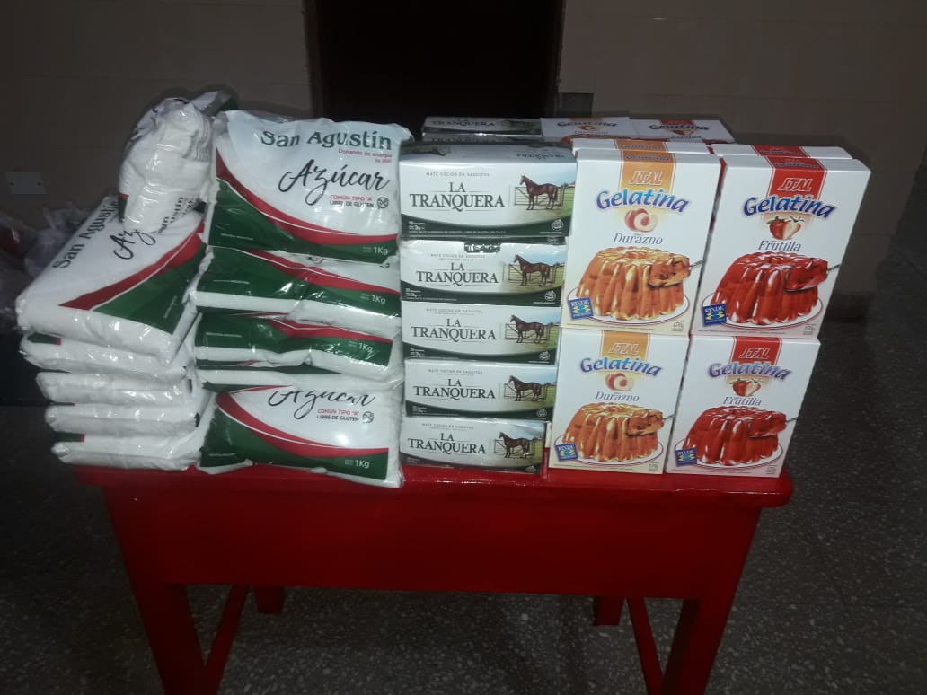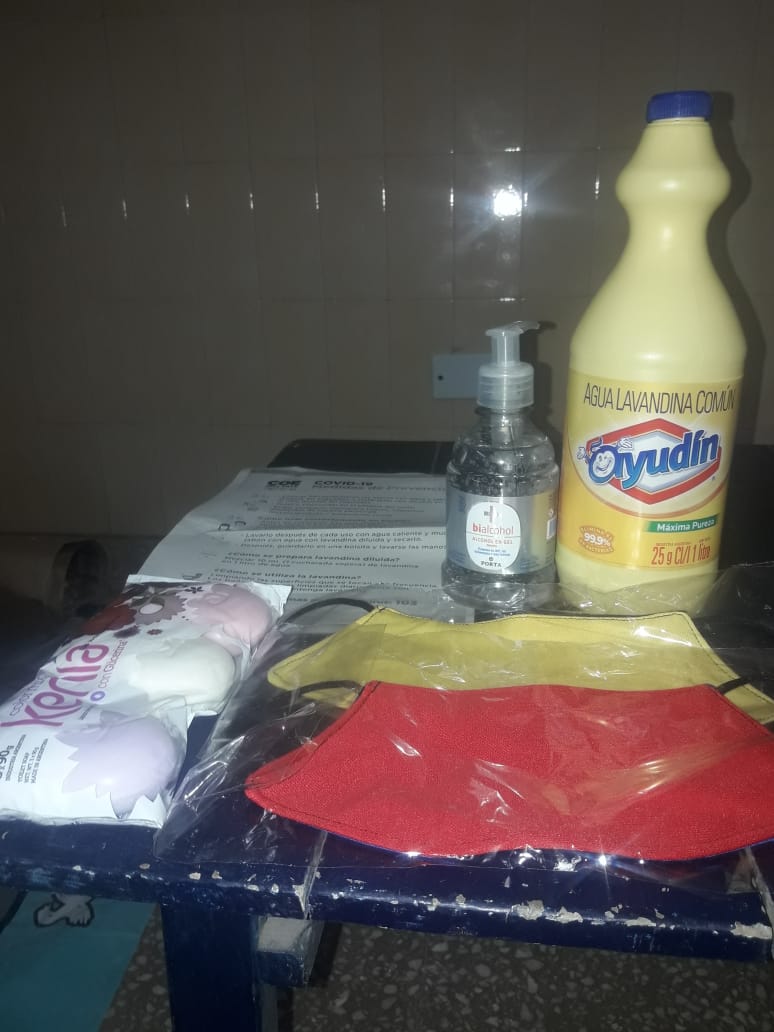 El módulo contiene lavandina, alcohol en gel, una tira con 3 jabones y dos barbijos para niños,  más una caja de mate cocido, 1 kg. de azúcar y una caja de leche.