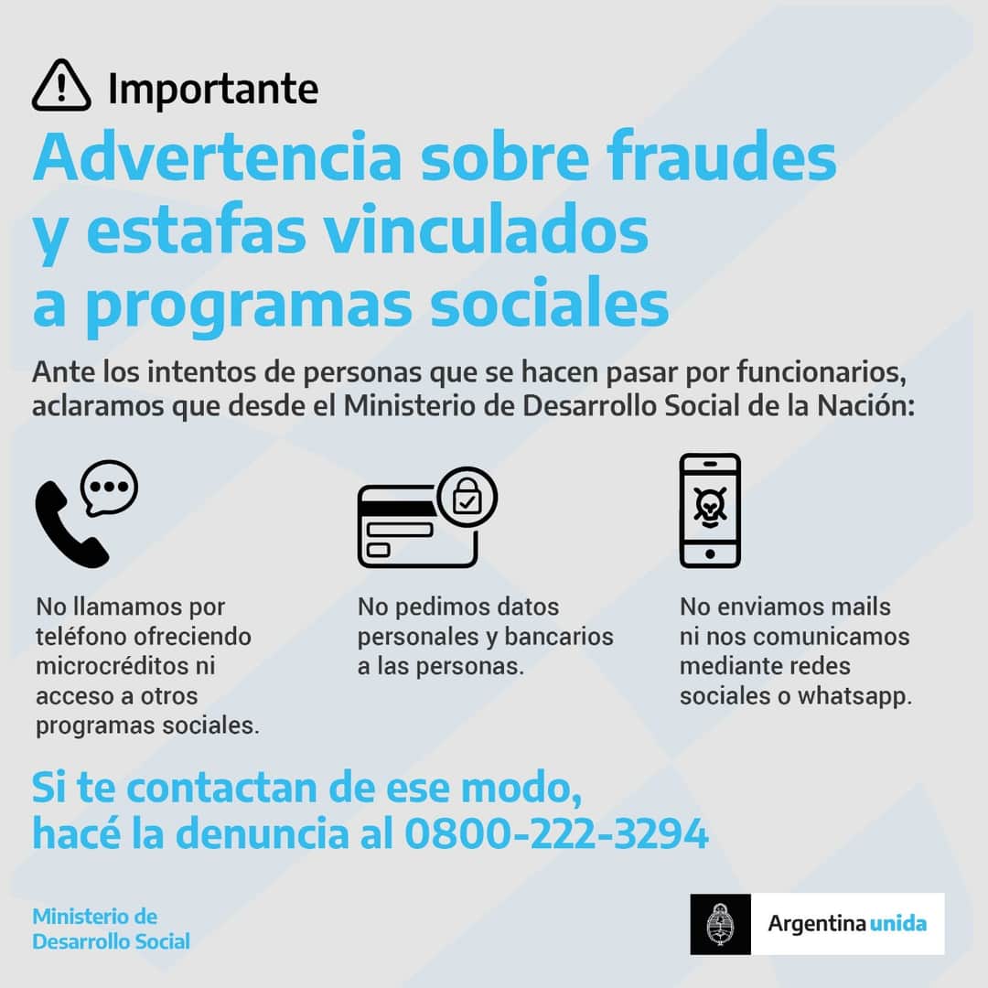 Ante reiteradas consultas realizadas en la Dirección de Acción Social, se informa que personas inescrupulosas intentan engañar y estafar a personas que están inscriptas o en trámite de inscripción de programas sociales que provienen desde Nación.