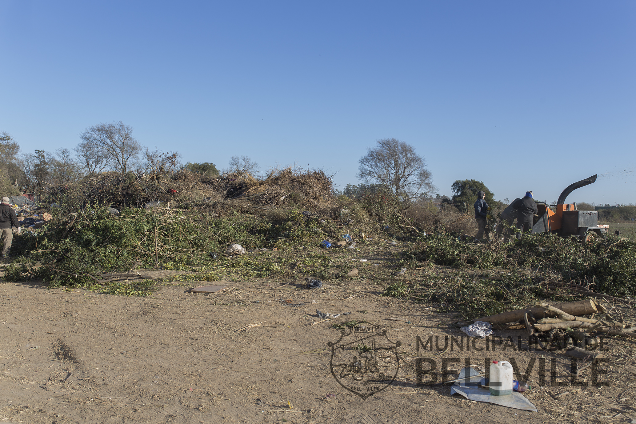 Empleados municipales están afectados al triturado de los restos de poda en la Planta de Separación de Residuos Reciclables de calle Chubut.