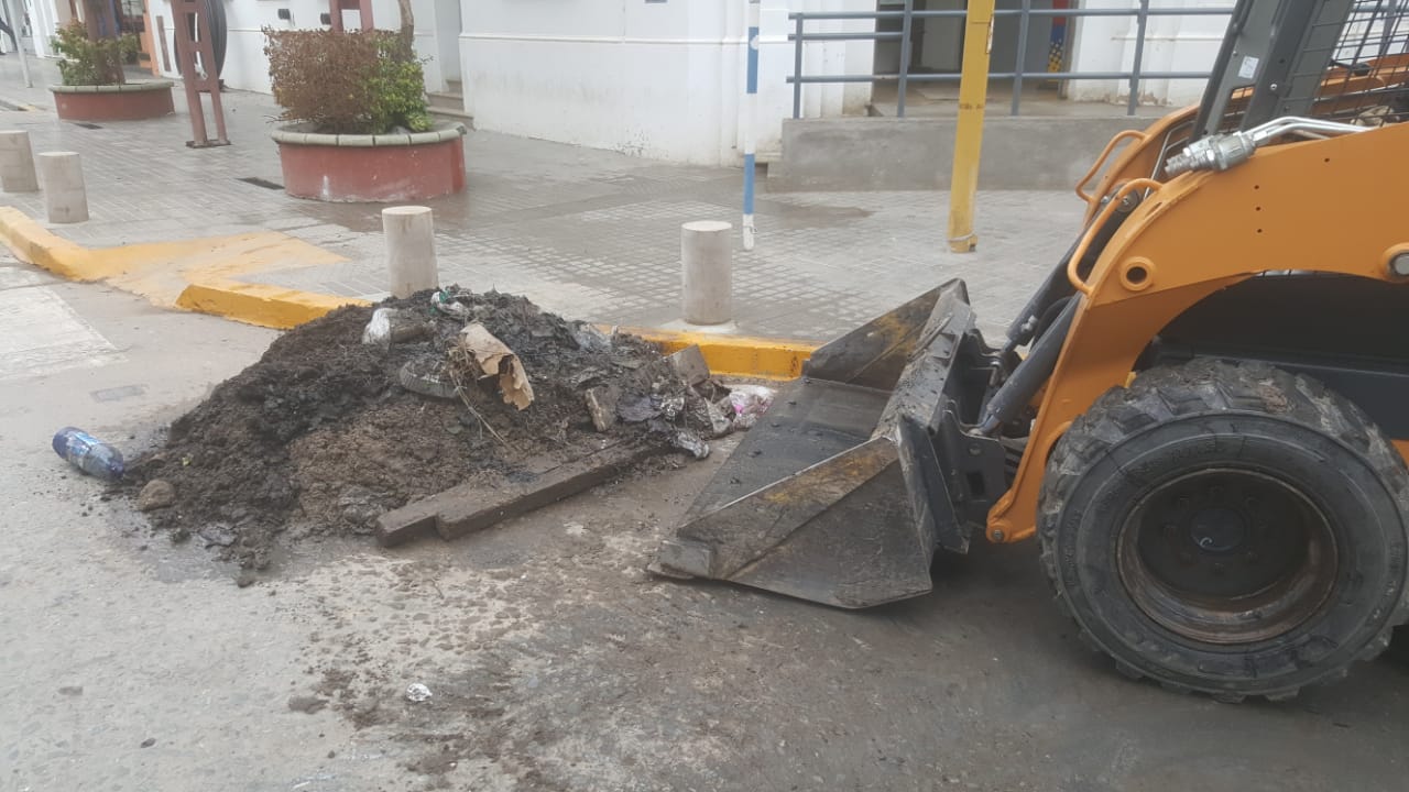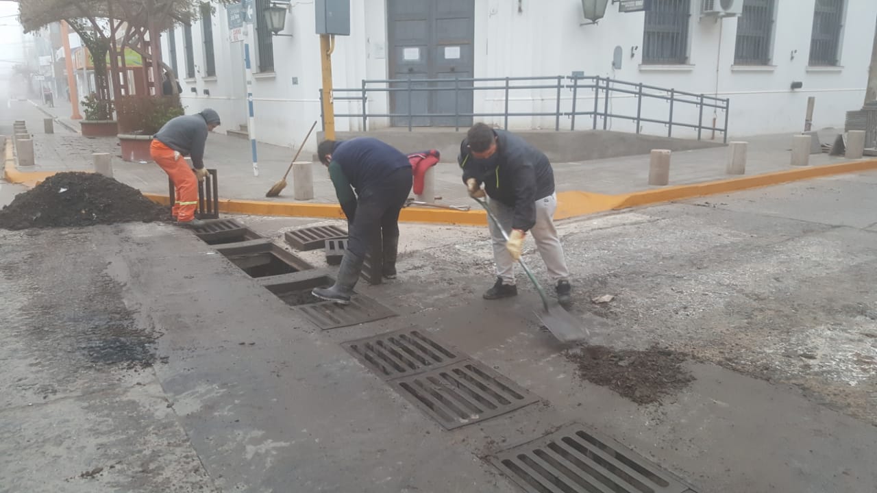 Se cumplió esta mañana la limpieza de las bocas de tormenta de calles Córdoba y Belgrano, removiéndose para ello las pesadas rejillas existentes en el sector.