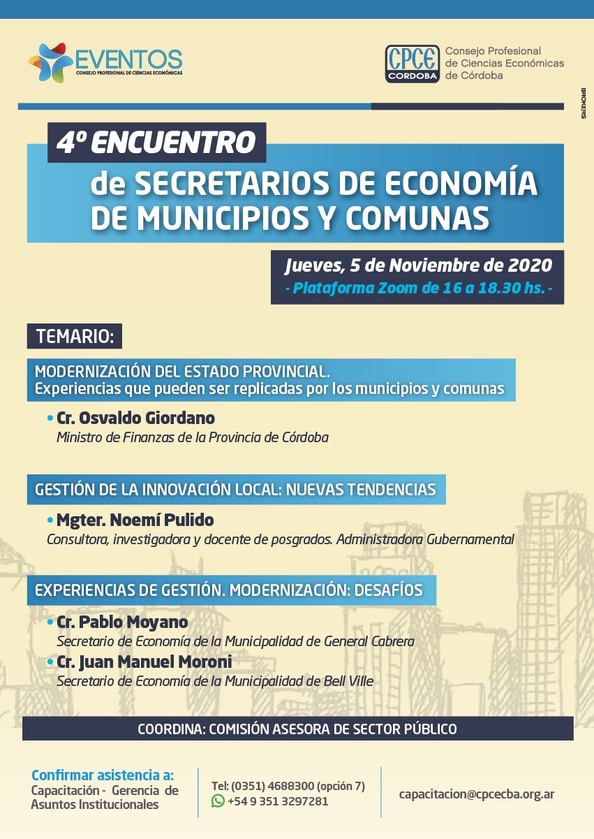 Este jueves, de 16:00 a 18:30, vía plataforma Zoom, se desarrollará el 4º Encuentro de Secretarios de Economía de Municipios y Comunas, organizado por el Consejo Profesional de Ciencias Económicas.