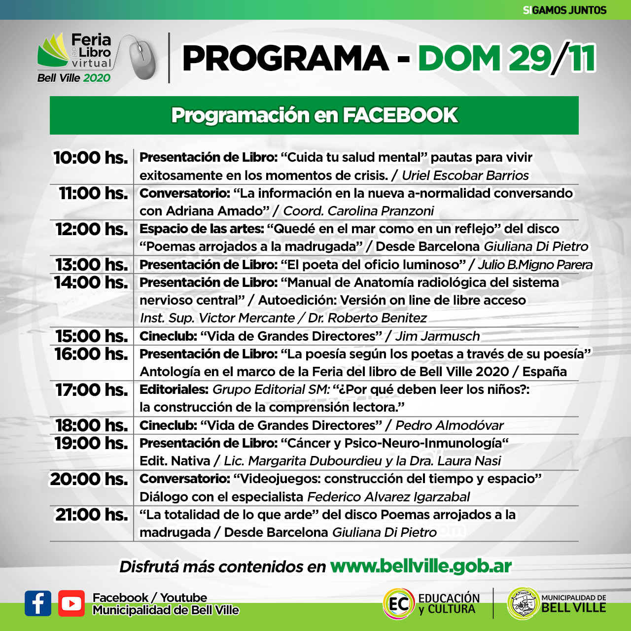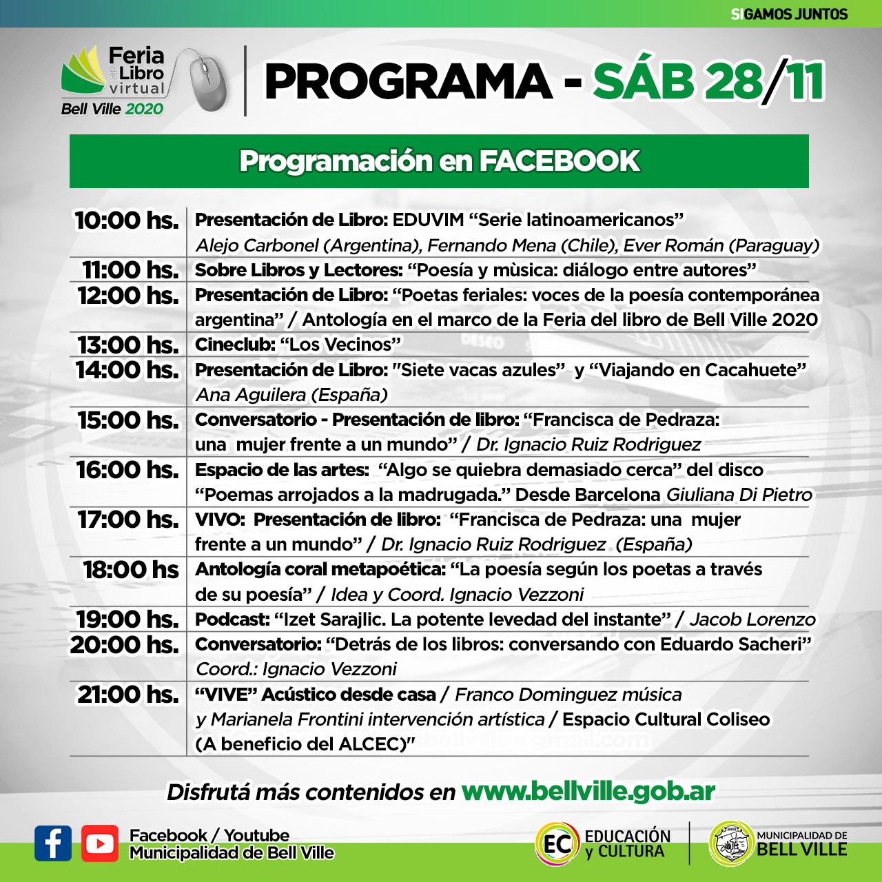 El resto de la programación diaria en Facebook municipal, incluye diez presentaciones diversas, entre las 11:00 y las 21:00.
