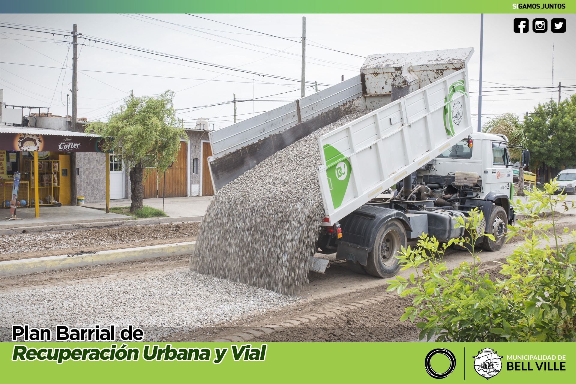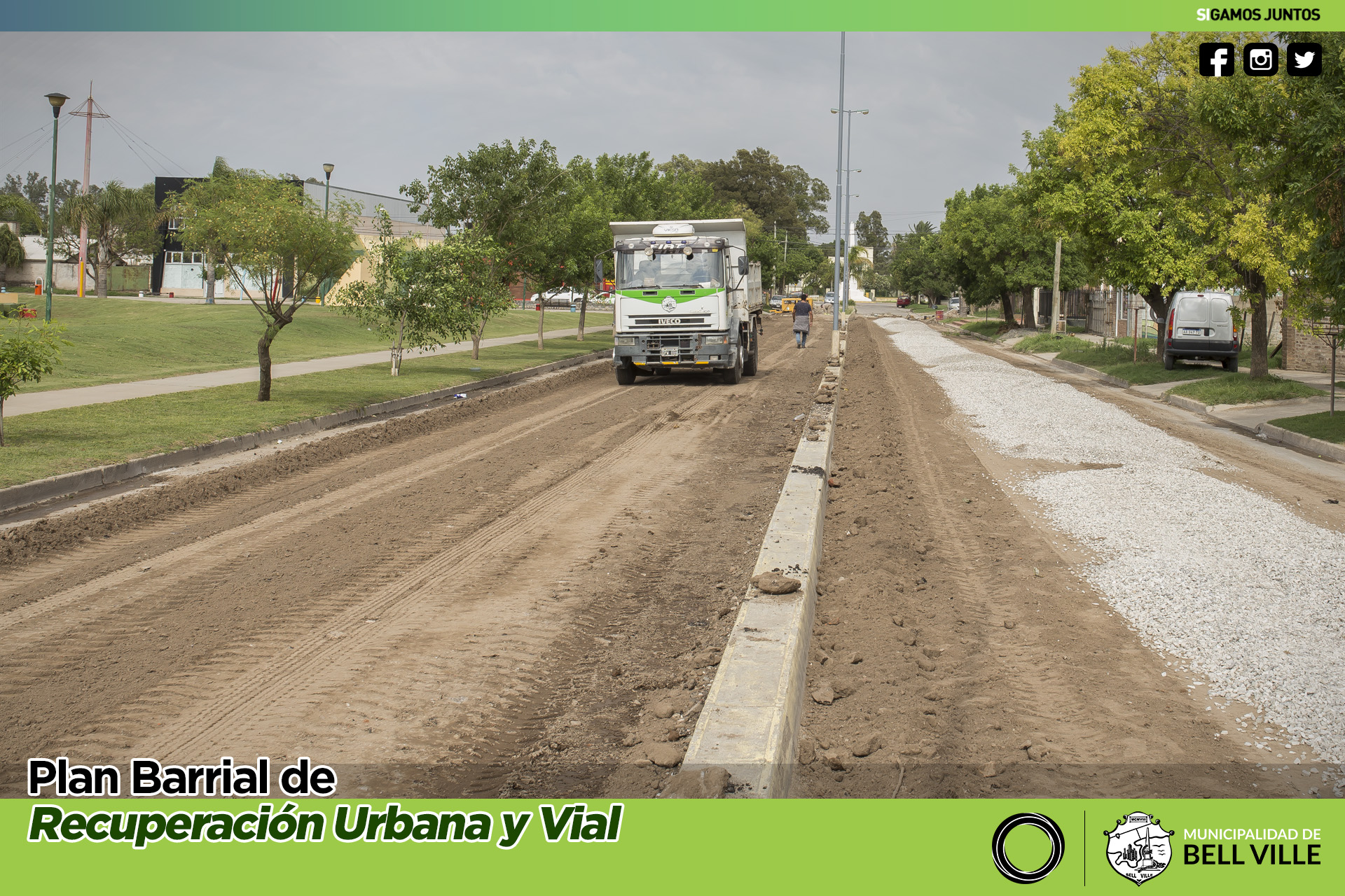 Se está procediendo al mejoramiento de bulevar Eva Perón, entre Lamadrid y Mármol, con el compacto de su base y la incorporación de áridos y piedra triturada 6-19.