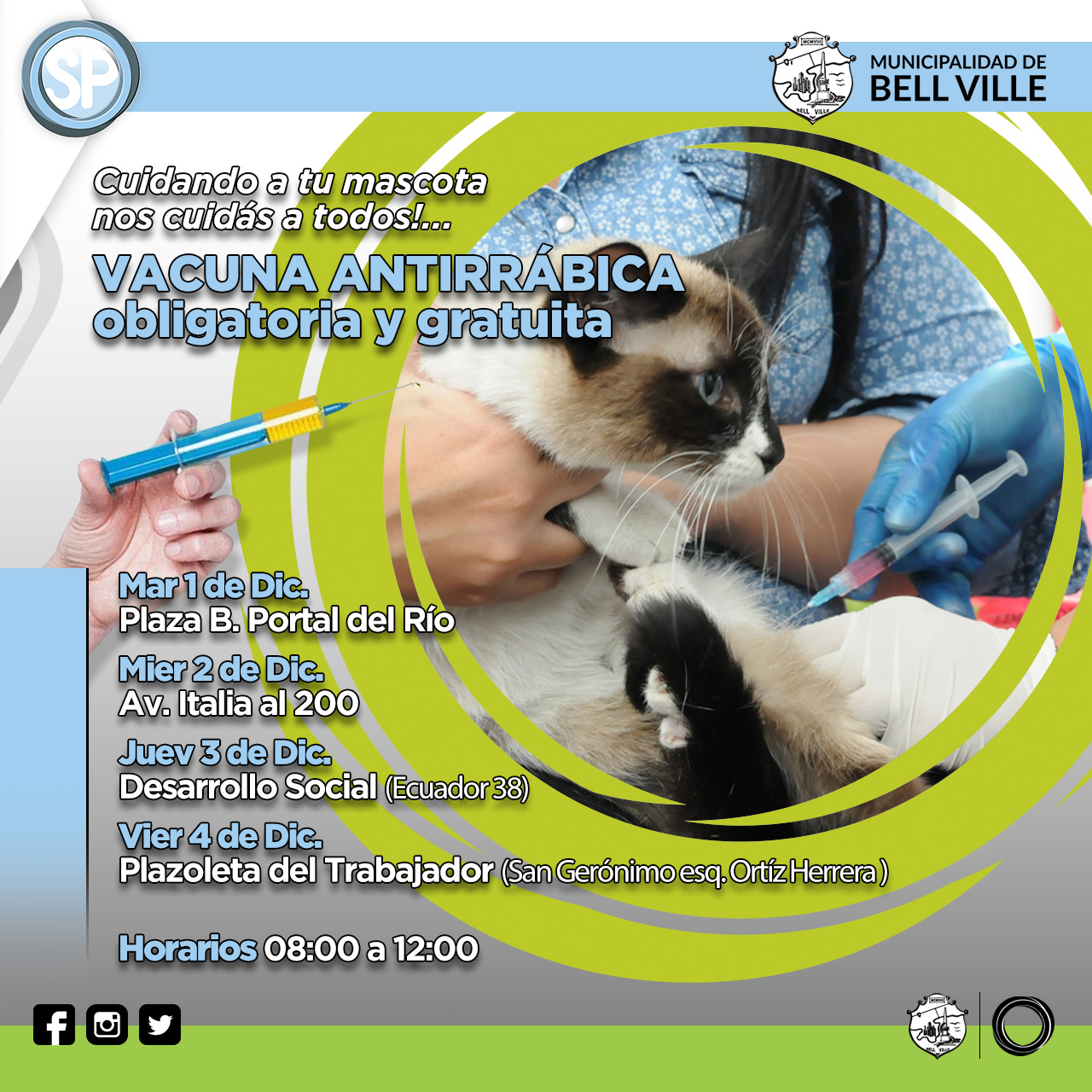 En el horario de 08:00 a 12:00, personal del Centro Municipal de Salud Animal prosigue con la campaña obligatoria y gratuita de vacunación antirrábica de perros y mascotas, la que se extenderá a lo largo de todo el mes de diciembre, recorriendo diferentes puntos de la ciudad.