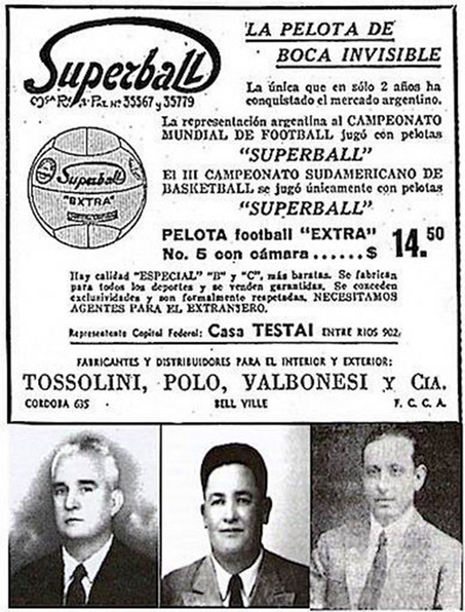 El 6 de enero de 1934, a tres años del invento, los tres fabricantes de “La Superball”, se hacen presentes en el Torneo Argentino de Básquet, realizado en Córdoba capital, portando dos pelotas de su fabricación, para ser probadas en los encuentros de ese importante certamen. La aceptación fue unánime, principalmente de parte de los jugadores de las provincias intervinientes. A su vez, la prensa especializada la consideró como “la vedete del torneo”.