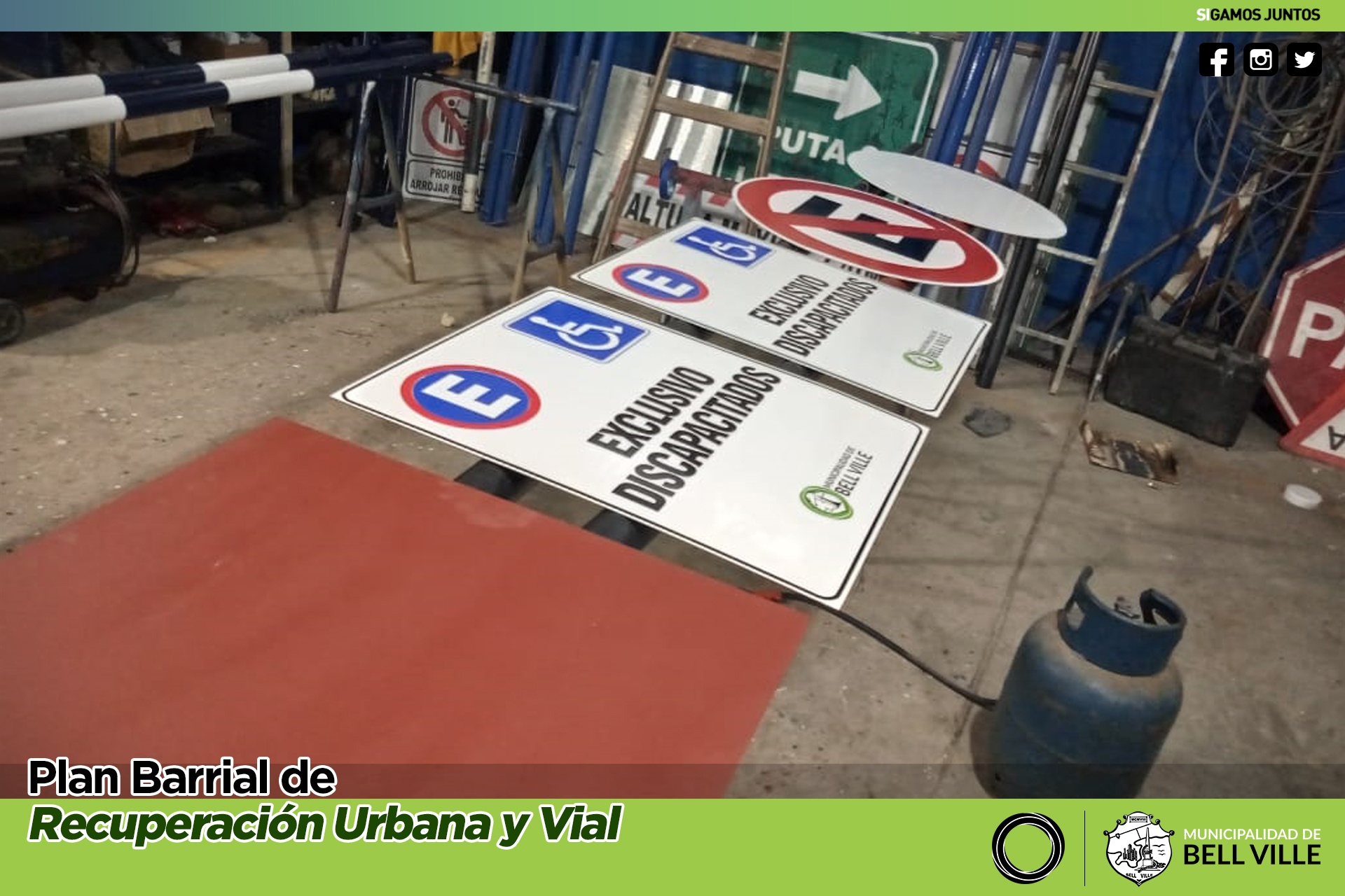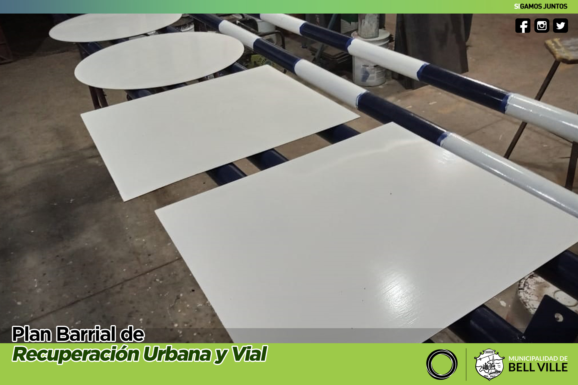 En el Taller Vial de la Municipalidad, prosigue la construcción de señales viales verticales y pintado de las horizontales, con el fin de habilitar espacios exclusivos para discapacitados, motos, bicicletas, carga y descarga de mercadería y para estacionamiento en general.